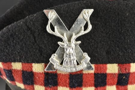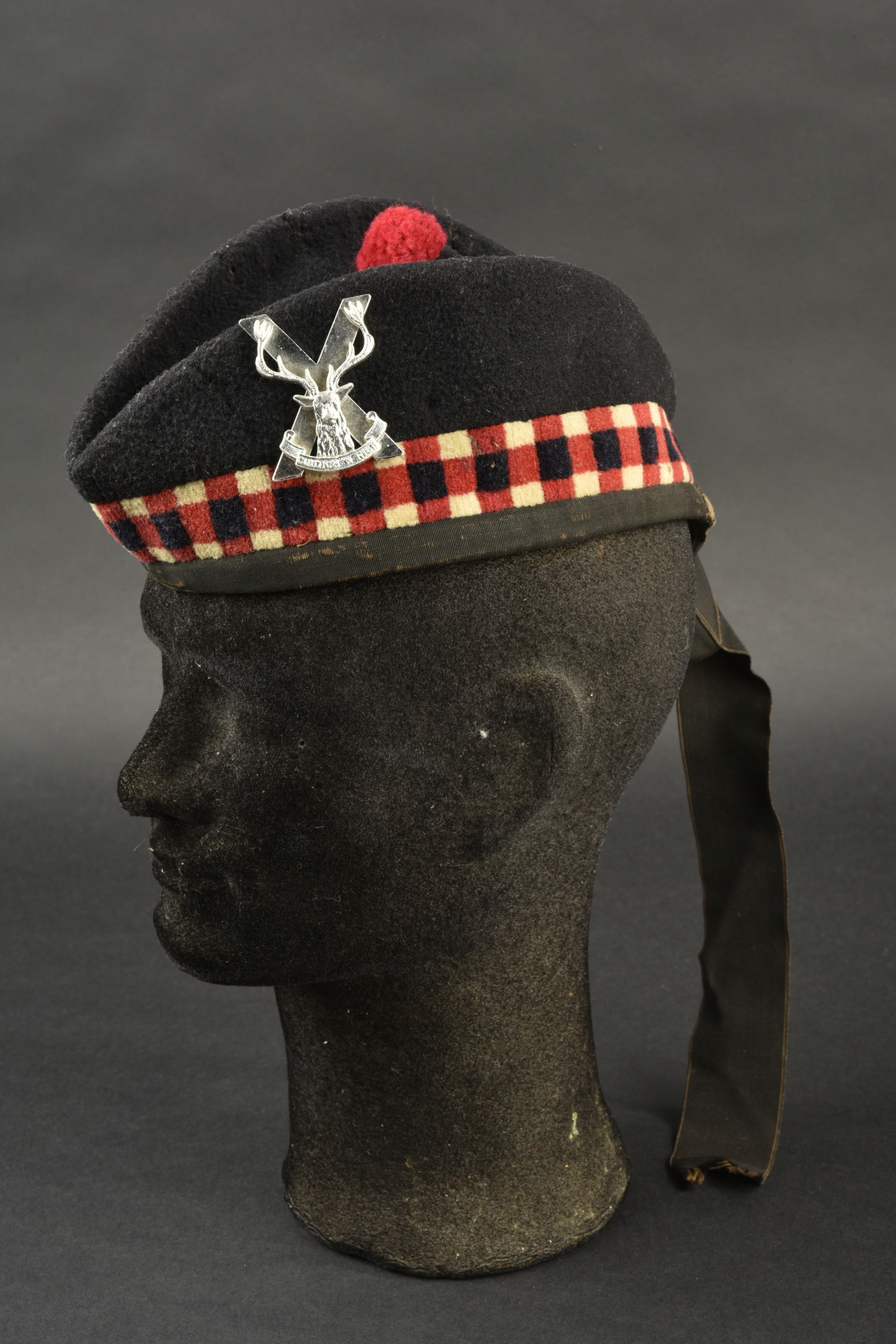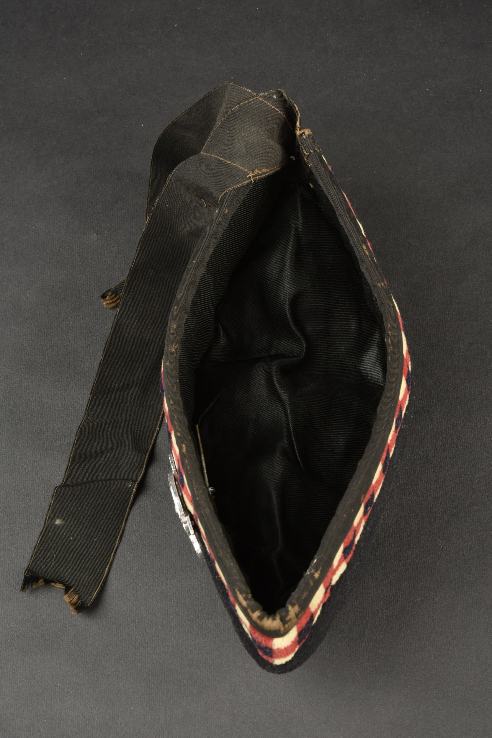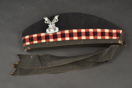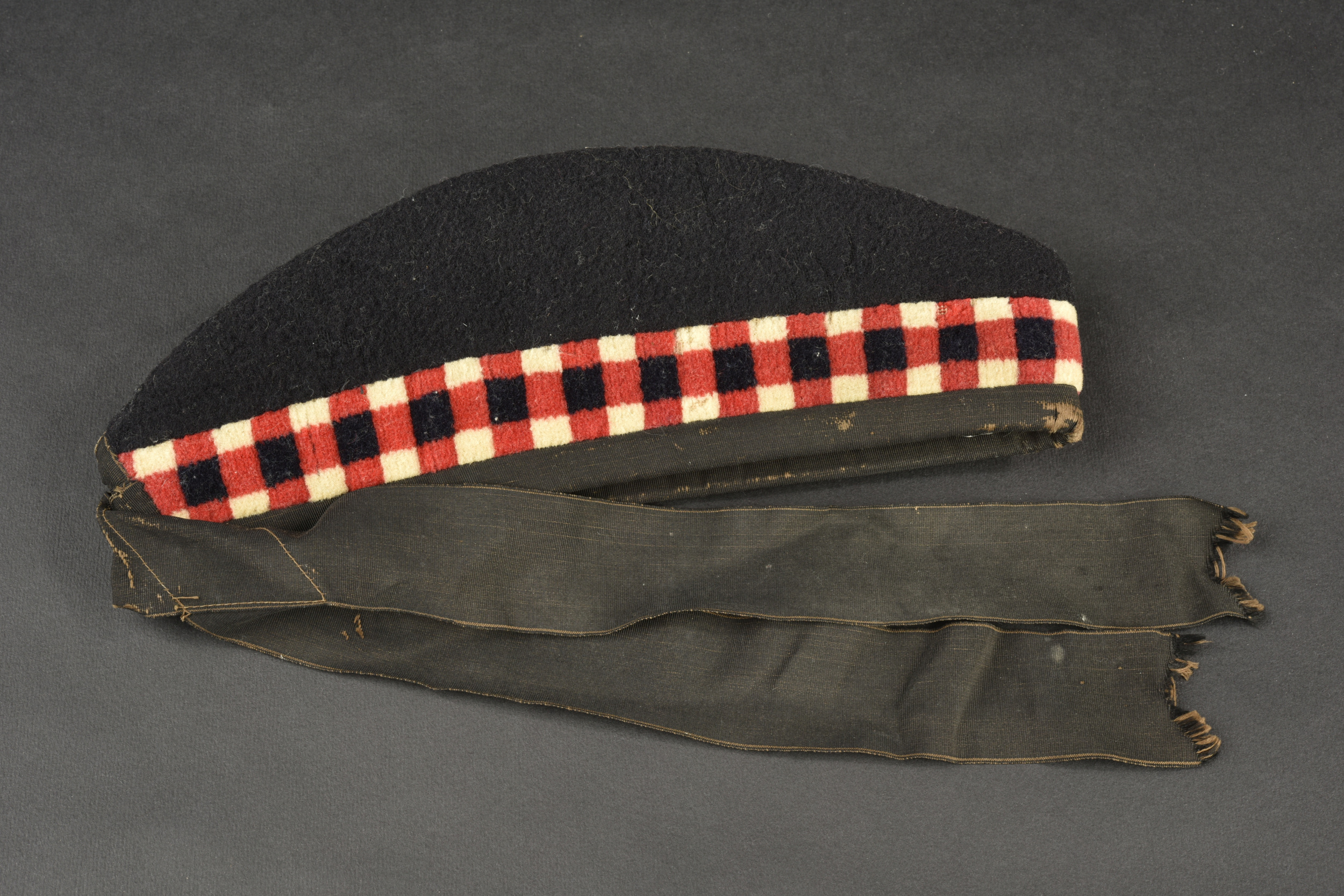 Glengarry. En tissu laineux noir. Damier noir/blanc/rouge. Reproduction d’un cap badge. Les cordons sont effilochés. Pompon rouge complet. Intérieur doublé en satinette noire. Sans marquages visibles. A noter une certaine usure et patine de la pièce, ainsi que des traces de mite. Etat II+.