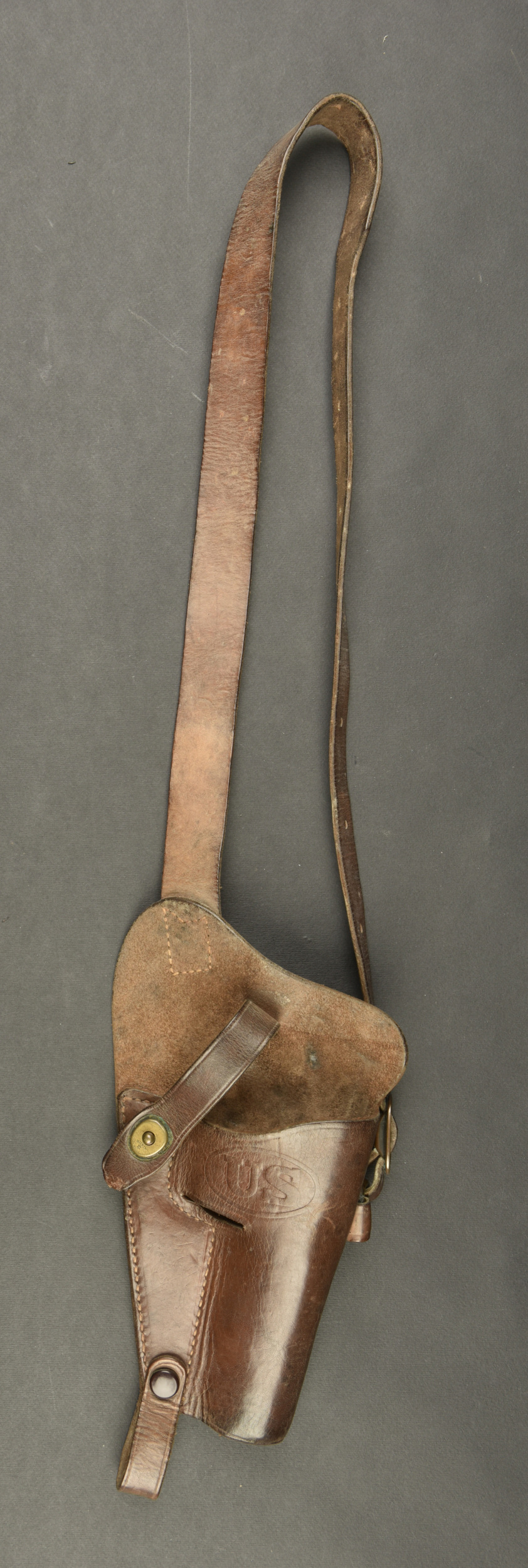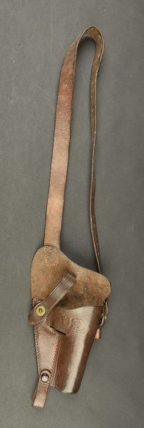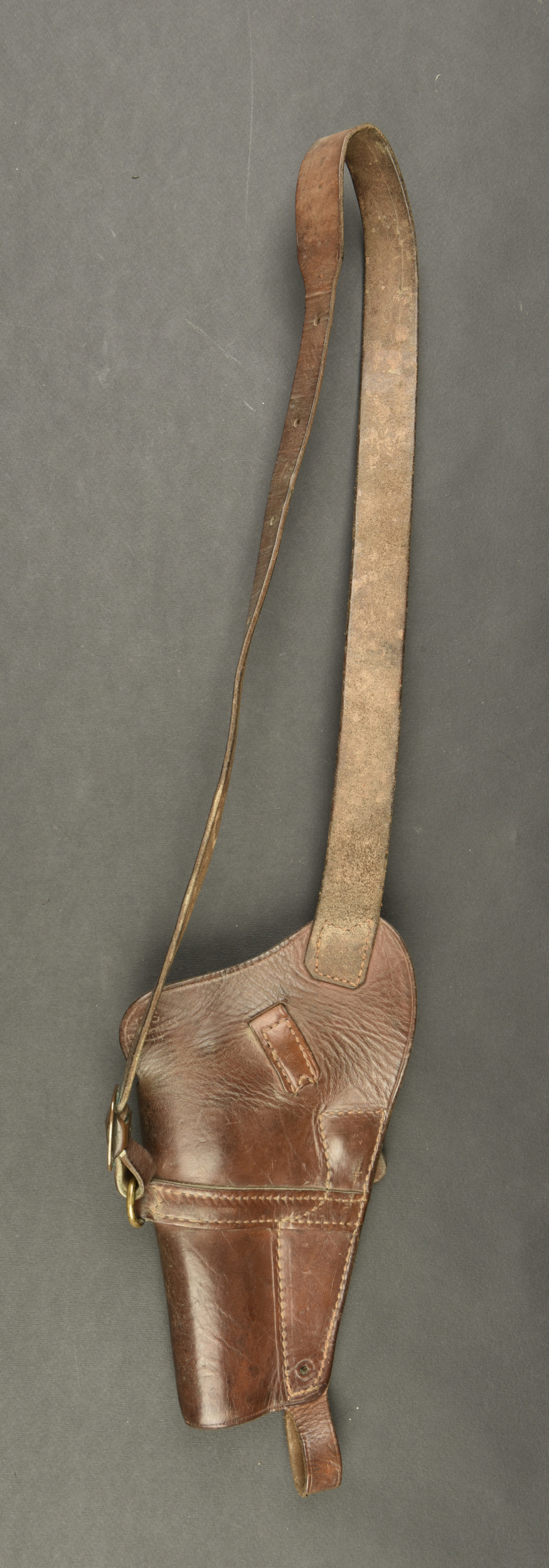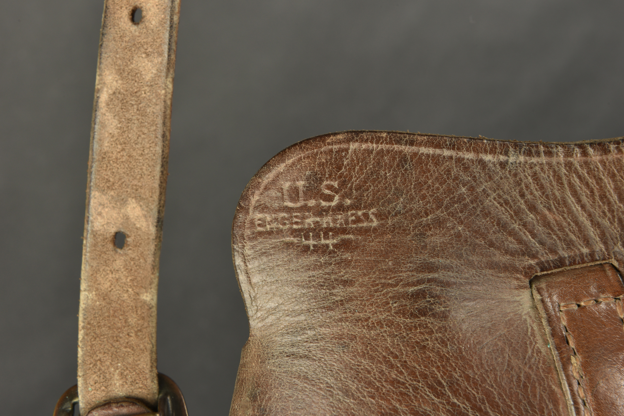 Holster de poitrine pour Colt 45. En épais cuir marron. La sangle est présente. Les boutons pressions sont fonctionnels. Beau marquages US sur la face avant. Fabrication US Enger Kress 1944. A noter une certaine usure et patine de la pièce. Etat II+.
