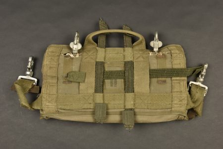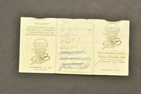 Housse de parachute ventral T-7. Housse en forte toile OD, Vide. Poignée de transport en toile complète. Les élastiques sont présents mais postérieurs. Les crochets de fixation au harnais sont complets et fonctionnels. Livret présent, marquages Rinder’s Parachute Loft Los Angeles Normandy +-0905. Nombreux sauts dans les années 60. Les boutons pressions sont fonctionnels. Indication nominative Colins. Marquages Type T-7 parachute Standart Parachute Corps San Diego California. 24 FT Part NO 44-J107743, date of MFG Aug 1945. A noter une certaine usure et patine de la pièce, ainsi que des tâches. Etat II+.
