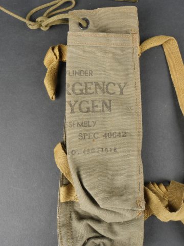 Housse pour bouteille d’oxygène. En forte toile Kaki. Modèle H-2. Toutes les sangles sont présentes. Marquages Cylinder Emergency Oxygen Assembly Type H-2 Spec 4064. Neuve de stock. Etat I-.