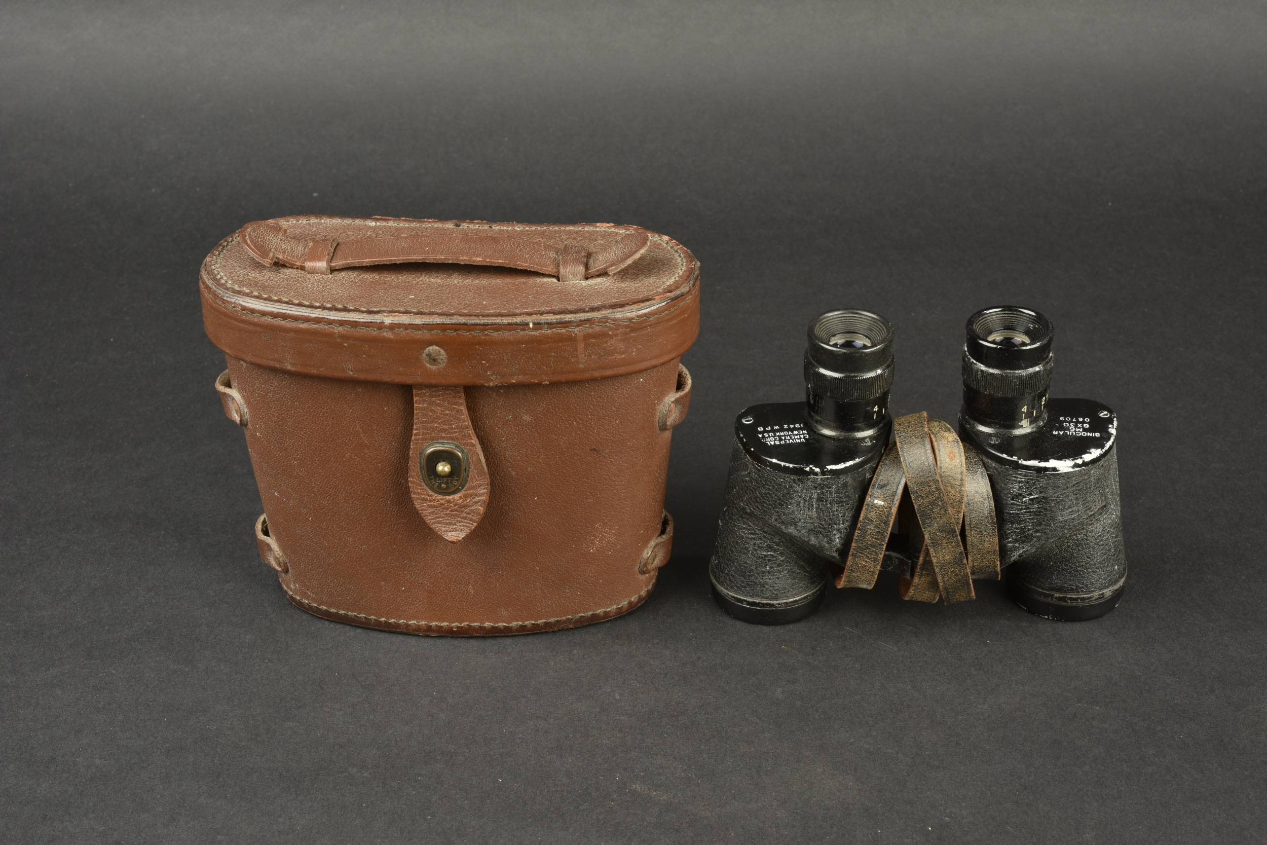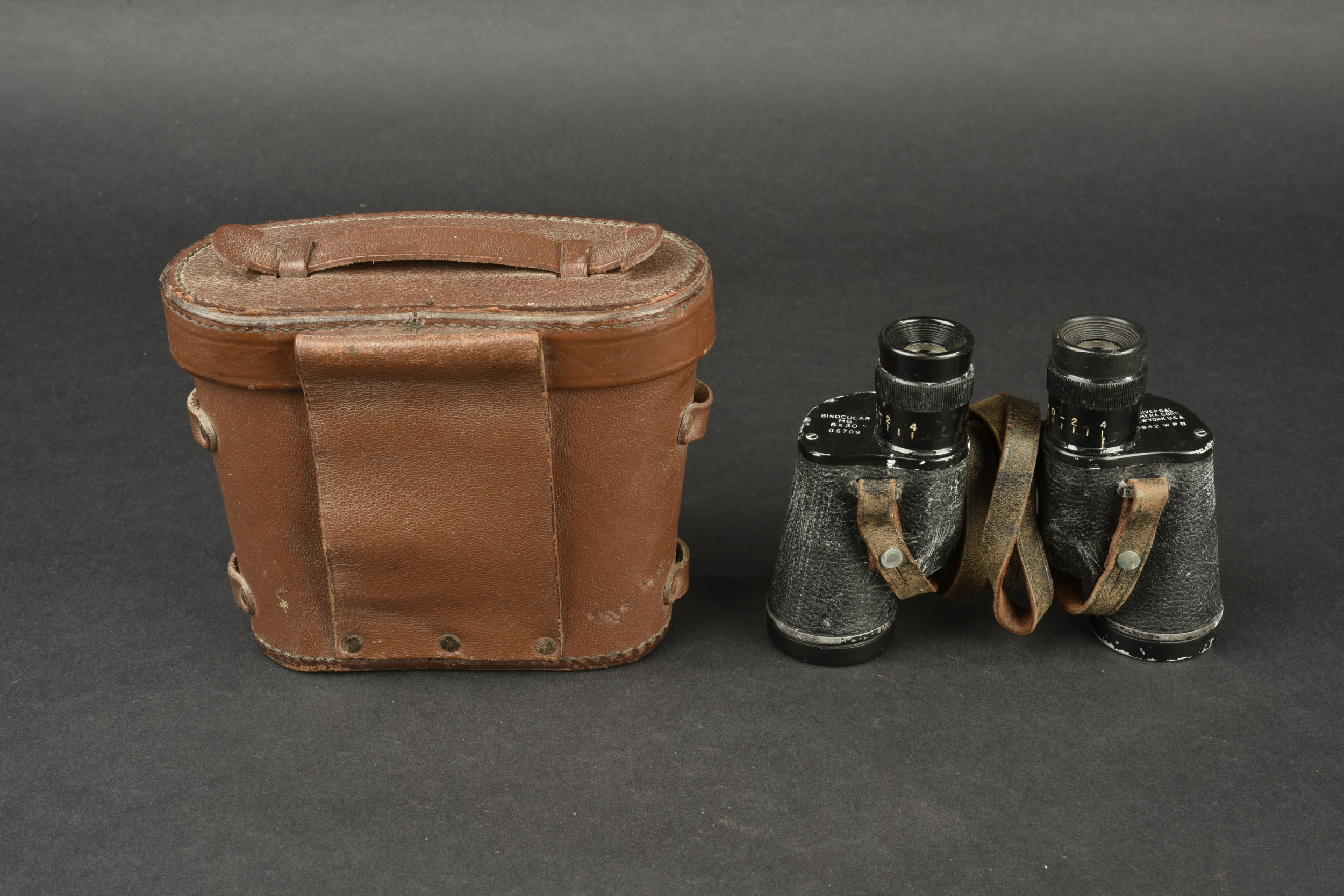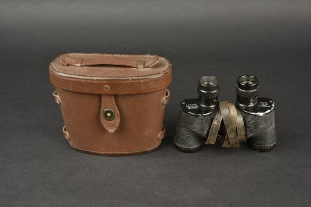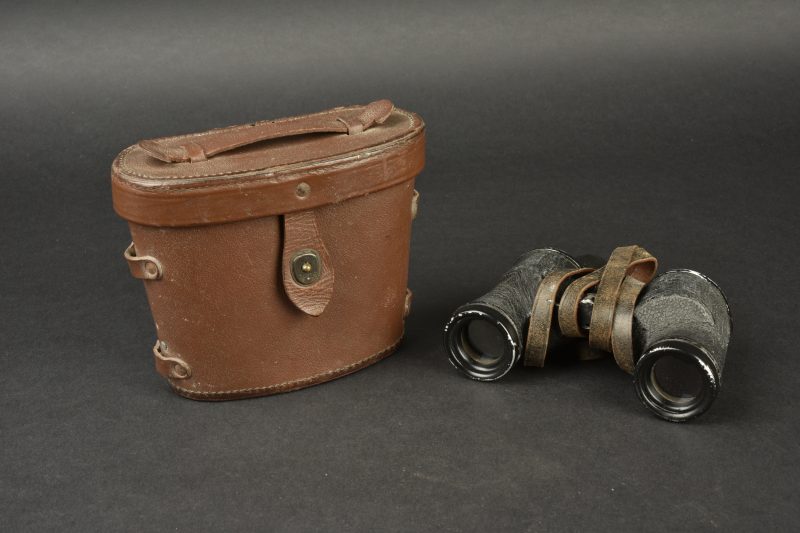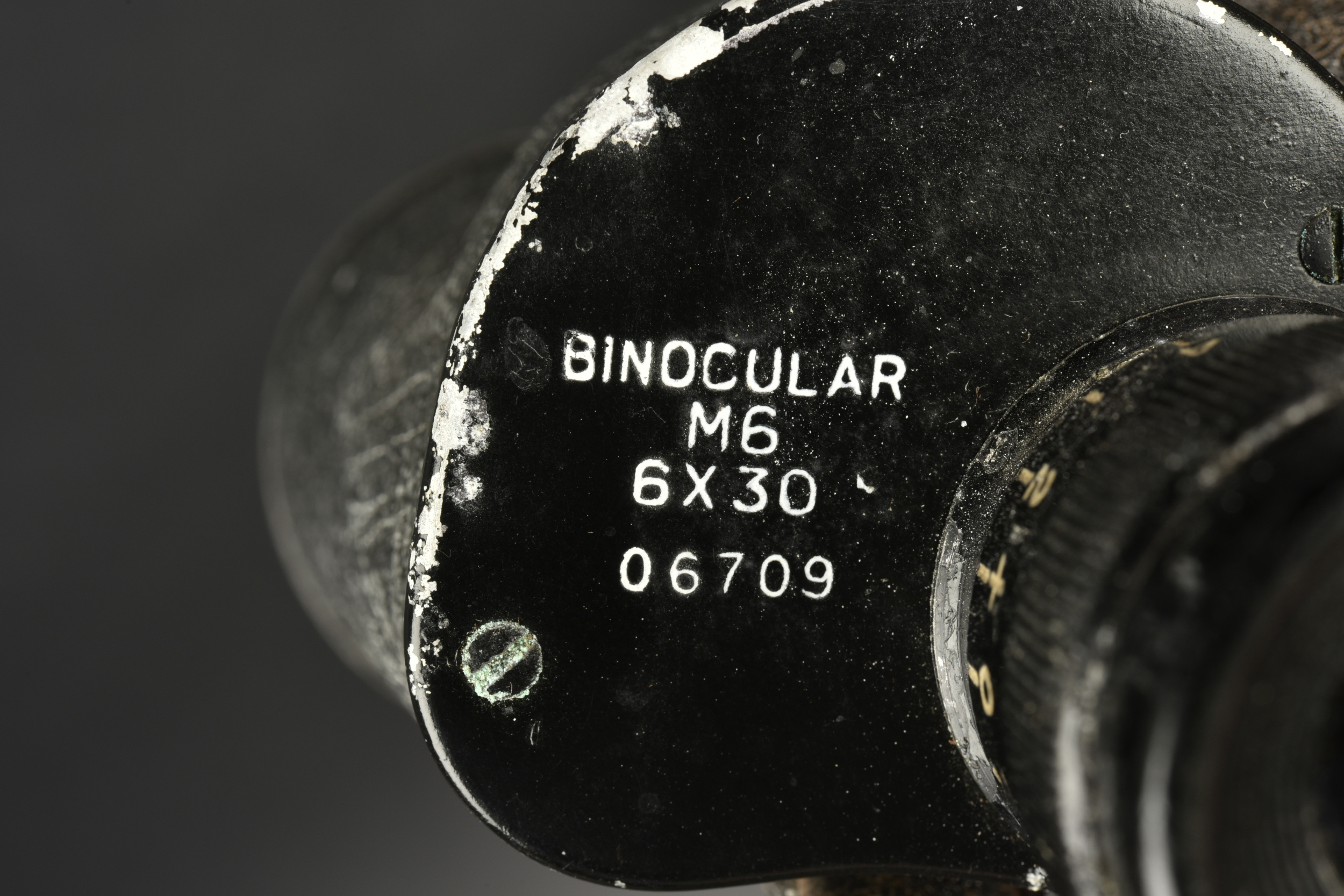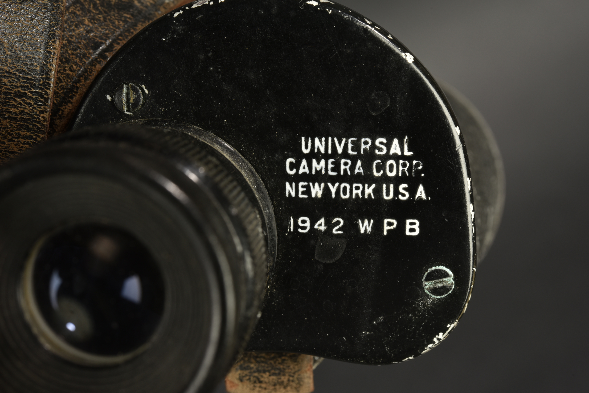 Jumelles US. Housse en simili cuir marron. Bouton pression fonctionnel. Poignée de transport présente, la sangle de transport est manquante. Le passant au ceinturon est complet. Jumelles en métal, revêtement en relativement bon état. Marquages Binocular M6 6×30 06709 Universal Camera Corps New York USA 1942 WPB. Sangle de transport en cuir complète. Optiques claires et graduées présentant quelques tâches. A noter une certaine usure et patine de la pièce. Etat II+.