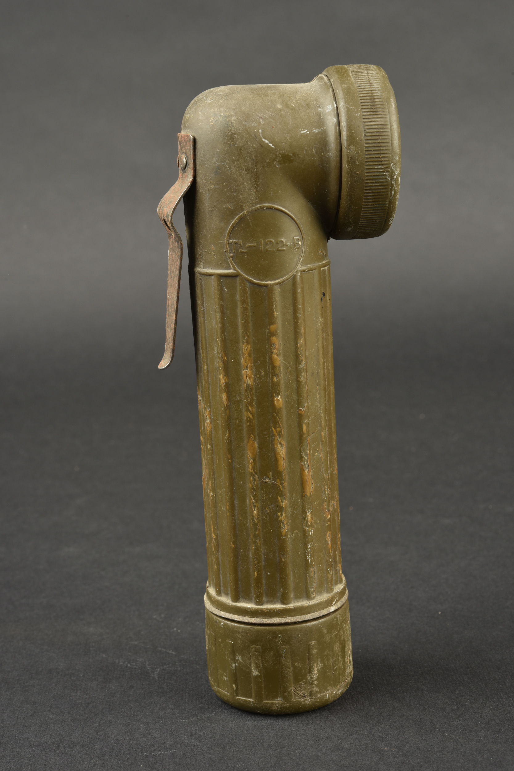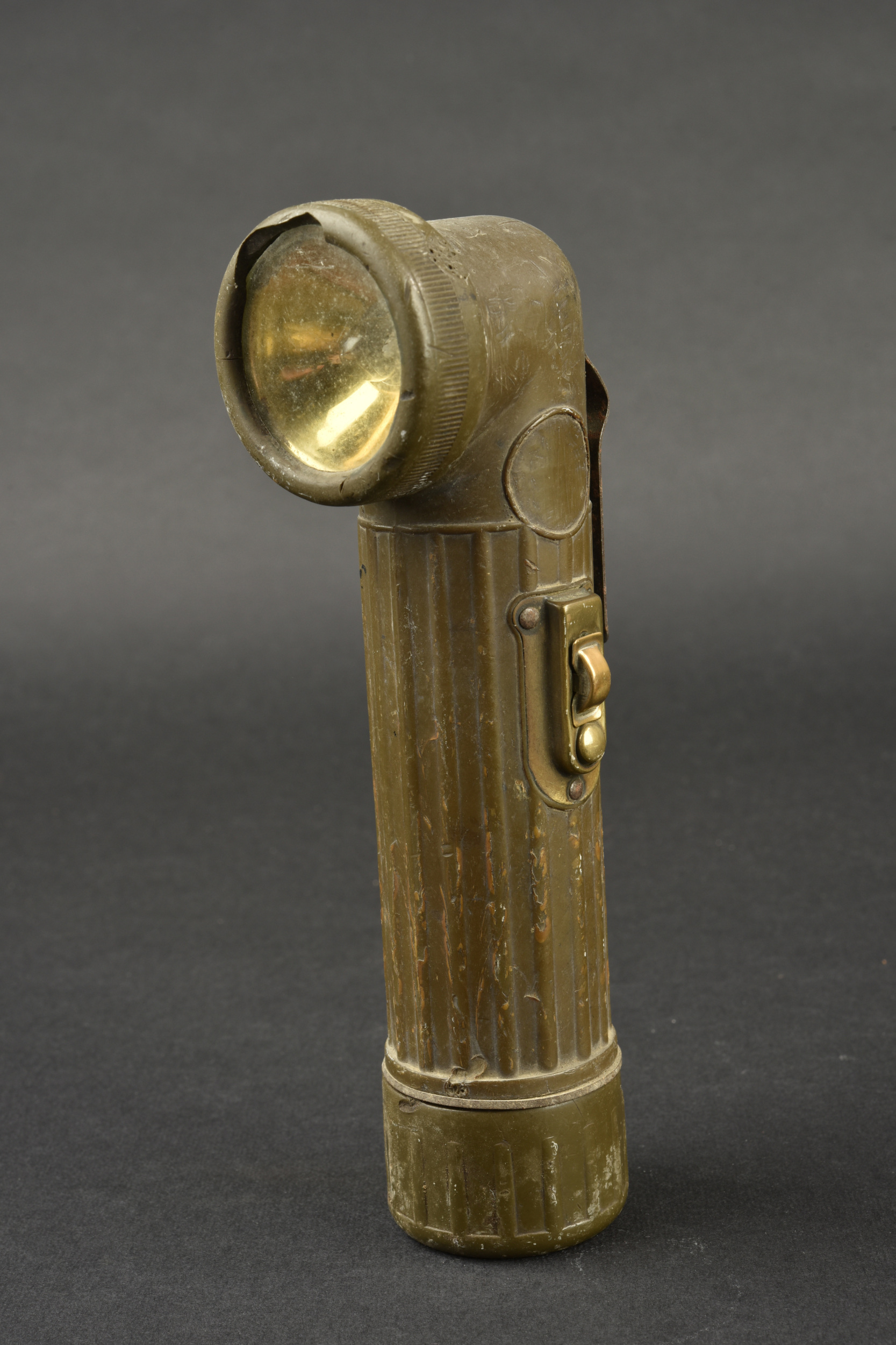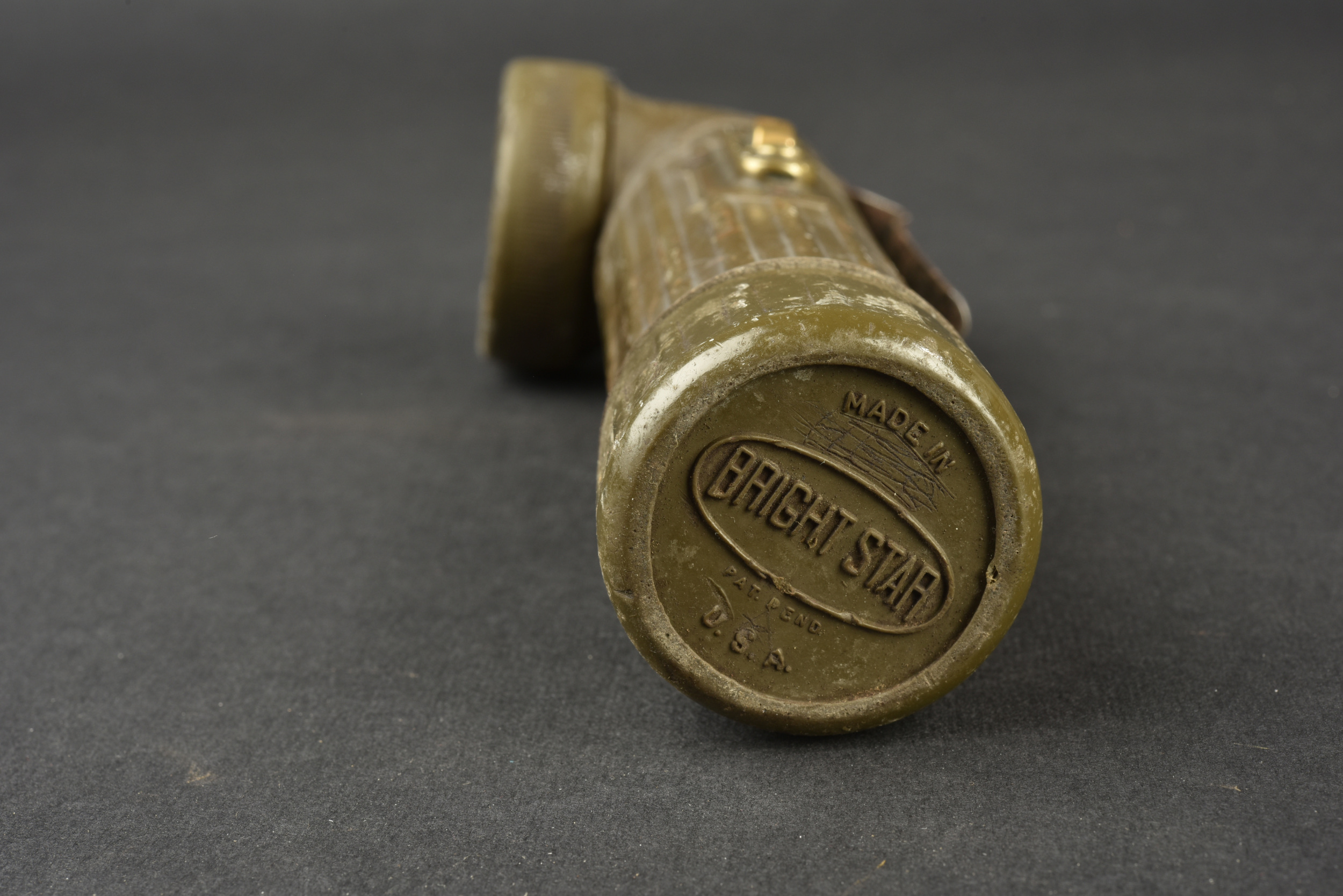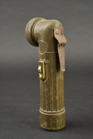 Lampe de poche TL 122-B. En bakélite kaki. Le compartiment à pile est présent, ainsi que l’ampoule. Verre complet mais devenu jaunâtre avec le temps. Le crochet de fixation est complet. Marquages TL-122-B. Quelques manques sur les bordures. Toutes les pièces mobile sont fonctionnelles. Fabrication Bright Star. A noter une certaine usure et patine de la pièce, ainsi que des tâches et griffures. Etat II+.