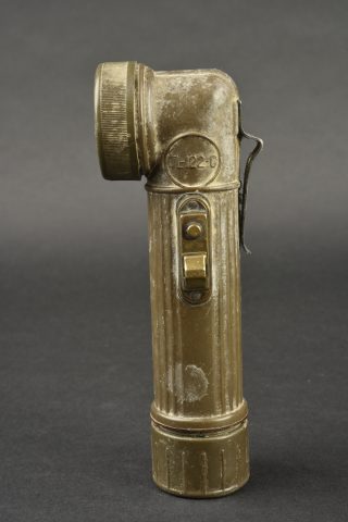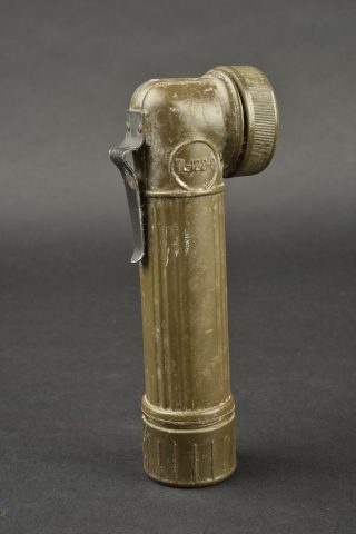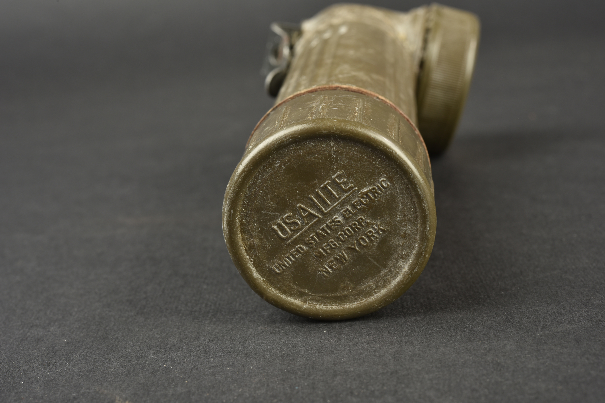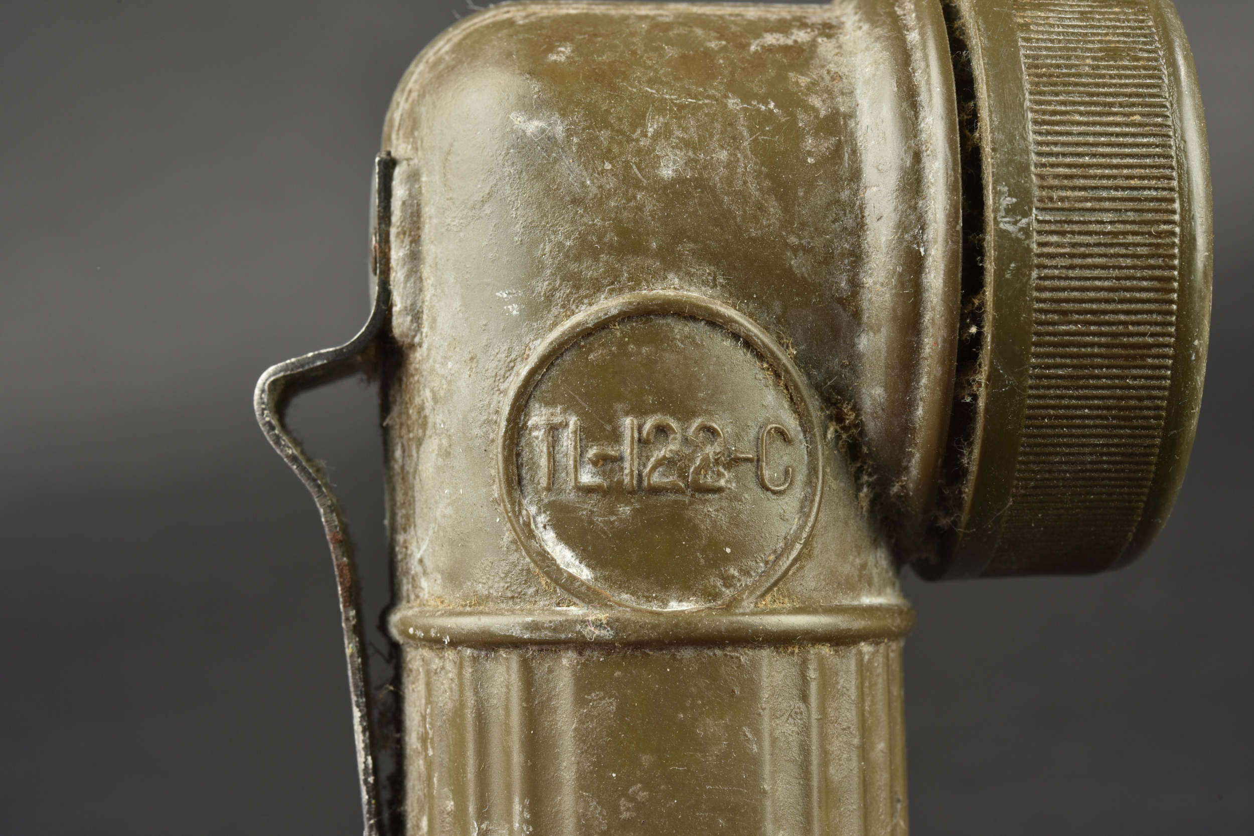 Lampe de poche TL 122-C. En bakélite kaki. Le compartiment à pile est présent, ainsi que l’ampoule. Verre en plastique complet mais devenu opaque avec le temps. Le crochet de fixation est complet. Marquages TL-122-C. Toutes les pièces mobile sont fonctionnelles. Fabrication USA Lite. A noter une certaine usure et patine de la pièce, ainsi que des tâches et griffures. Etat II+.