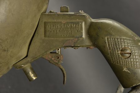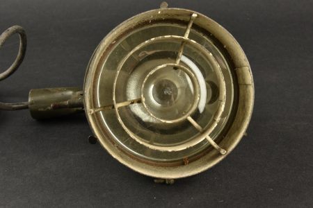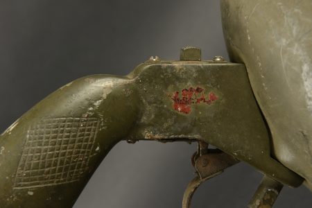 Lampe US pistol light grip. Lampe américaine portative de l’US Army, utilisée comme projecteur de recherchen éclairage de campement, par les mécaniciens pour éclairer le compartiment moteur ou toute autre zone difficile d’accès. Poignée monobloc métallique avec plaquette marquée Patent Number 105703, fabriquée par The S.H. Thomson Mfg. Co. à Dayton (Ohio). Entièrement peinte en vert. Une fissure sur le verre. Fonctionnement non vérifié.