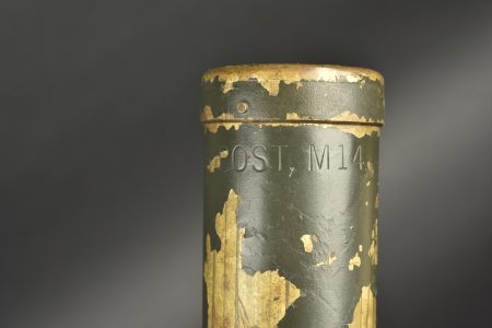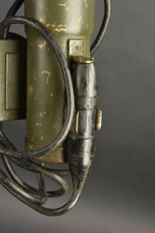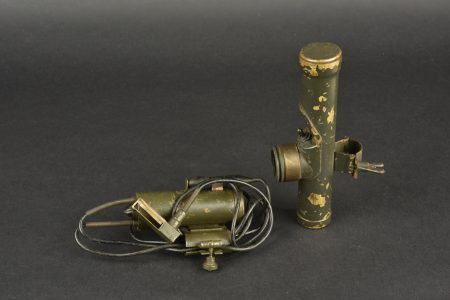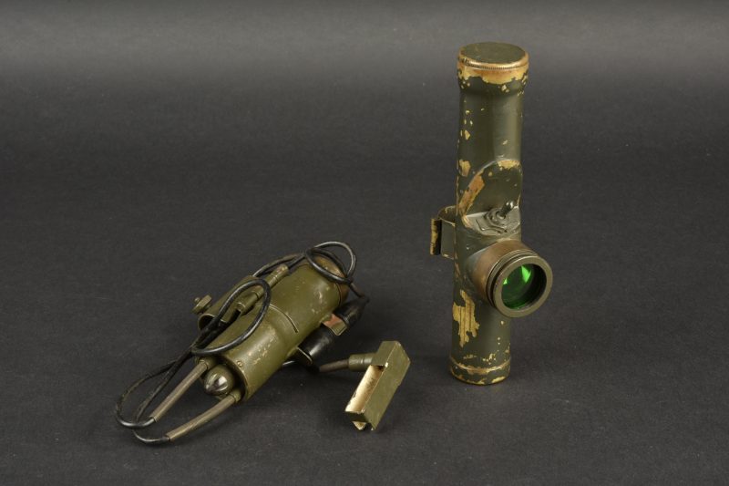 Lampes de mortier US. Comprenant une lampe en métal, peinture kaki à 70%. Marquages Light Aiming post M14. Toutes les pièces mobiles sont fonctionnelles. Attache complète. Filtre vert. Une lampe en métal, peinture kaki à 90%. Toutes les pièces mobiles sont fonctionnelles, câbles et prises présents. A noter une certaine usure et patine des pièces. Etat II+.