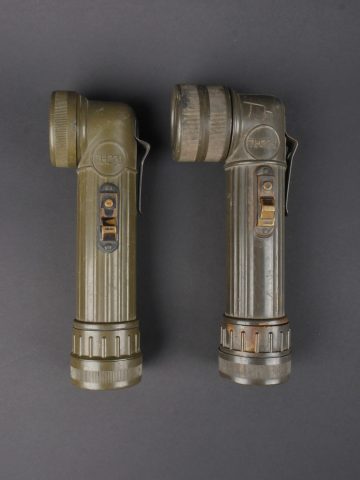 Lampes de poche US. Comprenant deux lampes de poche TL-122-D, en bakélite kaki. Les attaches sont présentes, ainsi que les ampoules. Les piles sont manquantes. Fabrication USA Lite et BMG. A noter une certaine usure et patine des pièces. Etat II+.