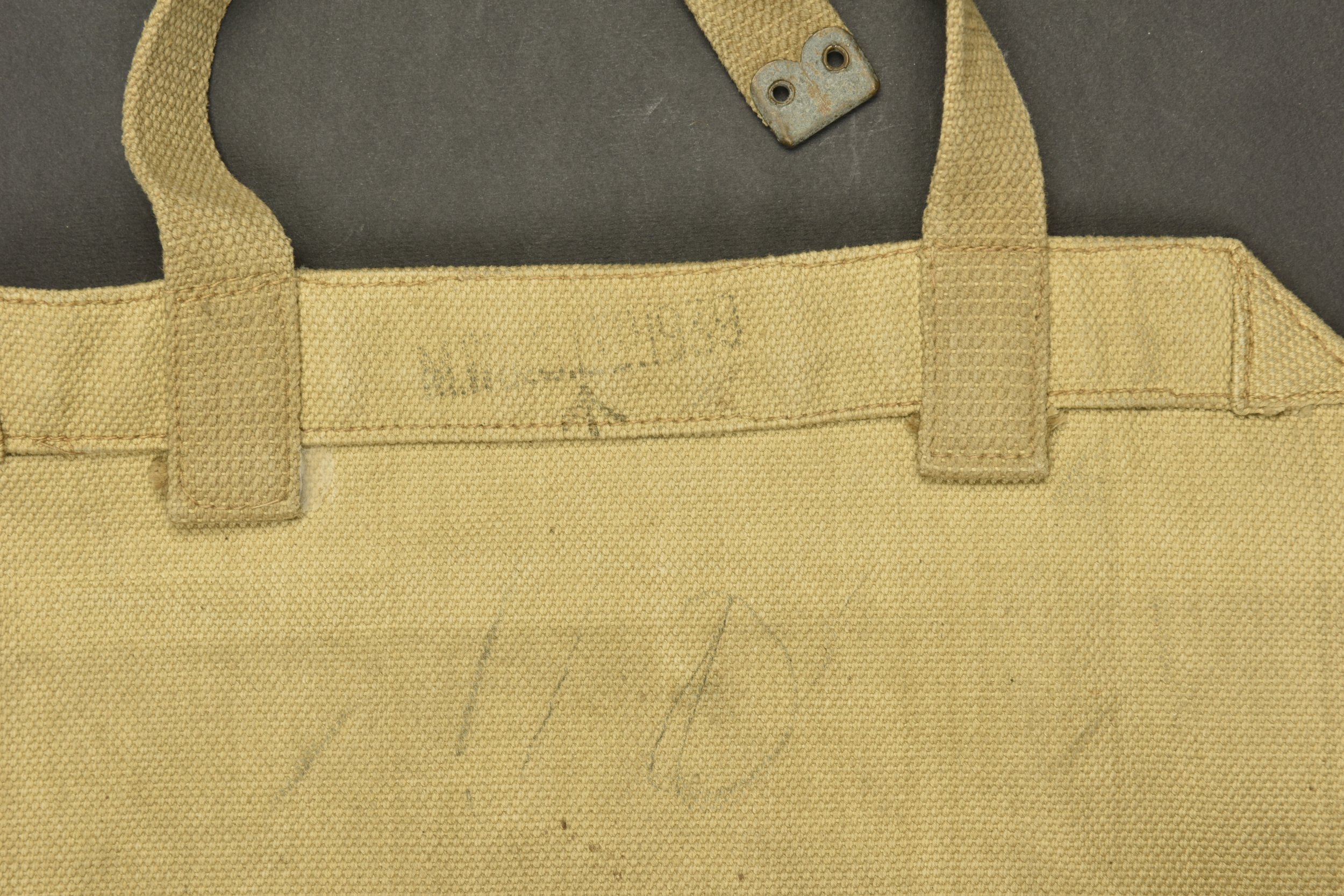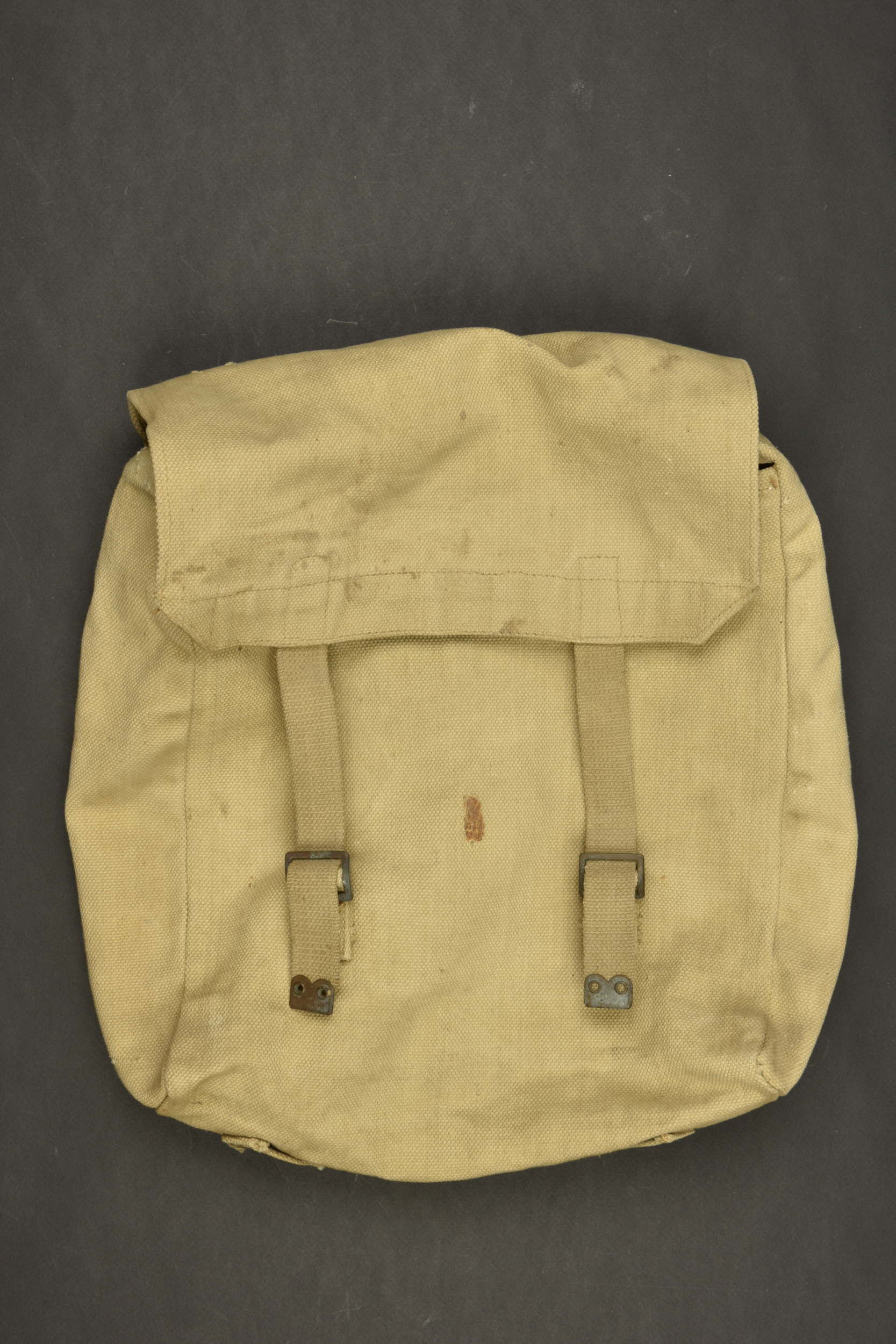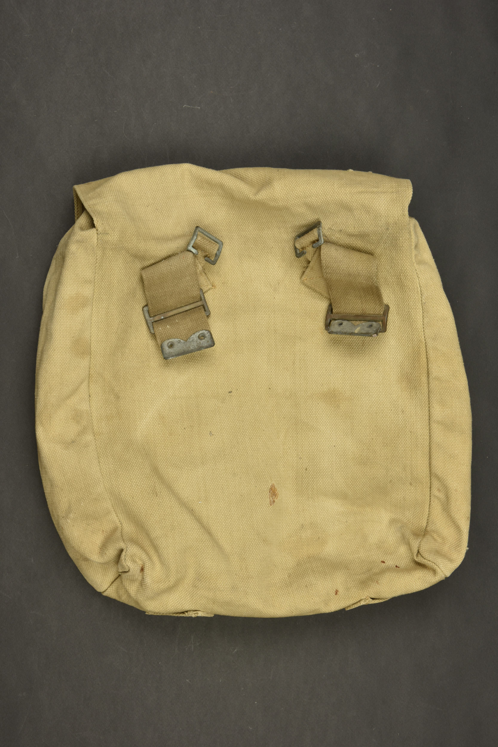 Large Pack. En forte toile web. Toutes les sangles sont présentes, sauf les dorsales. Marquages présents, mais illisibles. A noter une certaine usure et patine de la pièce, ainsi que des tâches. Etat II+.