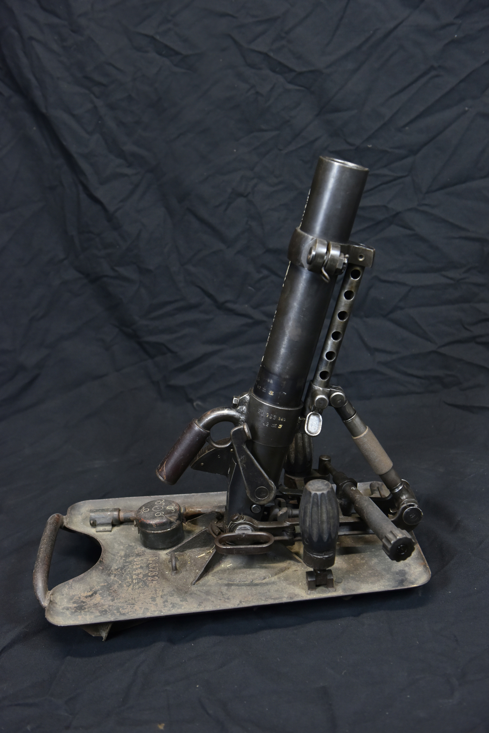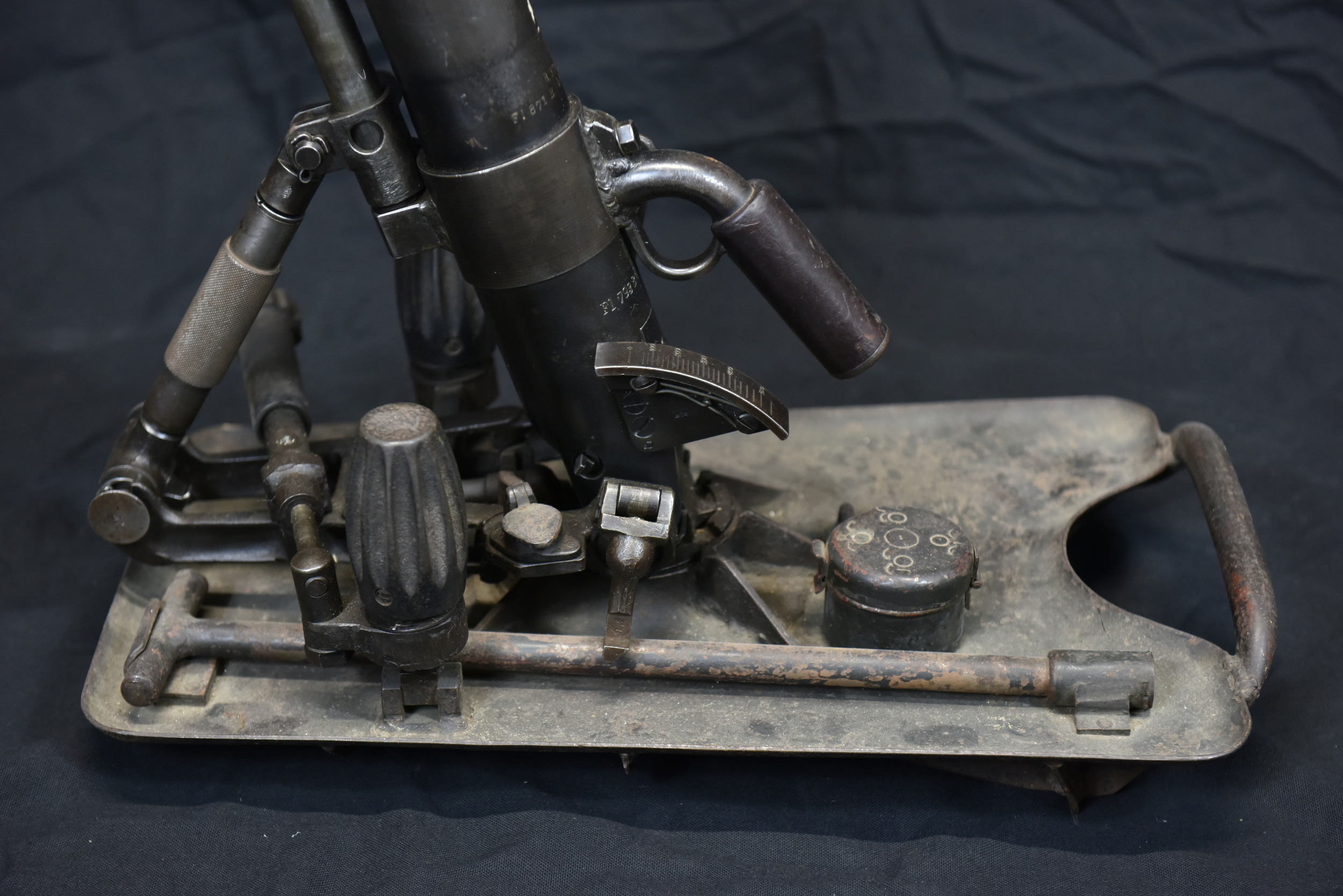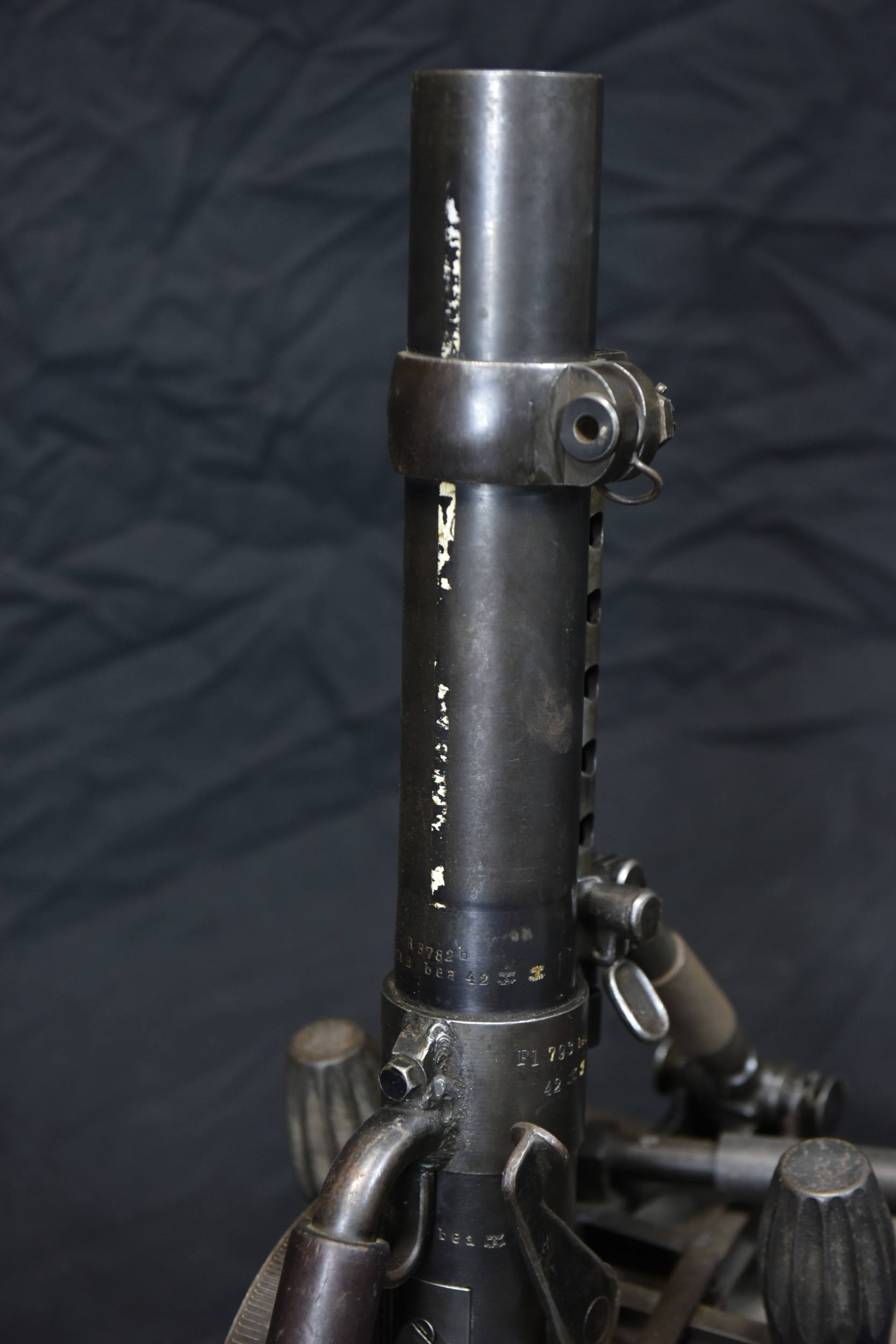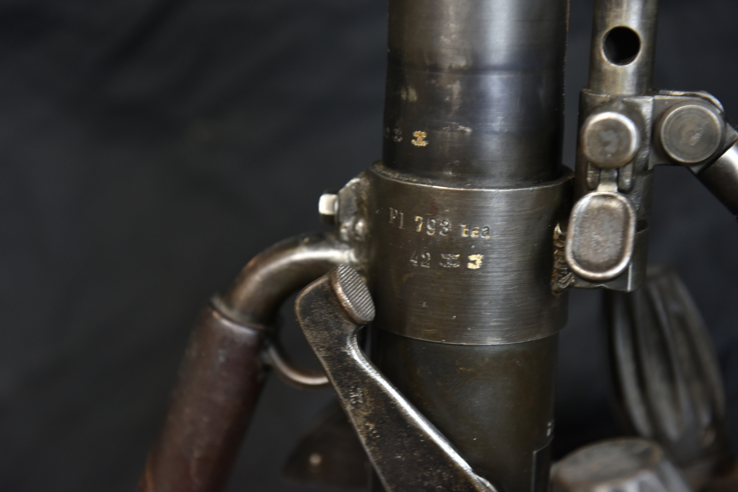 Leichtgranatwerfer 36. Calibre 50mm, numéro R3782B, fabrication Rheinmetall. Ensemble en métal dans son bronzage d’origine à 75%. Plaque de sol marquée MR B3782 BEA 42, avec aigle Waa. Reste d’un ligne d’alignement à la peinture blanche sur toute la longueur du tube. Accessoire présent au niveau du socle, ainsi que la poignée de transport. Tube en métal lisse, marqué R3782B FL 871B BEA 42, avec de nombreux aigles Waa. Poignée en bois complète. Collier marqué FL 793 42, avec de nombreux aigles Waa. Catégorie C9. Arme neutralisée aux nouvelles normes européenne par le Banc d’épreuve de Saint Etienne. Cette arme doit être déclarée avec Cerfa et certificat médical de moins de 1 mois ou licence de tir tamponnée ou permis de chasse valide (art R312-56). La délivrance de l’arme n’aura lieu qu’après consultation du fichier Finadia. L’inscription de l’acheteur sur ce fichier entrainera automatiquement la nullité de la vente. A noter une certaine usure et patine de la pièce. Etat II+. Conçu par la firme Rheinmetall-Borsig AG, le mortier léger comporte deux poignées pour être maintenu au sol, les servants étant couchés.