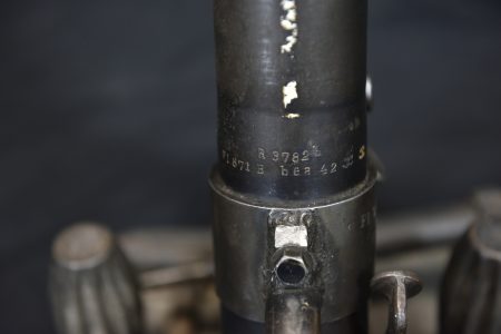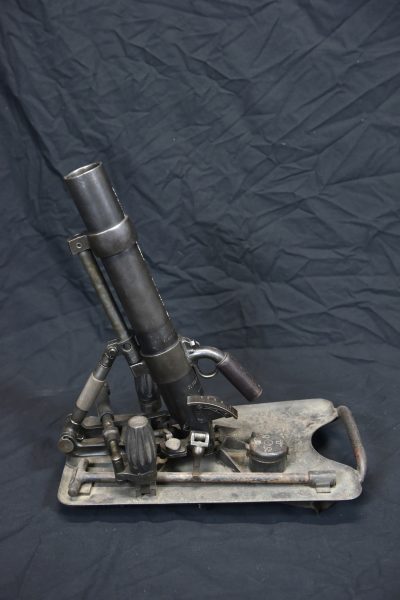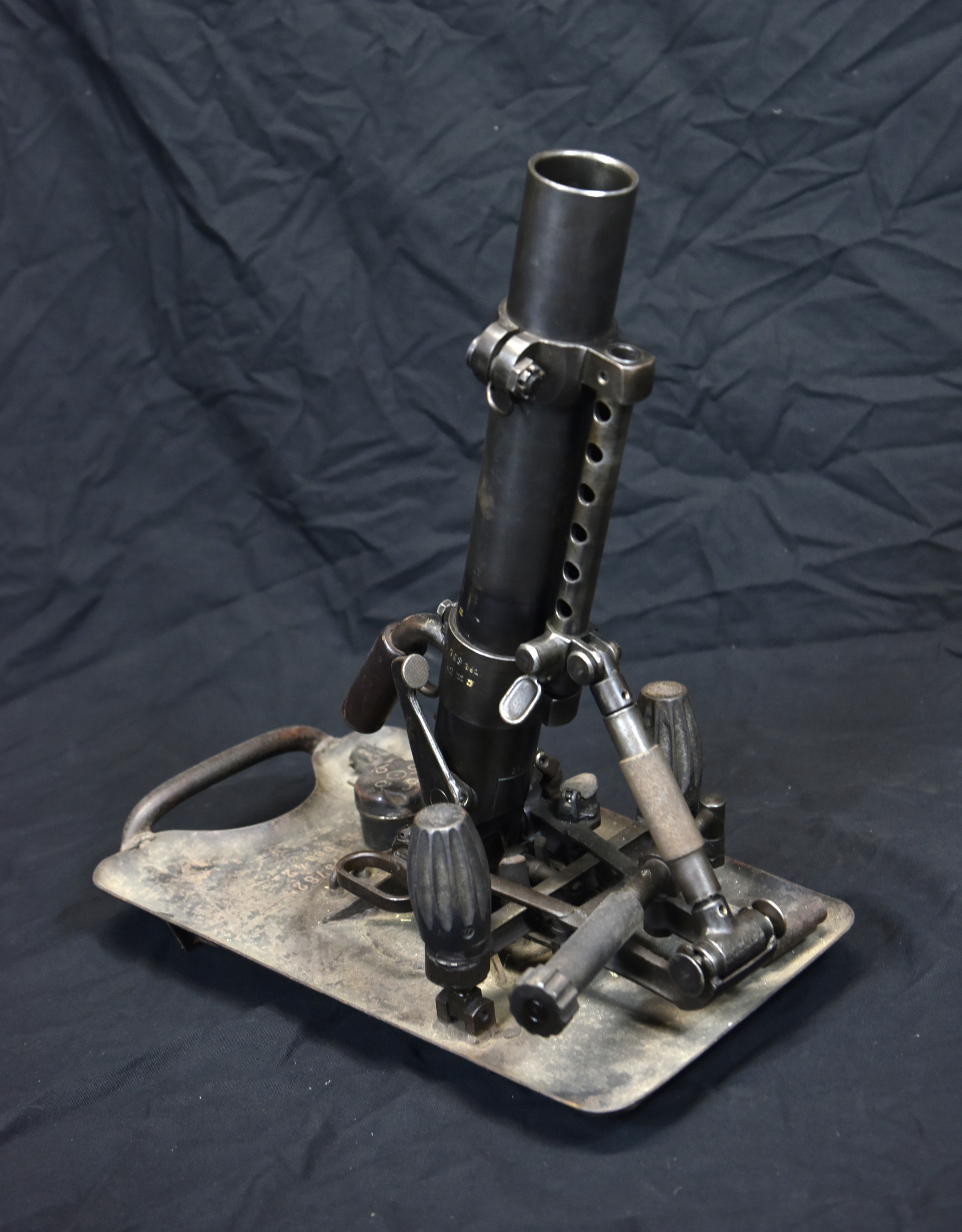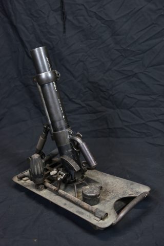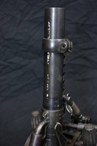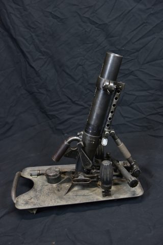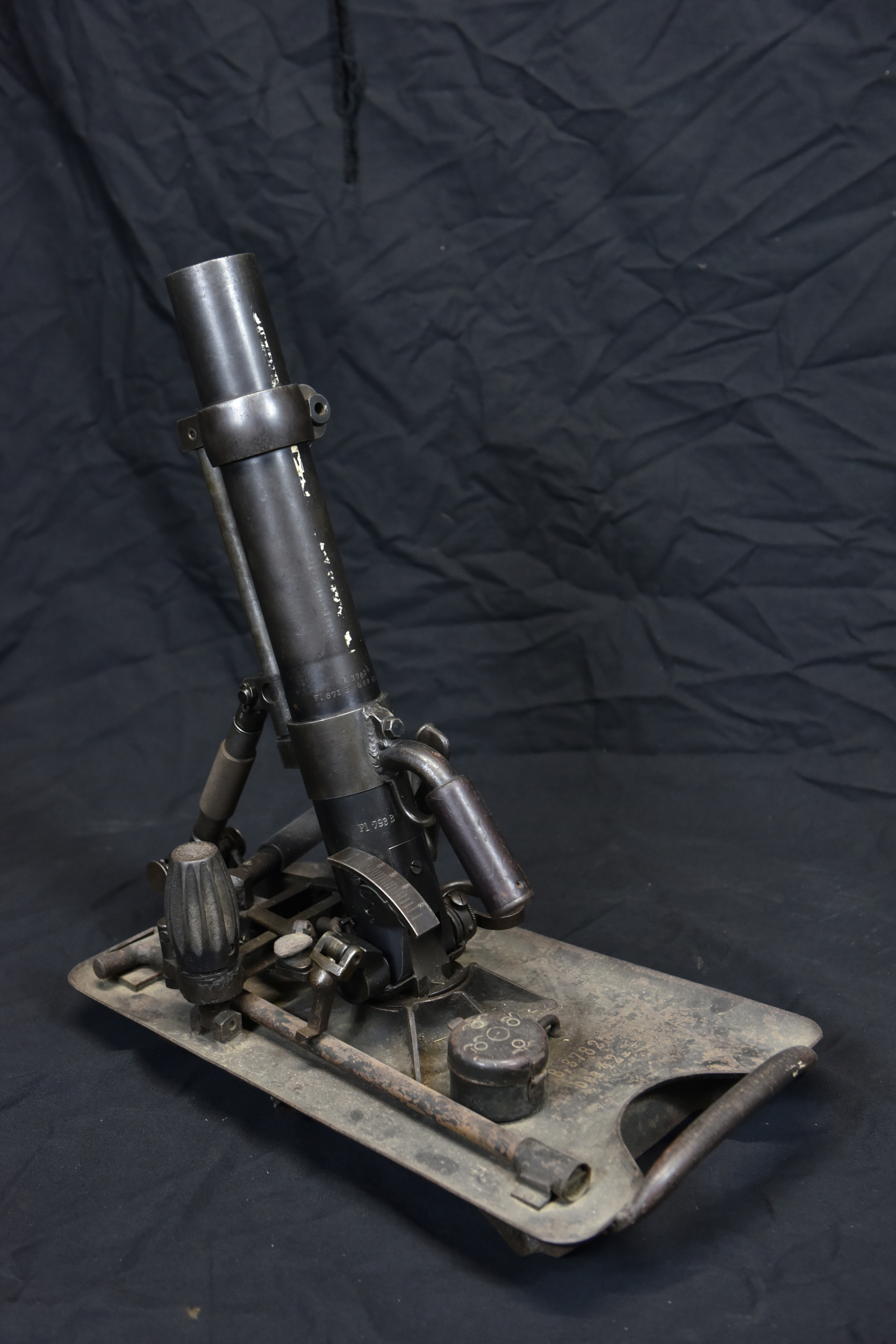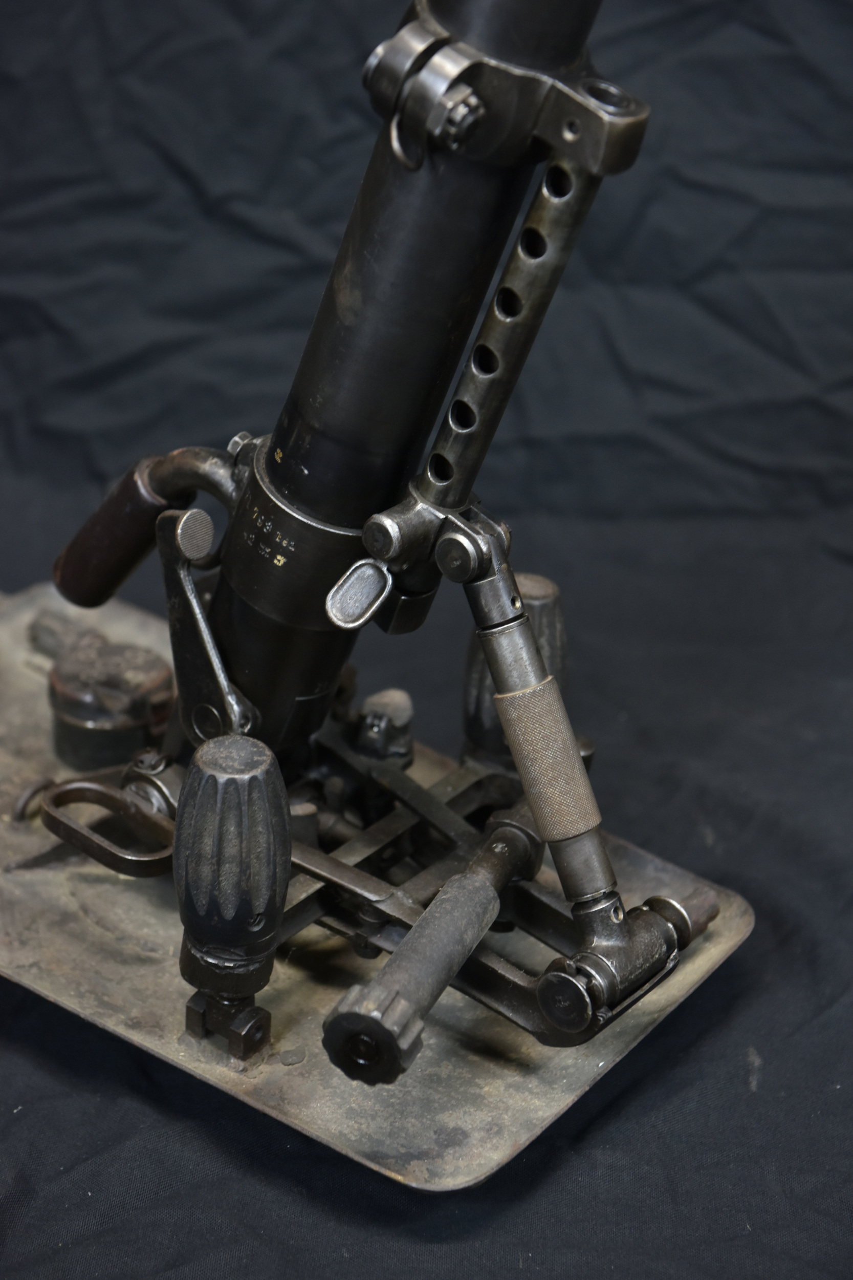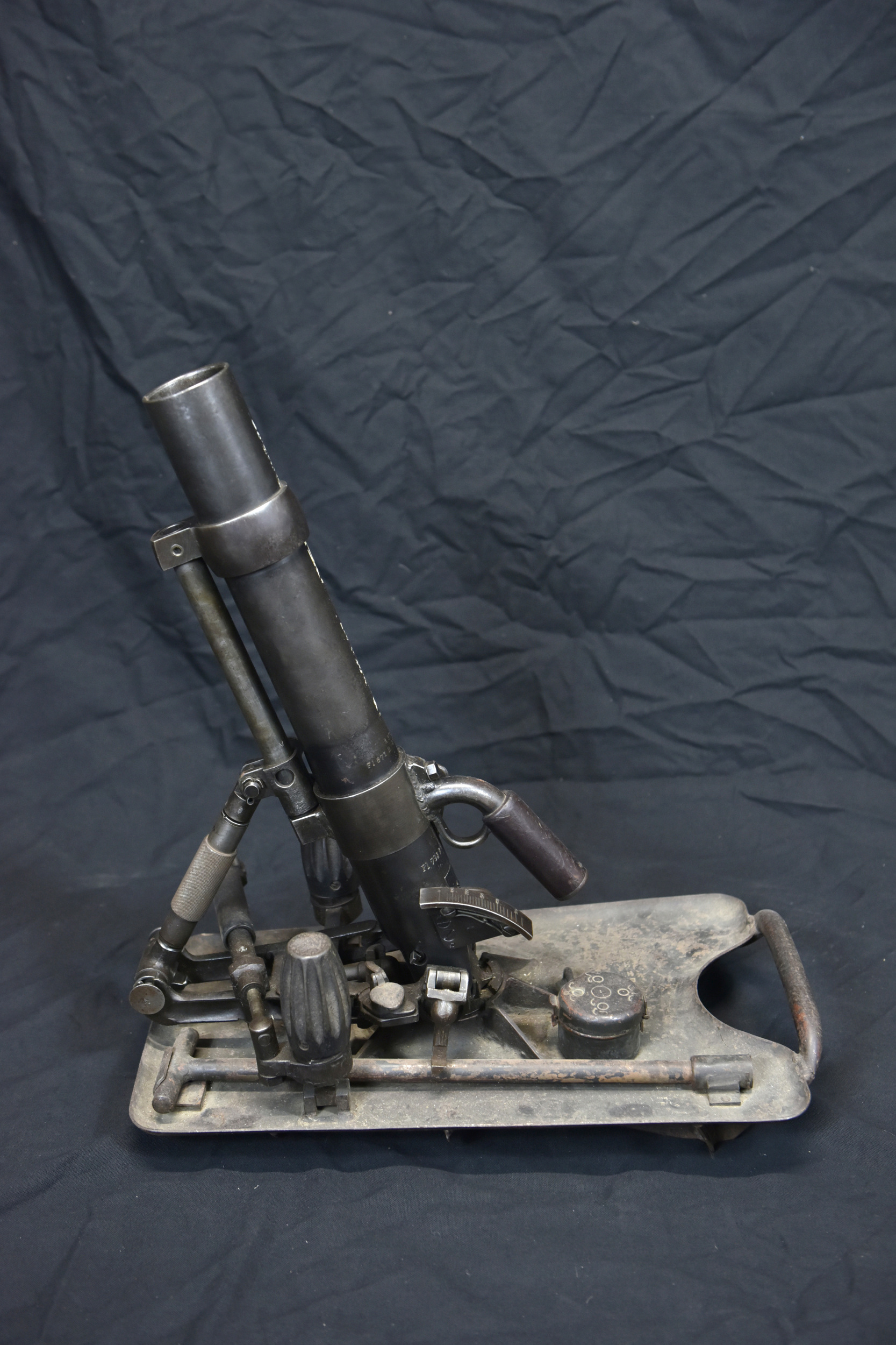 Leichtgranatwerfer 36. Calibre 50mm, numéro R3782B, fabrication Rheinmetall. Ensemble en métal dans son bronzage d’origine à 75%. Plaque de sol marquée MR B3782 BEA 42, avec aigle Waa. Reste d’un ligne d’alignement à la peinture blanche sur toute la longueur du tube. Accessoire présent au niveau du socle, ainsi que la poignée de transport. Tube en métal lisse, marqué R3782B FL 871B BEA 42, avec de nombreux aigles Waa. Poignée en bois complète. Collier marqué FL 793 42, avec de nombreux aigles Waa. Catégorie C9. Arme neutralisée aux nouvelles normes européenne par le Banc d’épreuve de Saint Etienne. Cette arme doit être déclarée avec Cerfa et certificat médical de moins de 1 mois ou licence de tir tamponnée ou permis de chasse valide (art R312-56). La délivrance de l’arme n’aura lieu qu’après consultation du fichier Finadia. L’inscription de l’acheteur sur ce fichier entrainera automatiquement la nullité de la vente. A noter une certaine usure et patine de la pièce. Etat II+. Conçu par la firme Rheinmetall-Borsig AG, le mortier léger comporte deux poignées pour être maintenu au sol, les servants étant couchés.