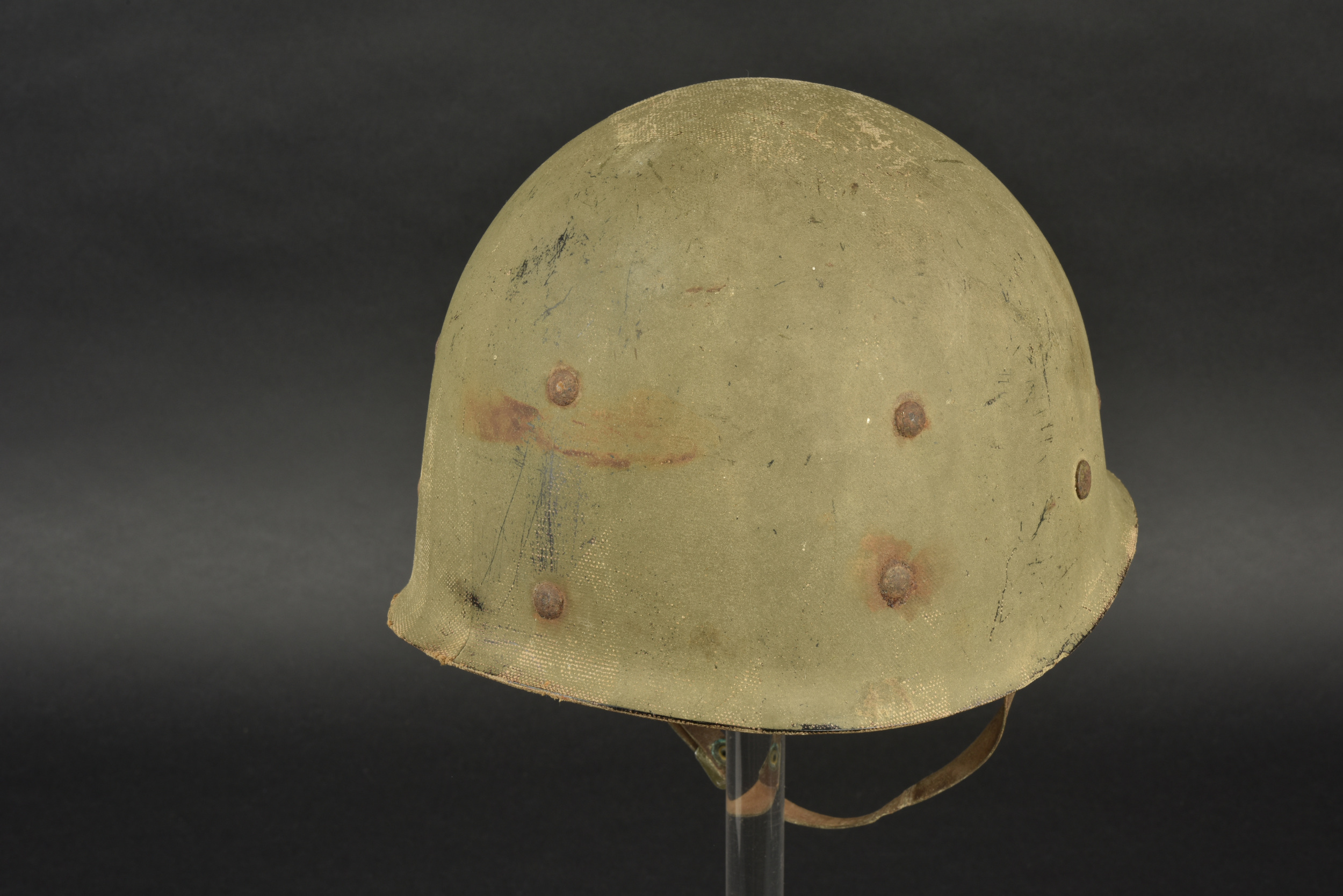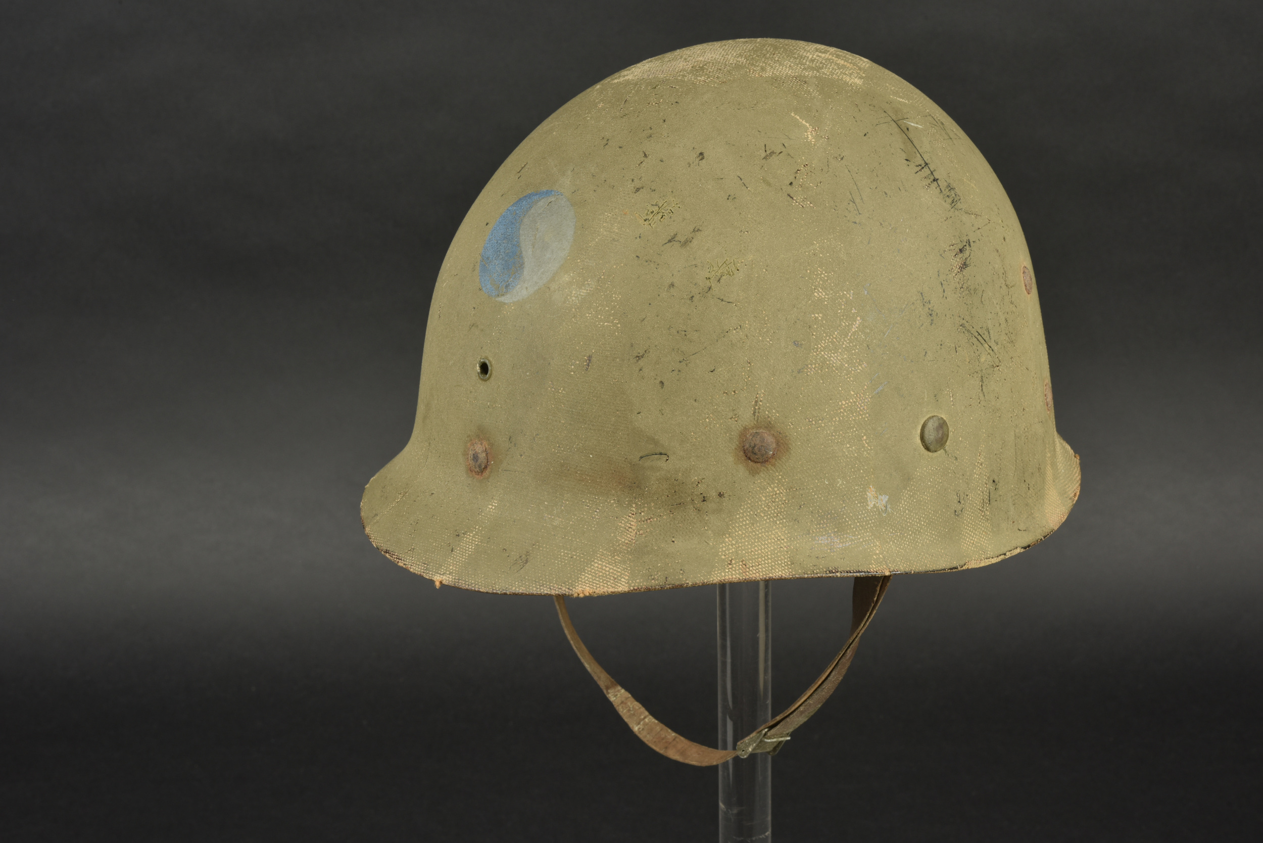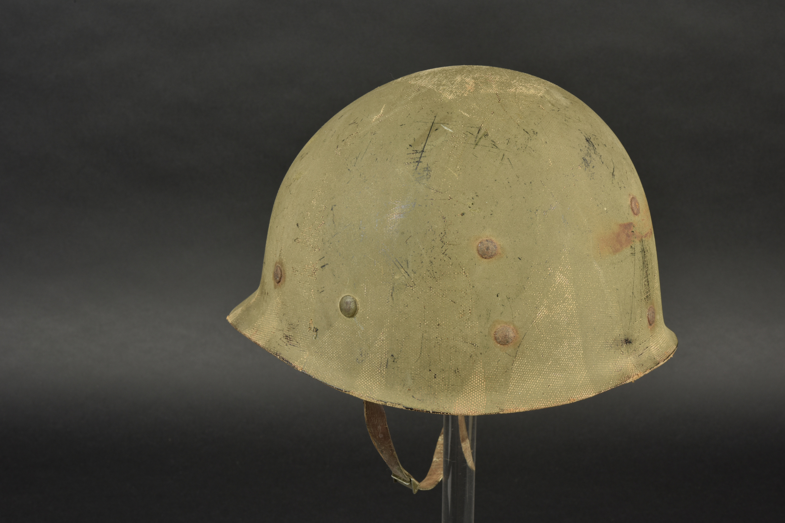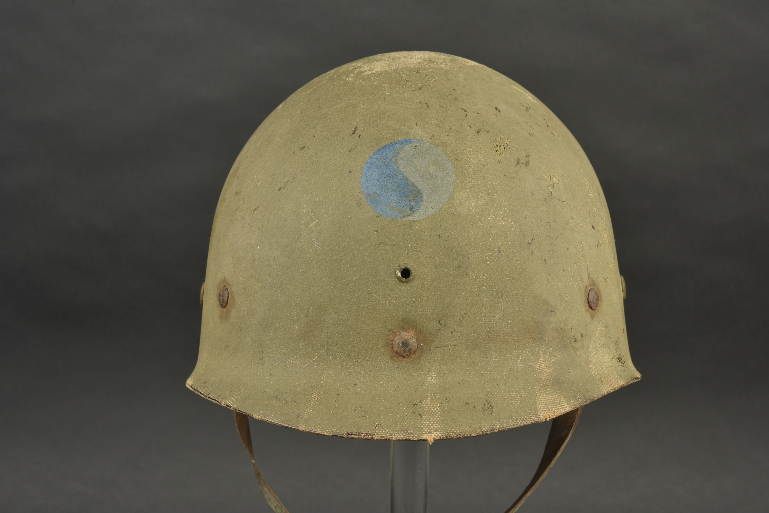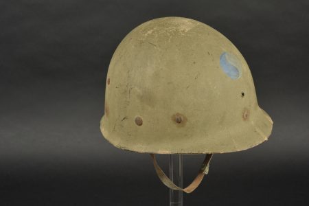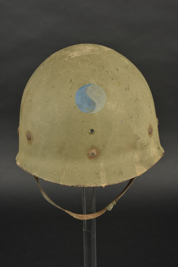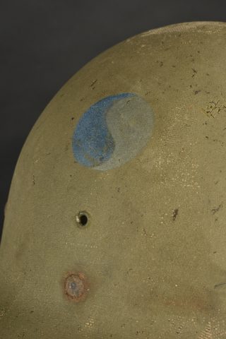 Liner de la 29ème DI US. Liner en matériaux composite haute pression. Fabrication Capac. La coiffe interne est complètement absente. Seule certaines parties métalliques sont encore présentes, mais fortement oxydées. Jugulaire en cuir complète, fabrication United. Peinture externe à 70%. Insigne de la 29ème DI US à 75%. A noter une certaine usure et patine de la pièce. Etat II+.