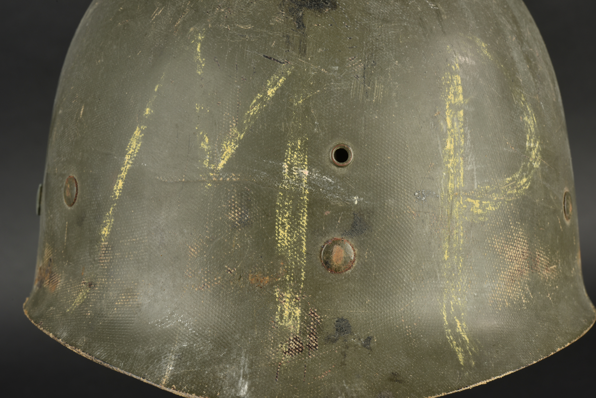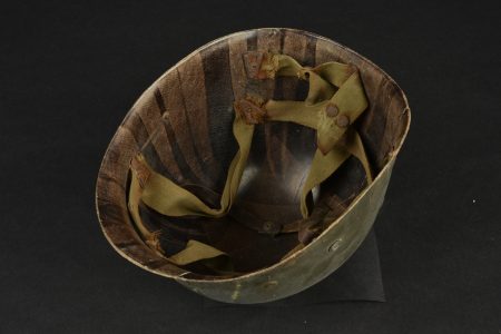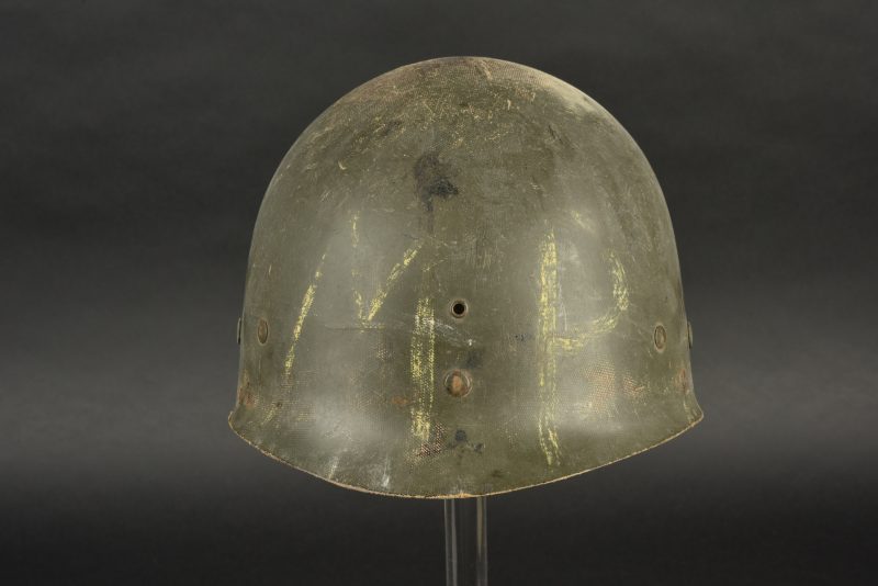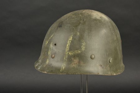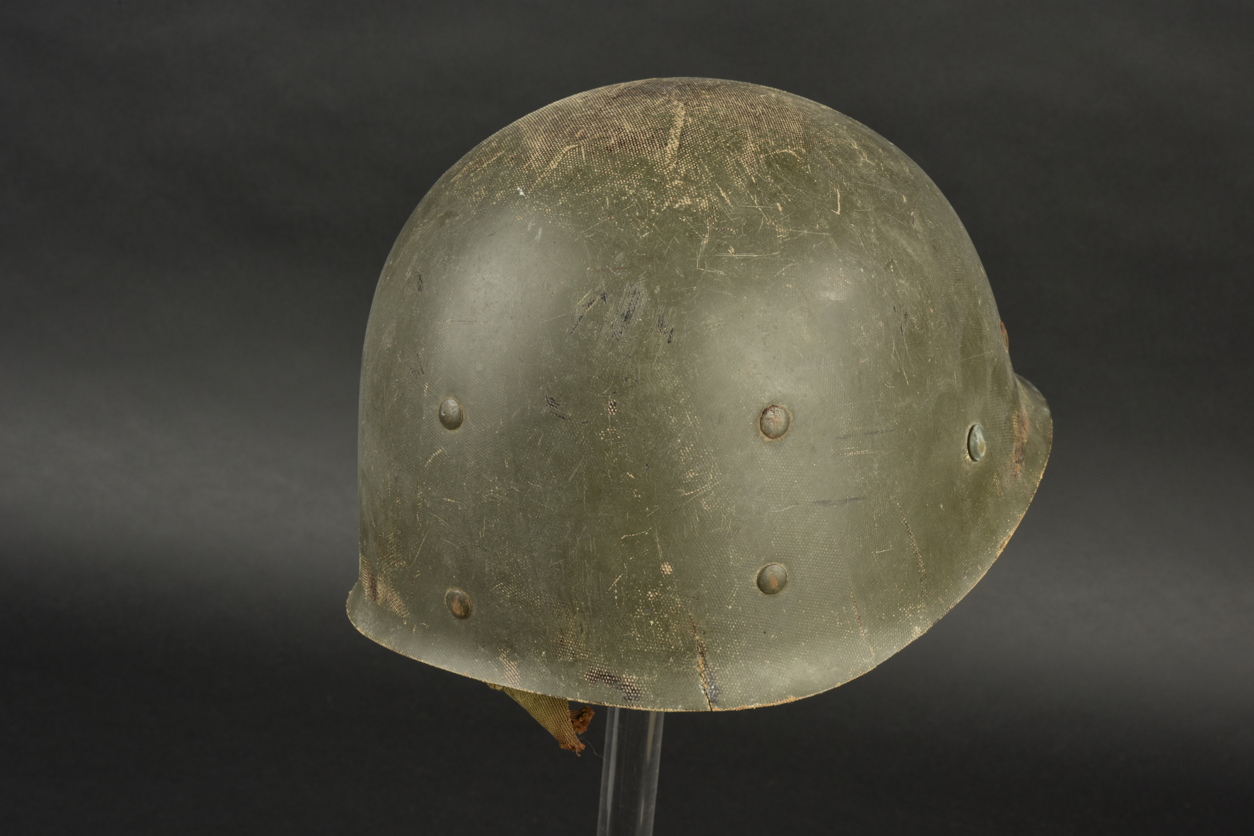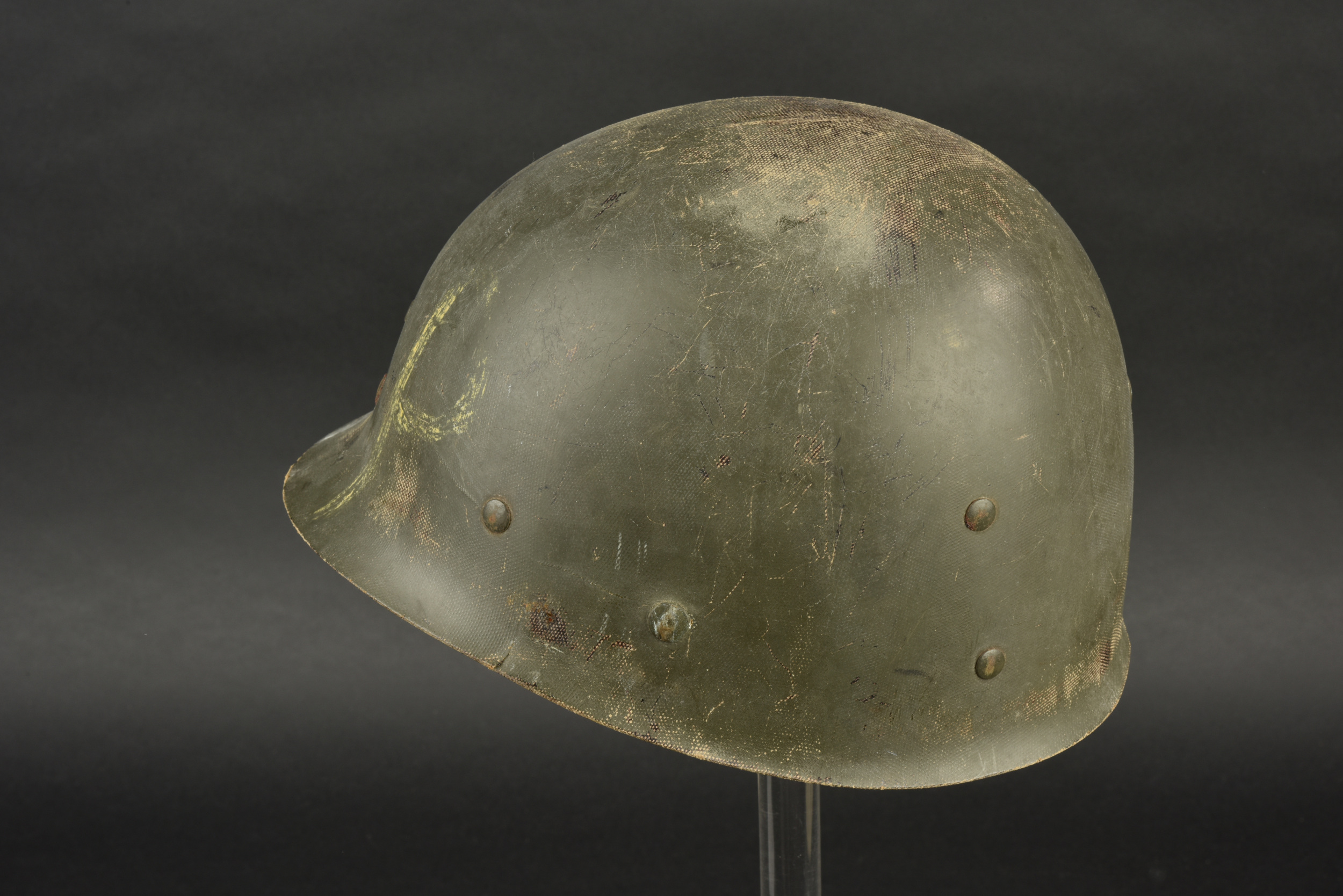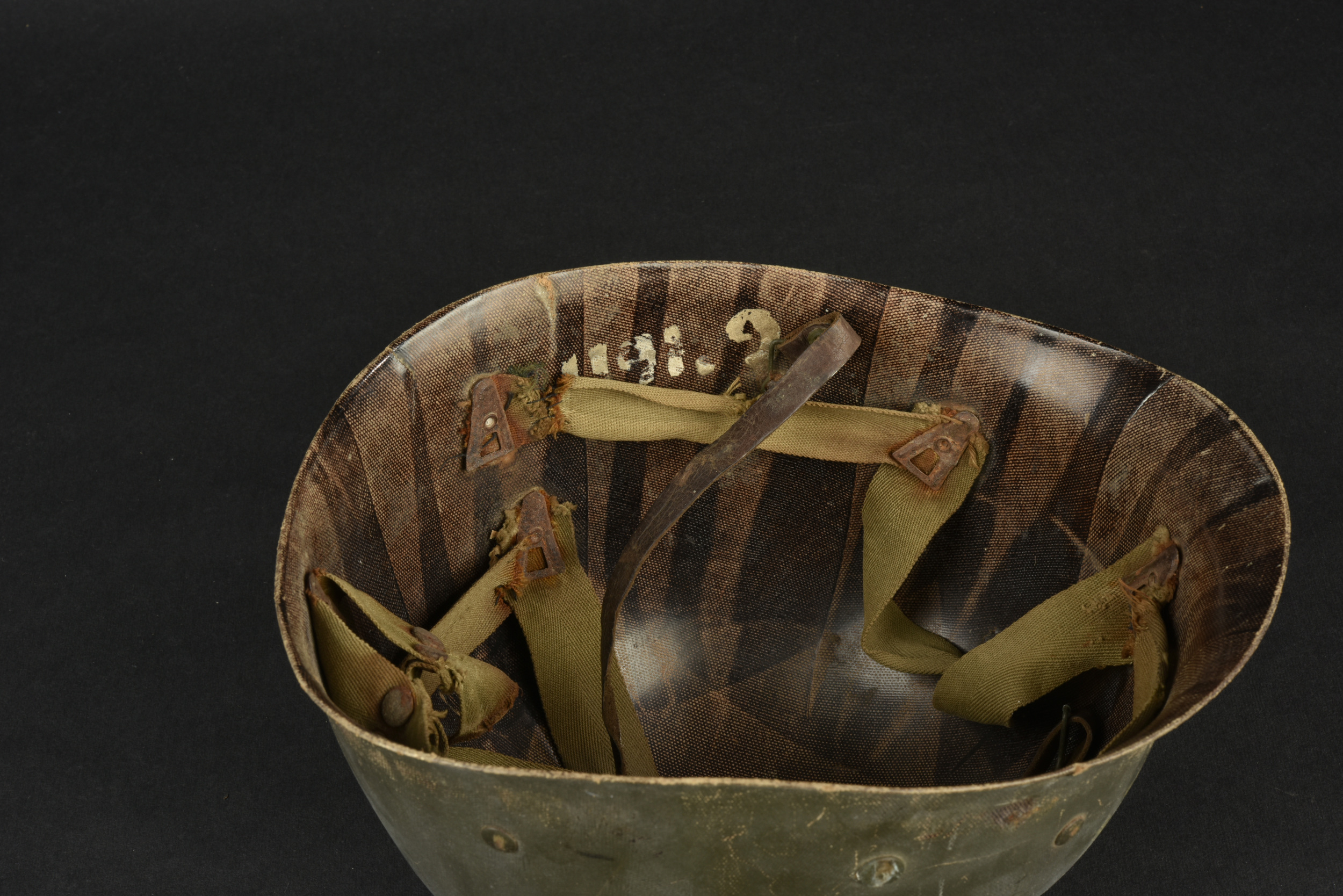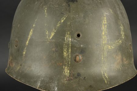 Liner de la military Police US. Liner en matériaux composite haute pression. Fabrication Inland. Coiffe présente mais incomplète. Certaines sangles sont coupées ou déchirées. La nuquière est présente. Le cordon de serrage et le bandeau de sudation sont manquants. Jugulaire en cuir complète sans marquages visibles. Laundry number G-1611, réalisé à la peinture blanche à l’intérieur de la coque. Toutes les pièces métalliques sont fortement oxydées. Peinture extérieure OD7 présente à 70%. Lettrage MP réalisé à la peinture jaune et manuellement sur la face avant de la coque. A noter une certaine usure et patine de la pièce. Etat II+.