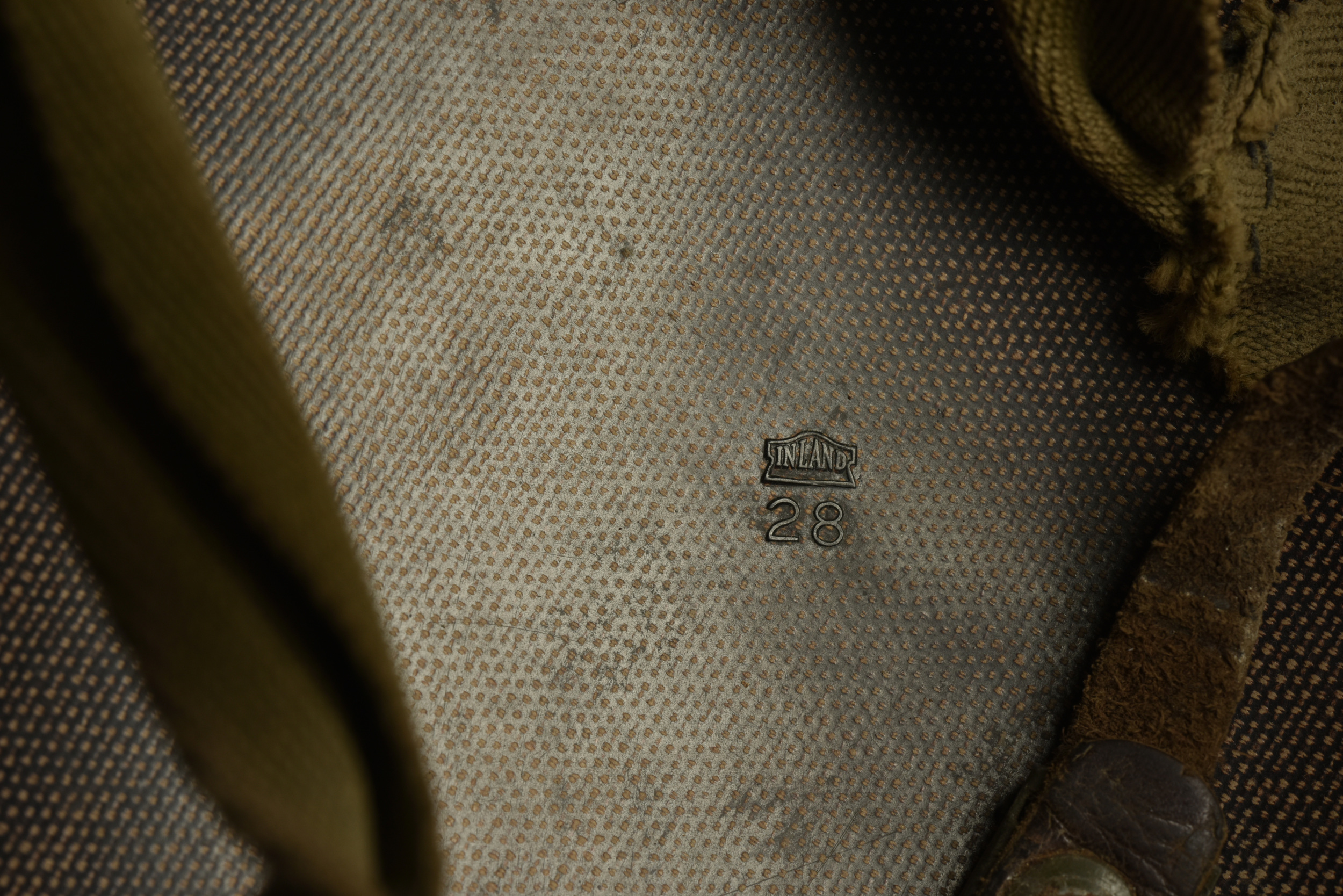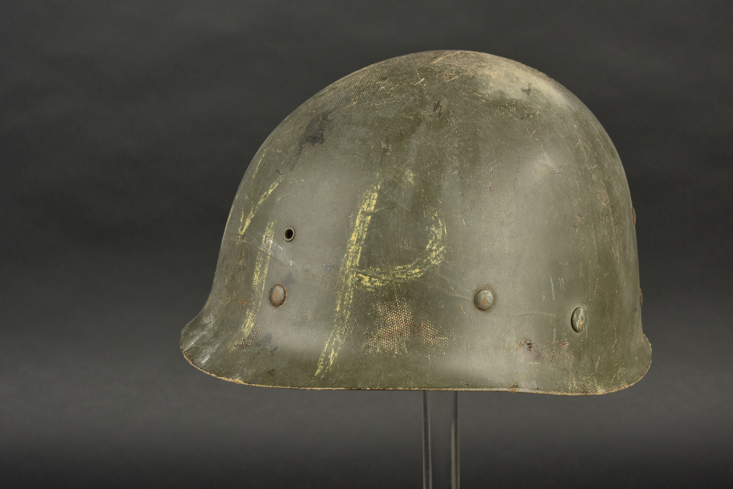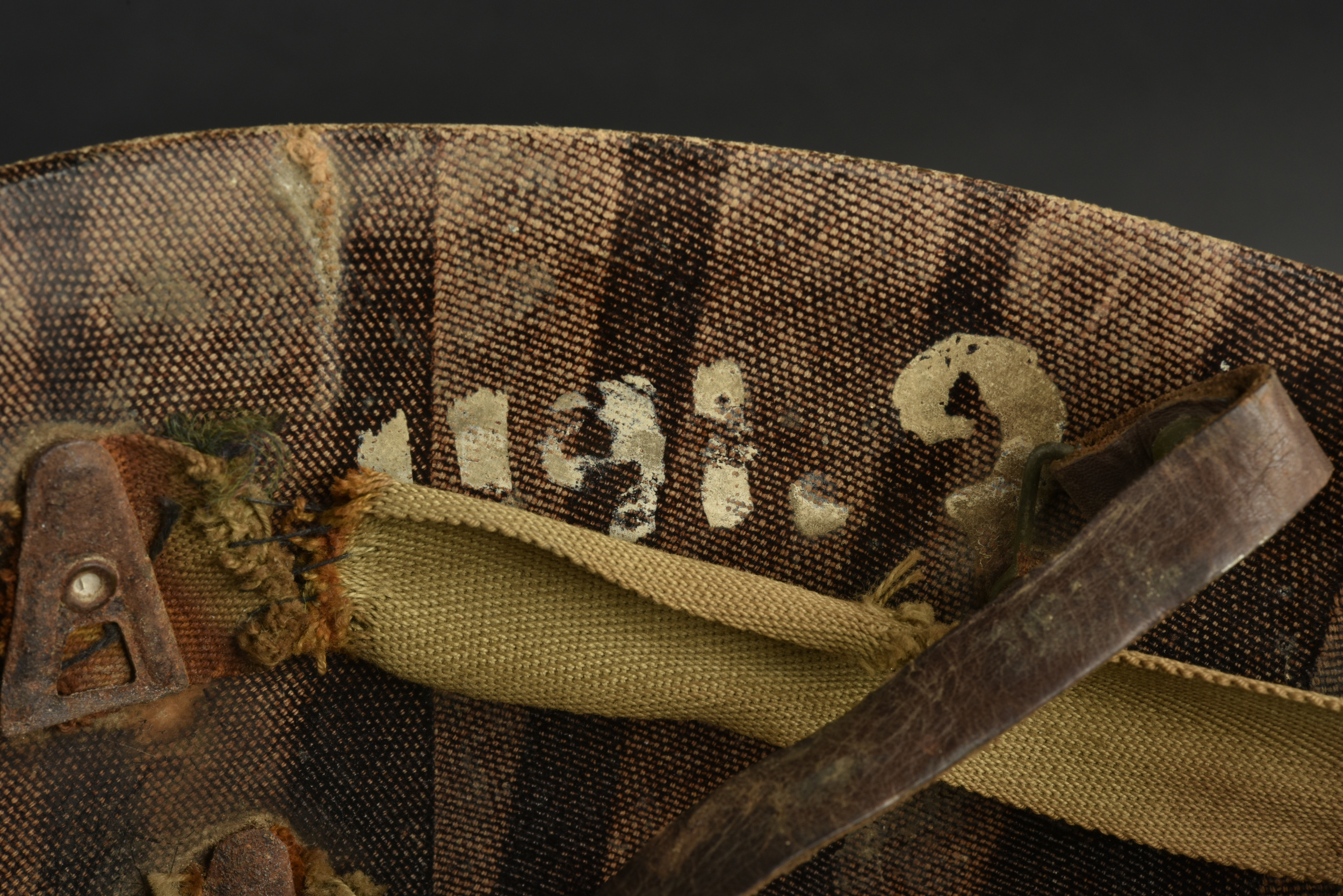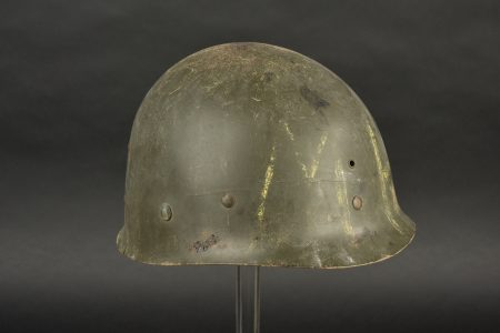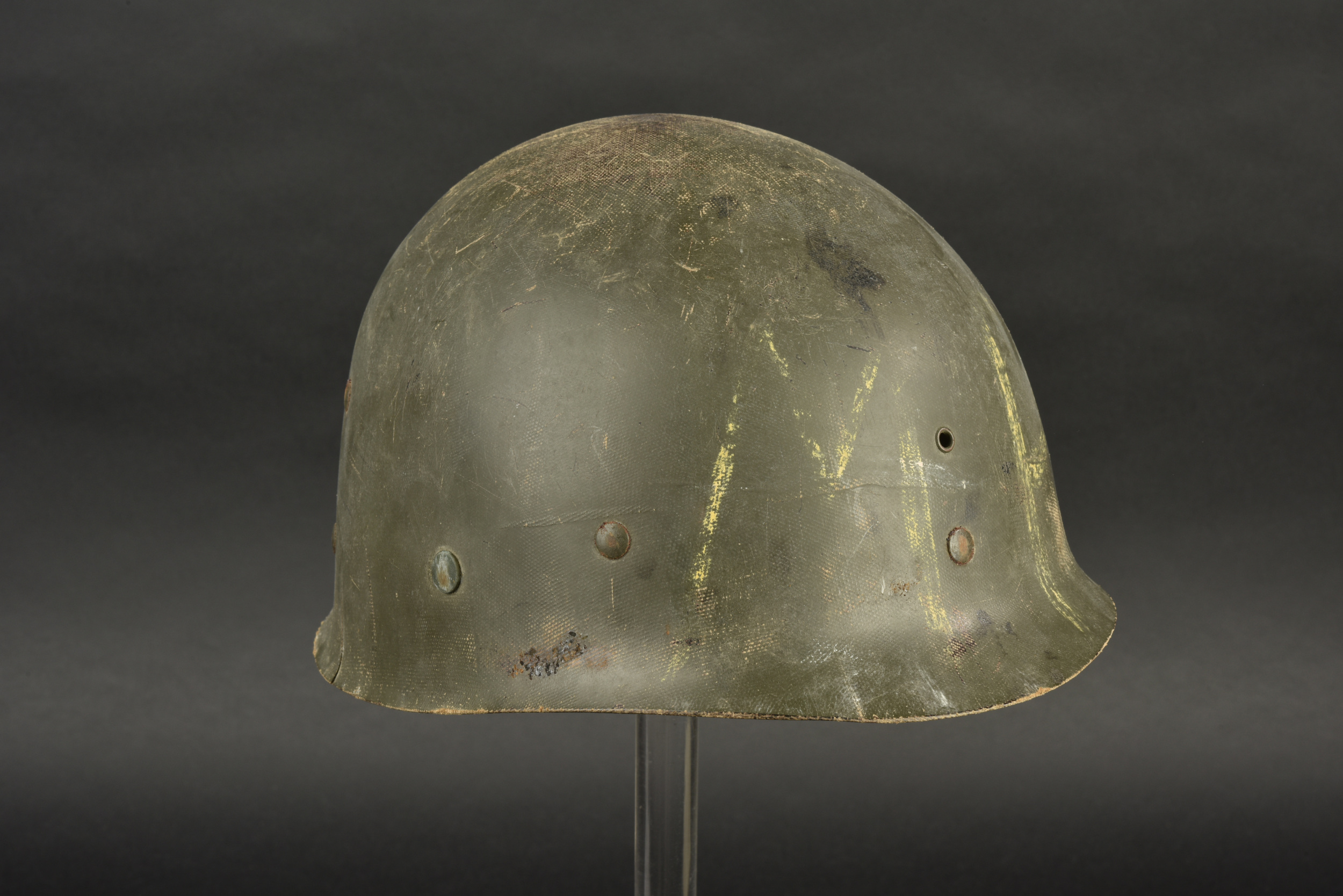 Liner de la military Police US. Liner en matériaux composite haute pression. Fabrication Inland. Coiffe présente mais incomplète. Certaines sangles sont coupées ou déchirées. La nuquière est présente. Le cordon de serrage et le bandeau de sudation sont manquants. Jugulaire en cuir complète sans marquages visibles. Laundry number G-1611, réalisé à la peinture blanche à l’intérieur de la coque. Toutes les pièces métalliques sont fortement oxydées. Peinture extérieure OD7 présente à 70%. Lettrage MP réalisé à la peinture jaune et manuellement sur la face avant de la coque. A noter une certaine usure et patine de la pièce. Etat II+.