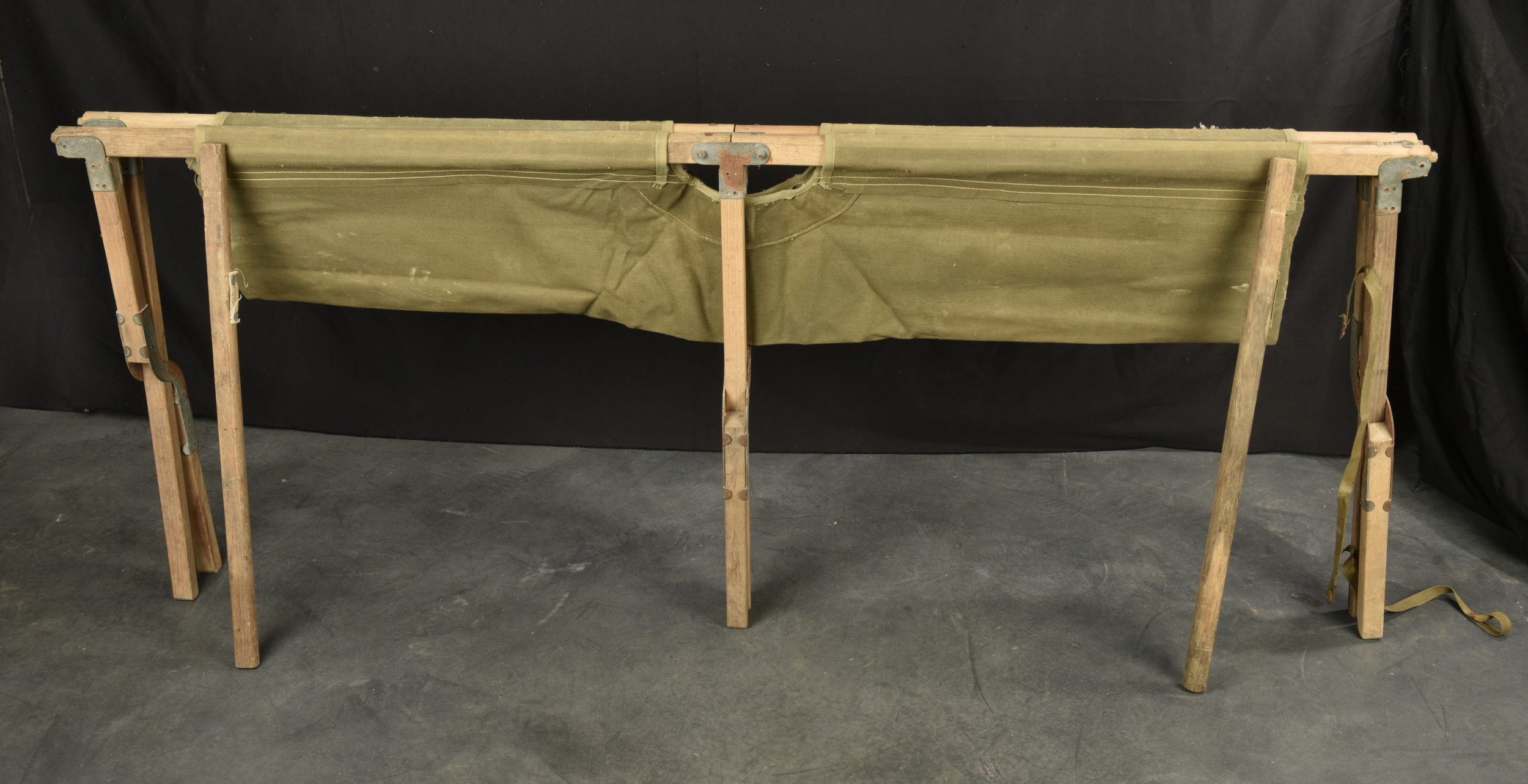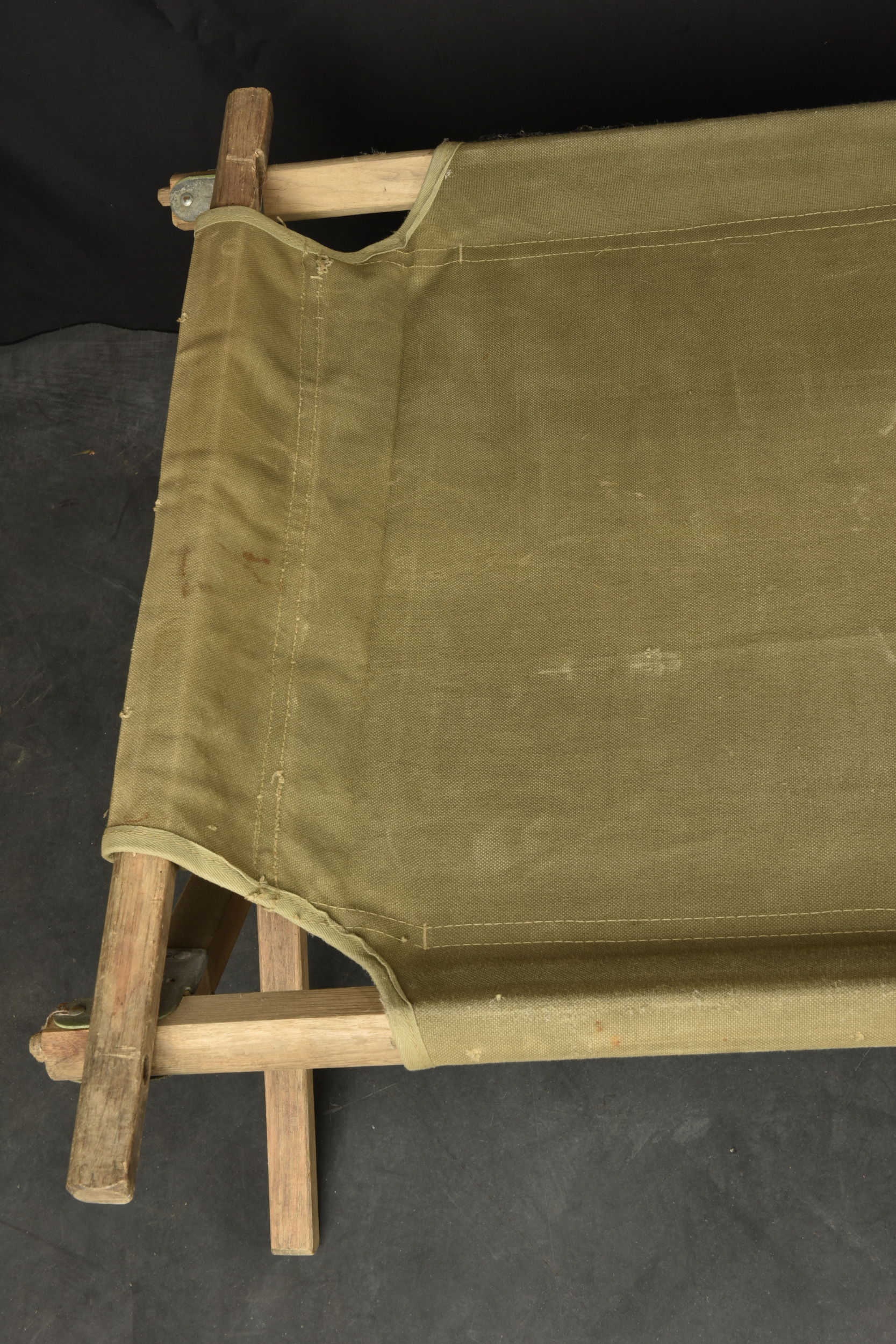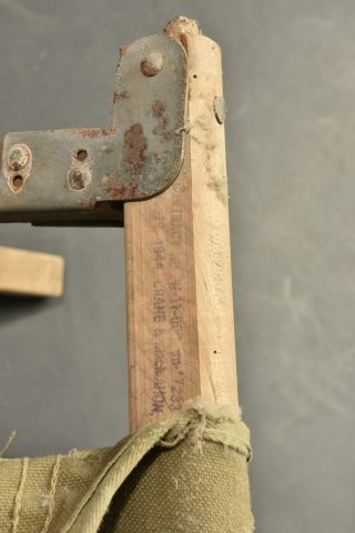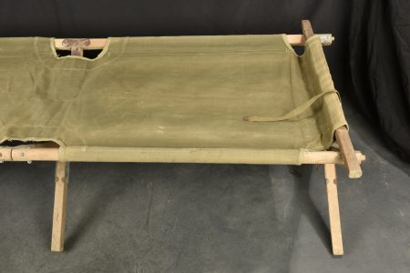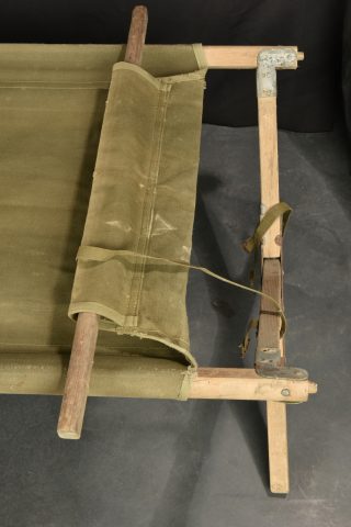 Lit picot US. Armature en bois. Toile OD. Toutes les sangles sont présentes. 1 seule barre de tension en bois, l’autre est manquante. Marquages illisibles. Toutes les pièces métalliques sont oxydées. A noter une certaine usure et oxydation de la pièce. Etat II+.