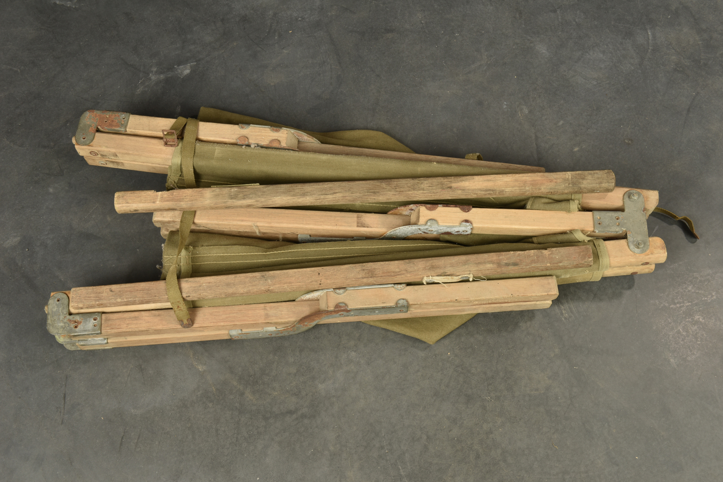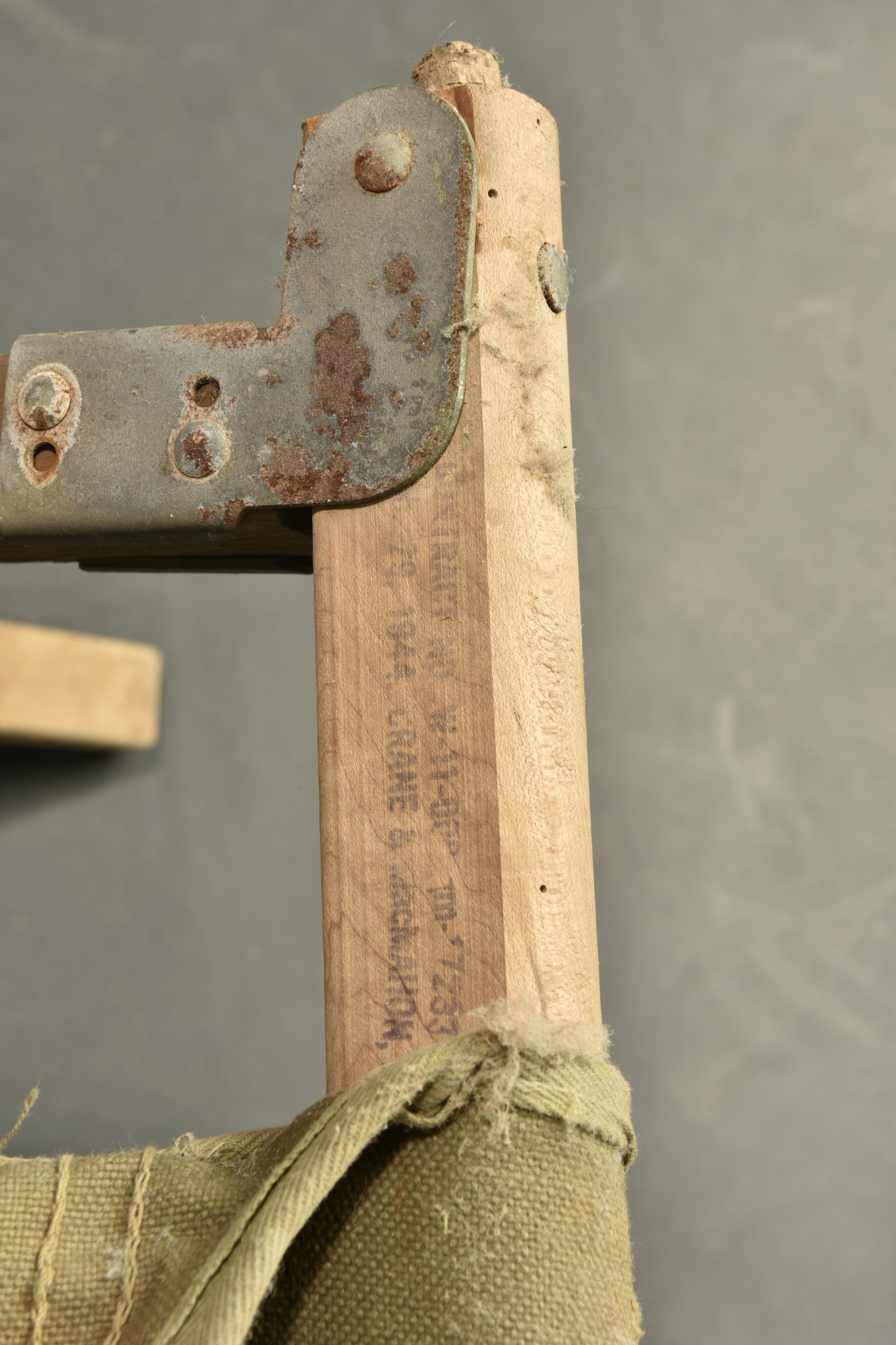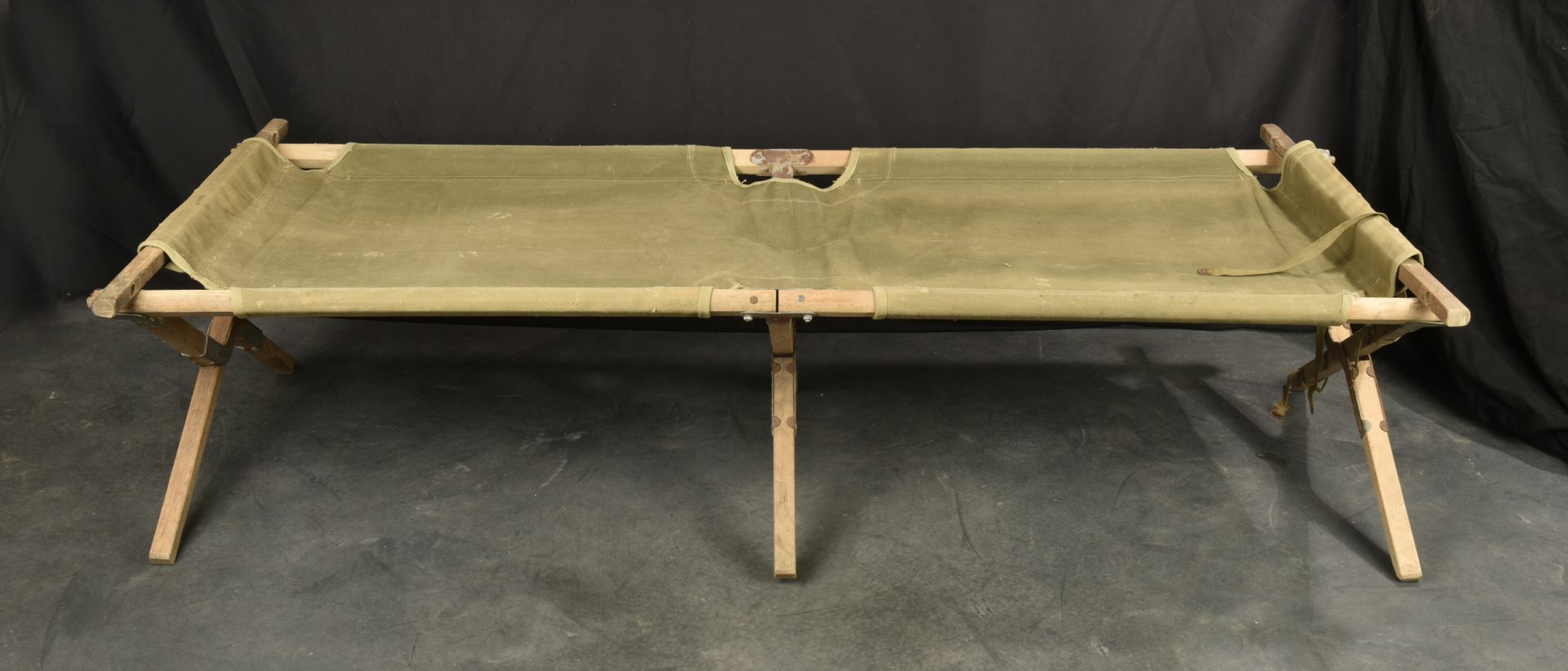 Lit picot US. Armature en bois. Toile OD. Toutes les sangles sont présentes. 1 seule barre de tension en bois, l’autre est manquante. Marquages illisibles. Toutes les pièces métalliques sont oxydées. A noter une certaine usure et oxydation de la pièce. Etat II+.