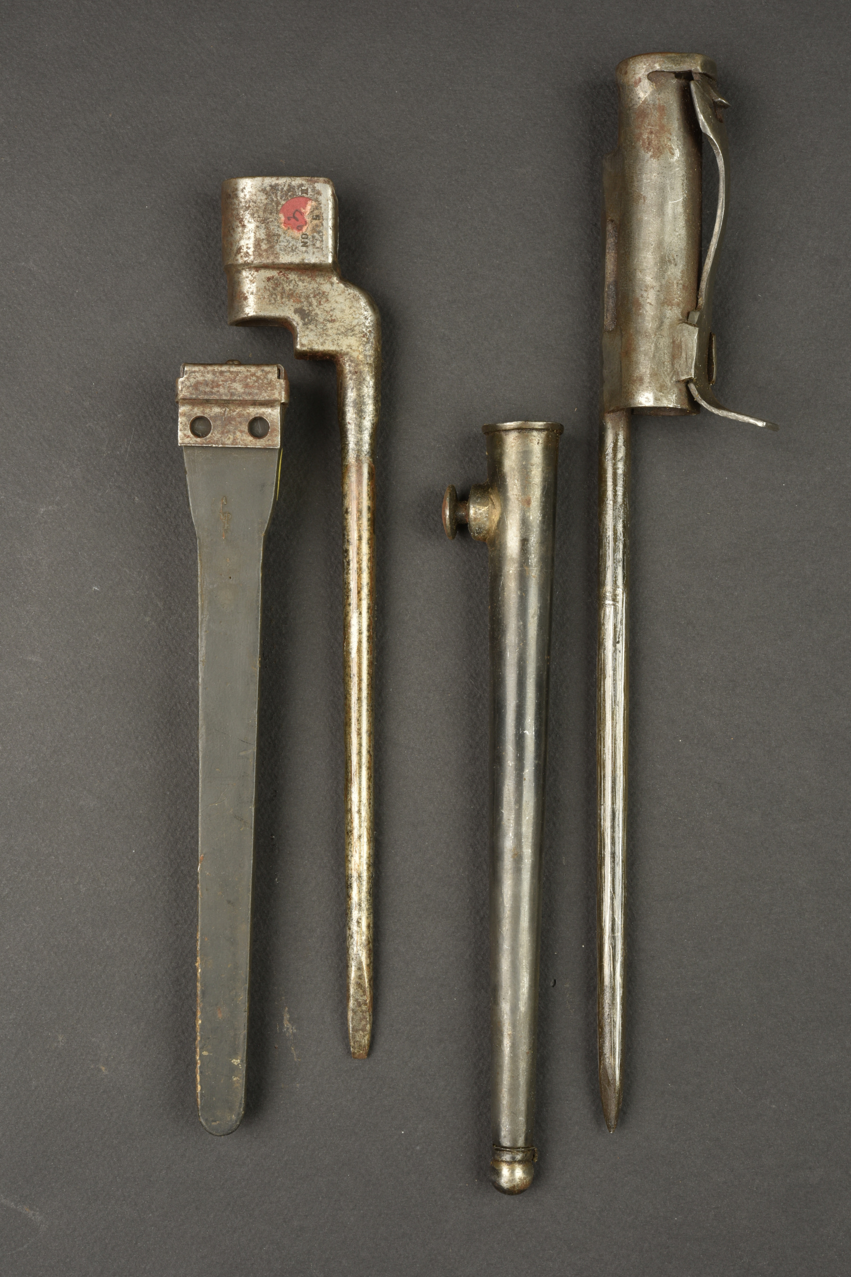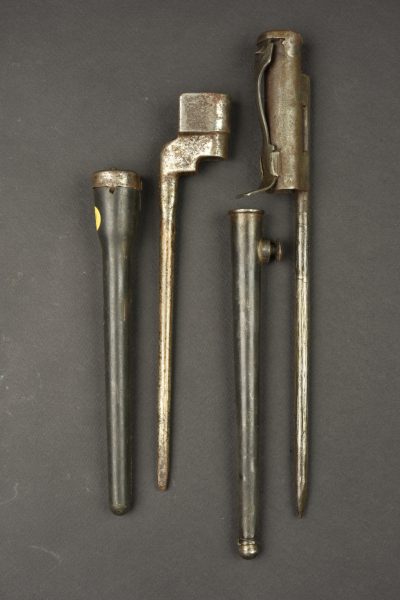 Lot de 2 baïonnettes anglaises clous. Une baïonnette clou n°4 MkII avec fourreau plastique fabrication US sans sa toile. Et une reproduction de baïonnette pour Sten MkII, non marquée. Usure, patine, oxydation légère, à nettoyer
