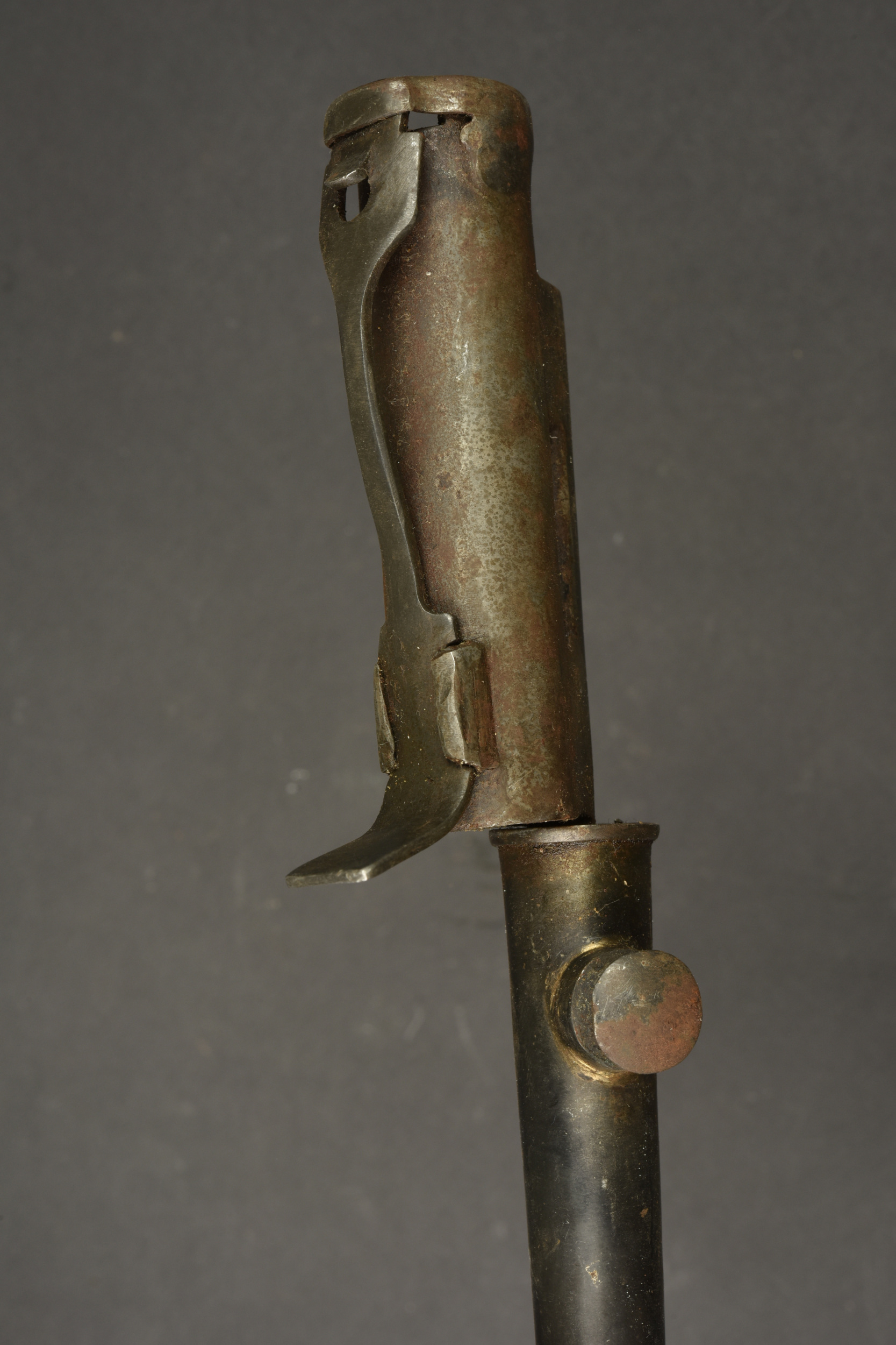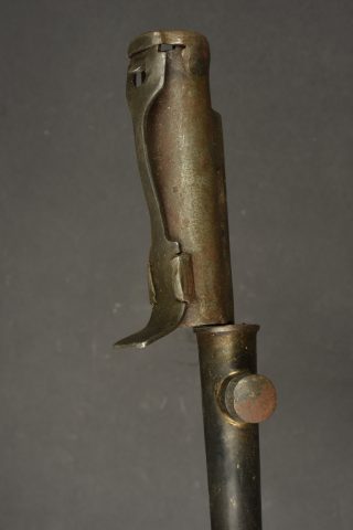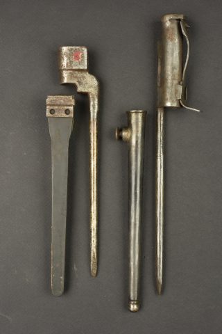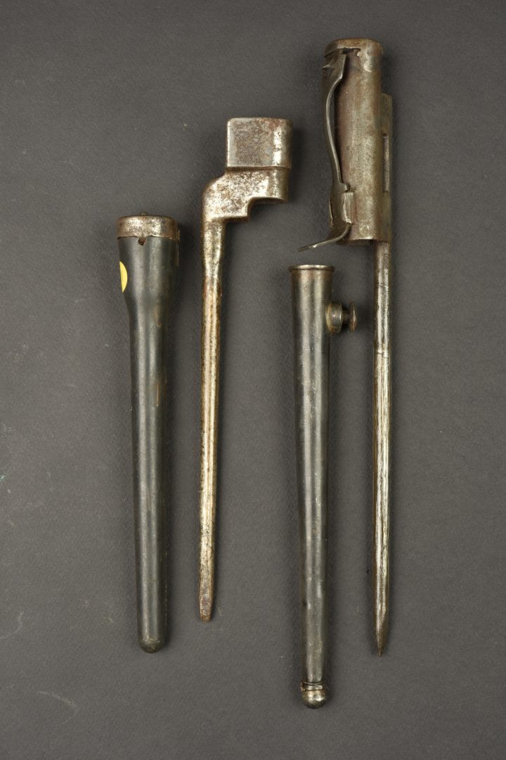 Détails de la vente >Lot de 2 baïonnettes anglaises clous. Une baïonnette clou n°4 MkII avec fourreau plastique fabrication US sans sa toile. Et une reproduction de baïonnette pour Sten MkII, non marquée. Usure,... en savoir plus