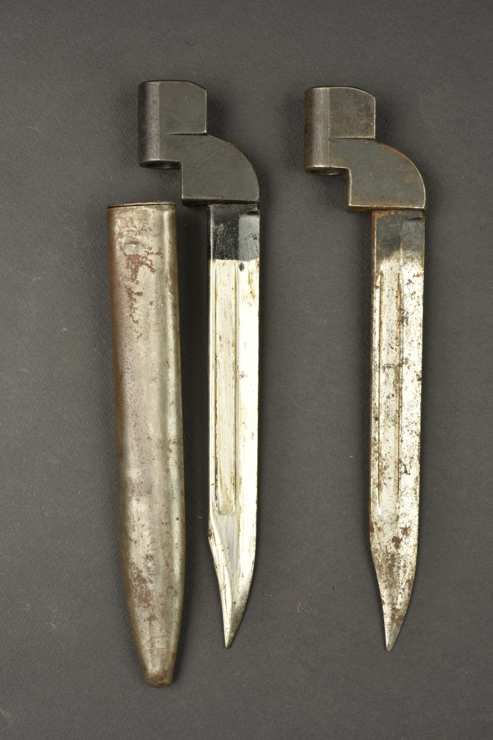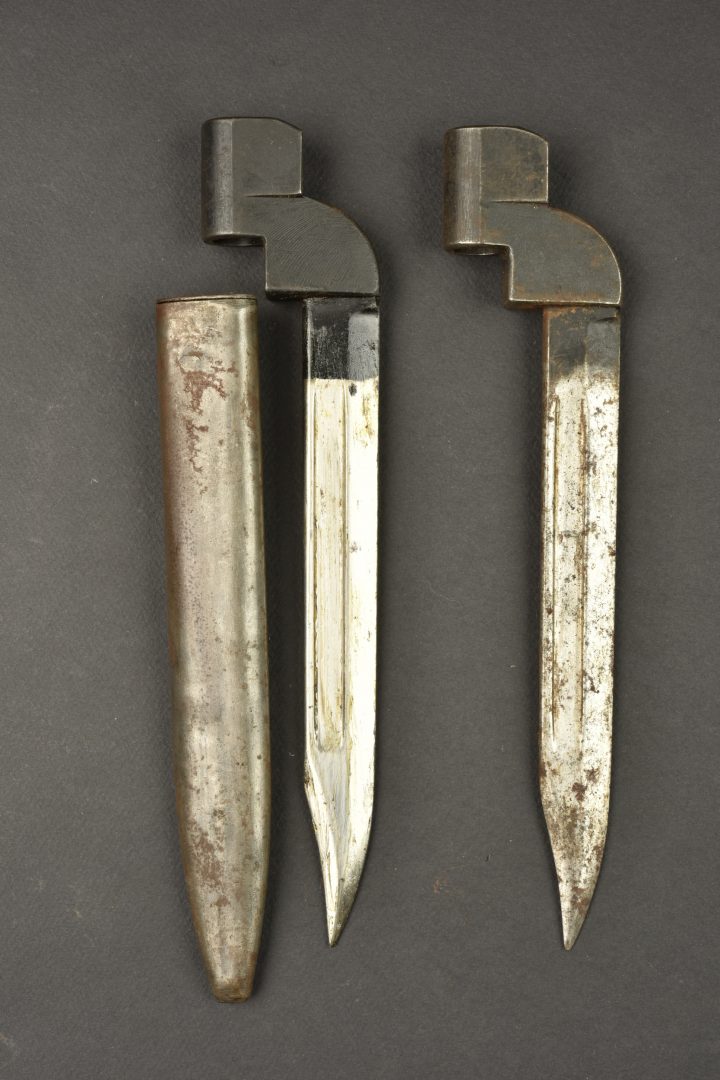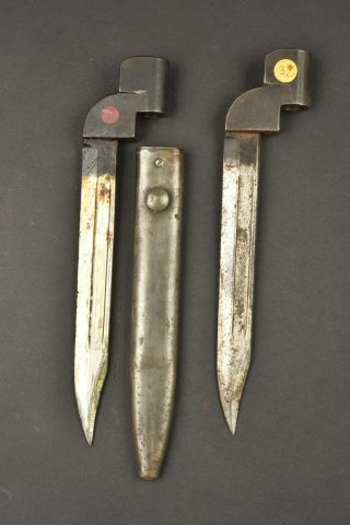 Lot de 2 baïonnettes anglaises numéro 9. 2 baïonnette N°9 MkI, une avec fourreau, datée 1949, l’autre sans fourreau, date non lisible. Usure, patine