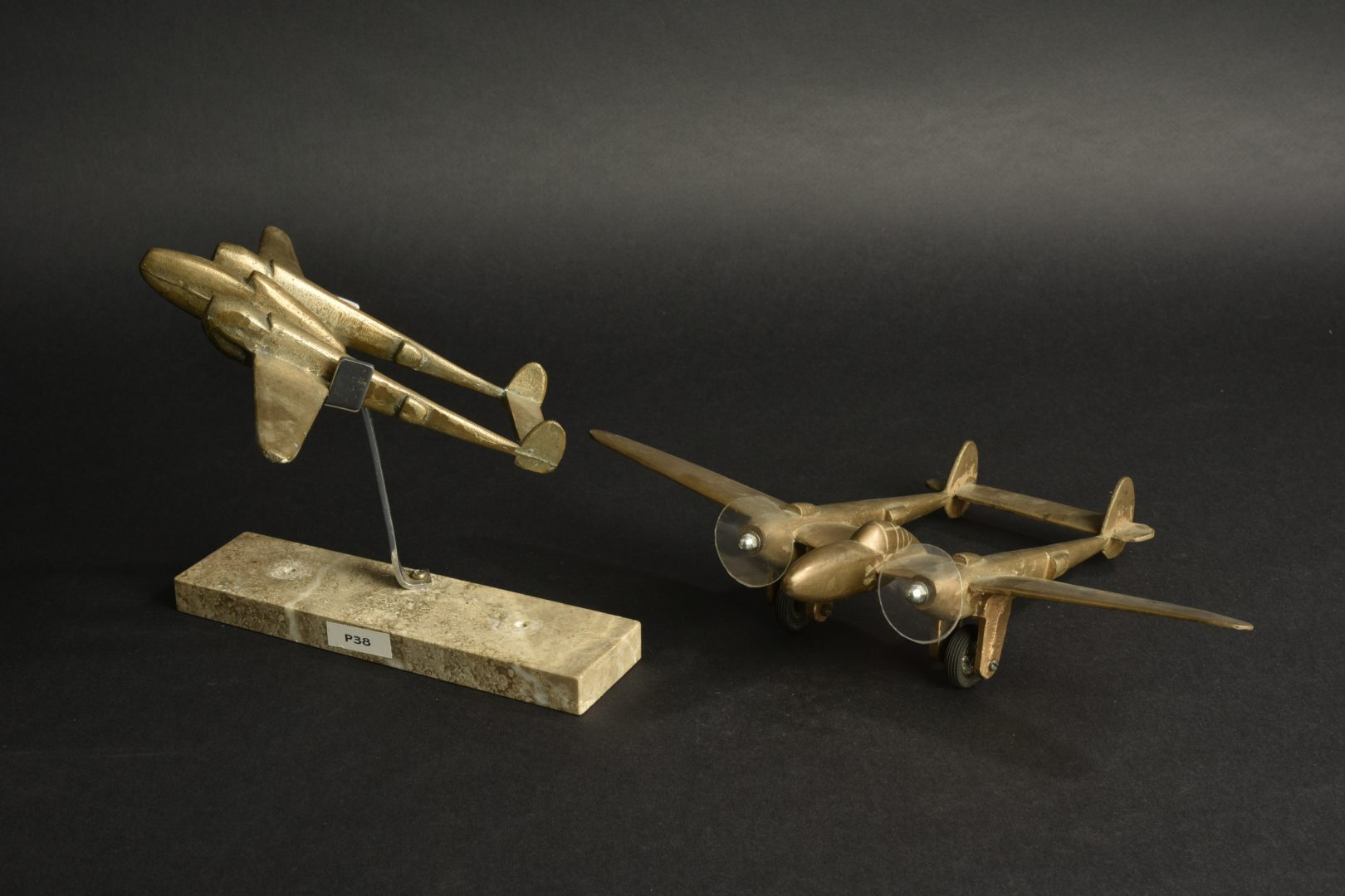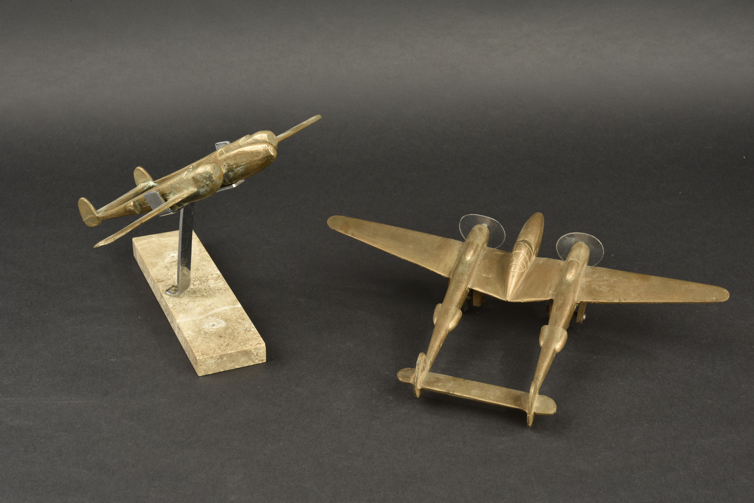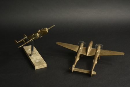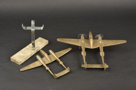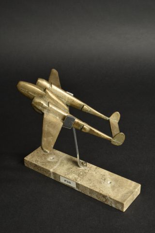 Lot de 2 modèles d’avions américains P38 Lightning en bronze. Un d’une longueur de 23,6 cm x envergure 33,3 cm sur roues avec hélices constituées de disques de plastique. Un second d’une longueur de 19 cm x envergure 27 cm, sur pied et terrasse en pierre. Très décoratif