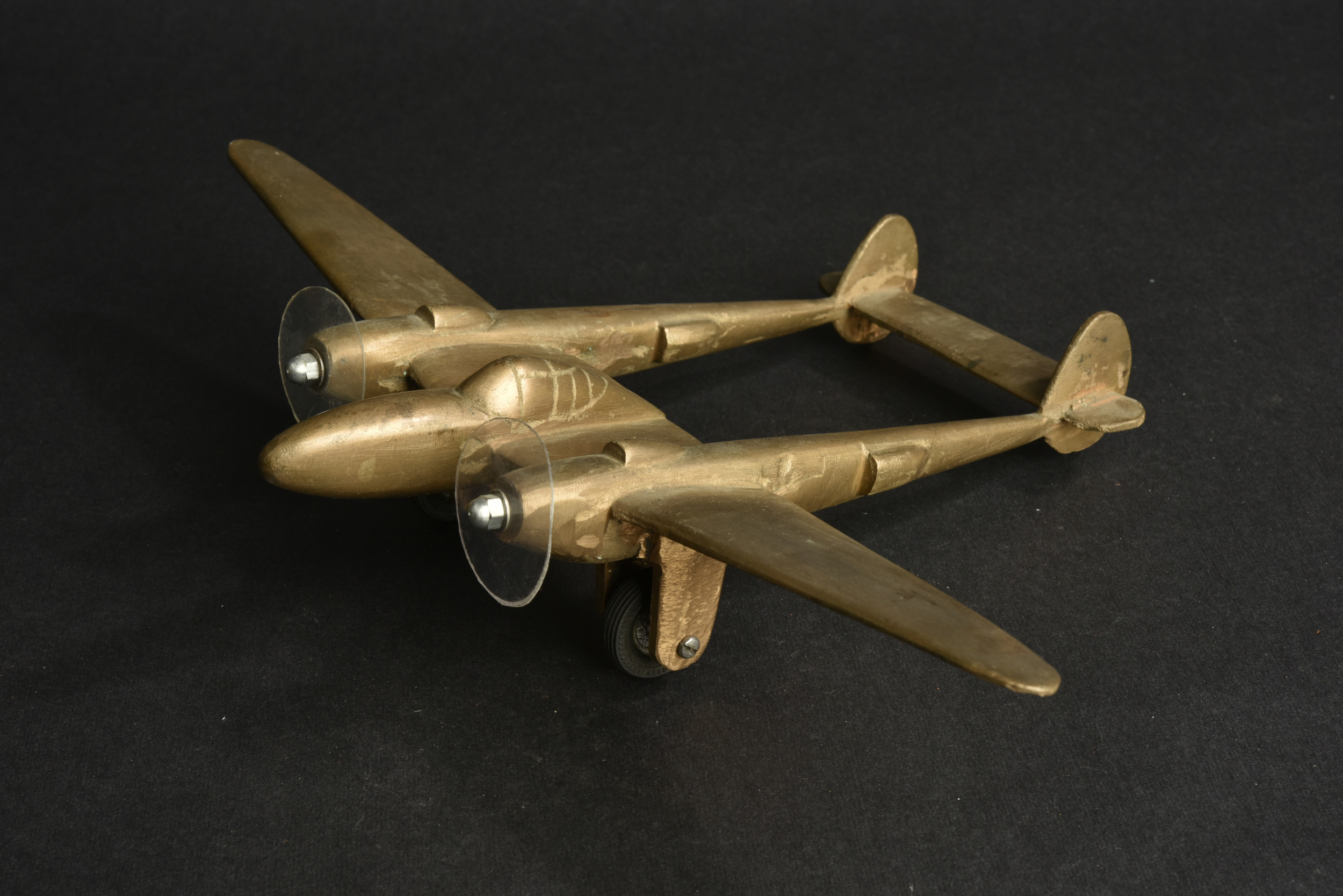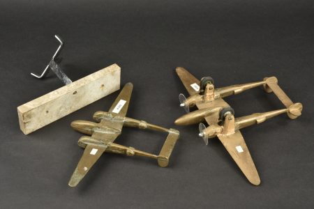 Détails de la vente >Lot de 2 modèles d’avions américains P38 Lightning en bronze. Un d’une longueur de 23,6 cm x envergure 33,3 cm sur roues avec hélices constituées de disques de plastique. Un second... en savoir plus