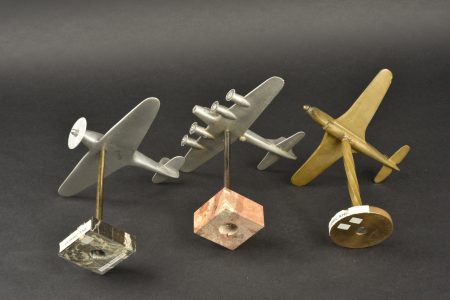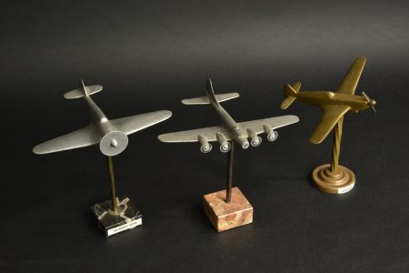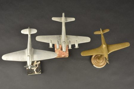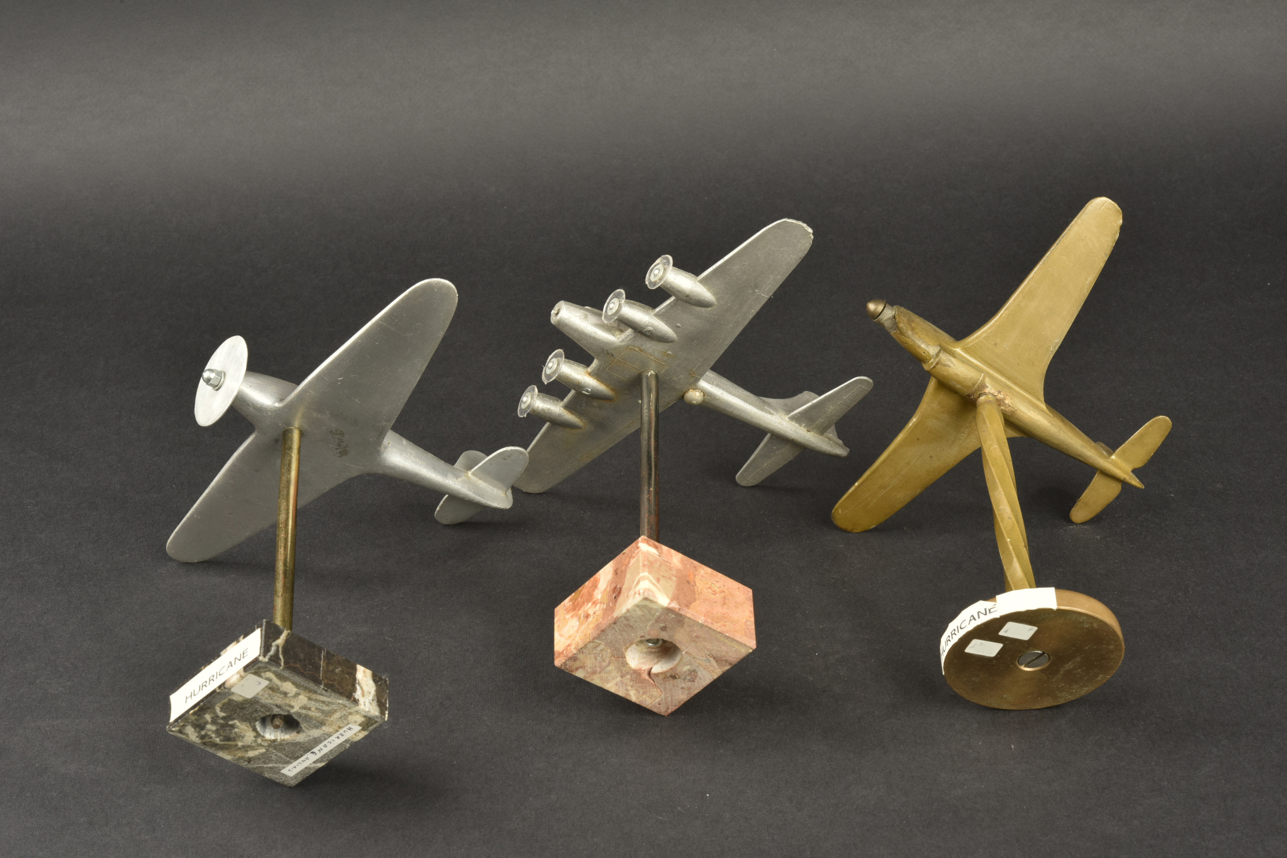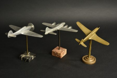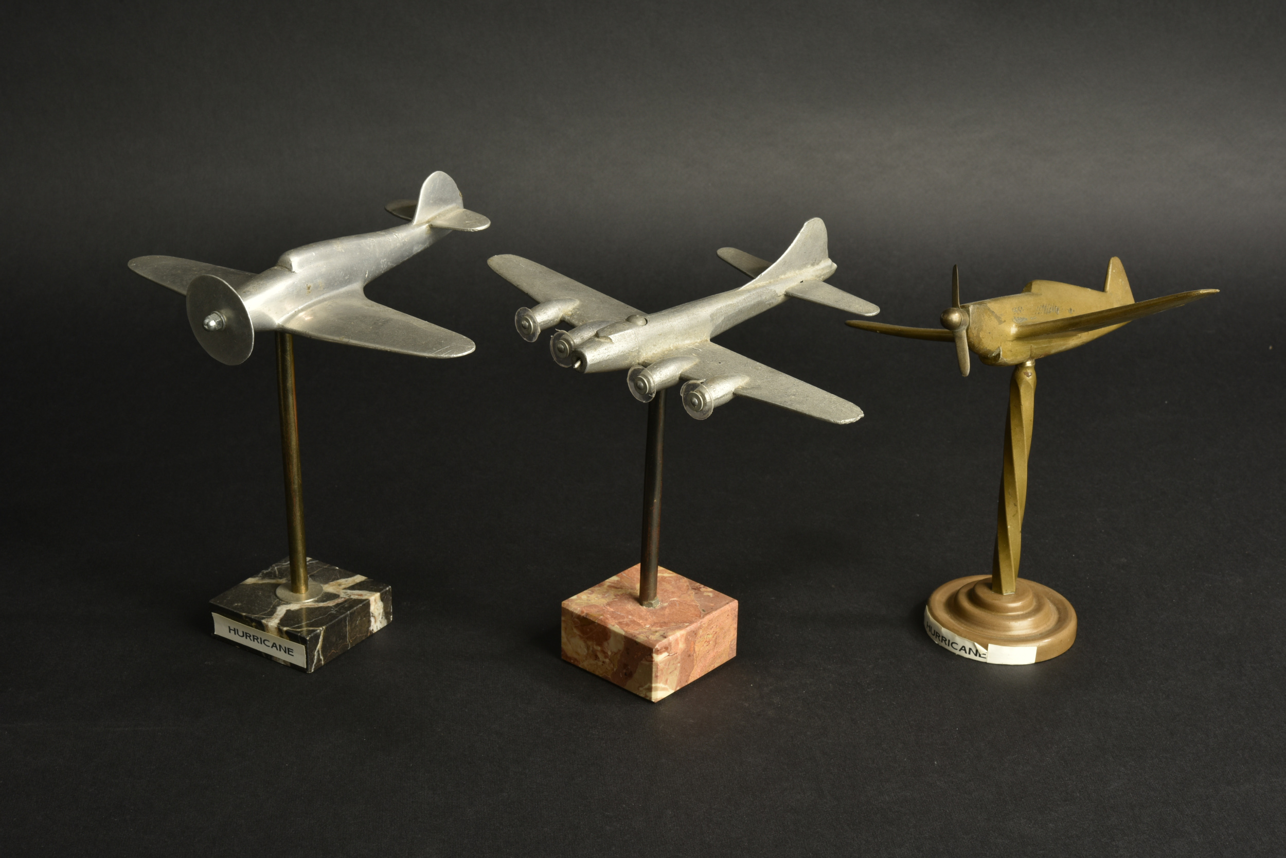 Lot de 2 modèles d’avions anglais Hurricane en bronze et en aluminium. En bronze long de 16 cm x 19,4 cm d’envergure x hauteur avec pied en bronze environ 17,5 cm, et en aluminium long de 16,5 cm x envergure 20,4 cm x hauteur avec pied en pierre environ 19,5 cm. On joint un modèle d’un quadrimoteur en métal blanc sur pied. très décoratif