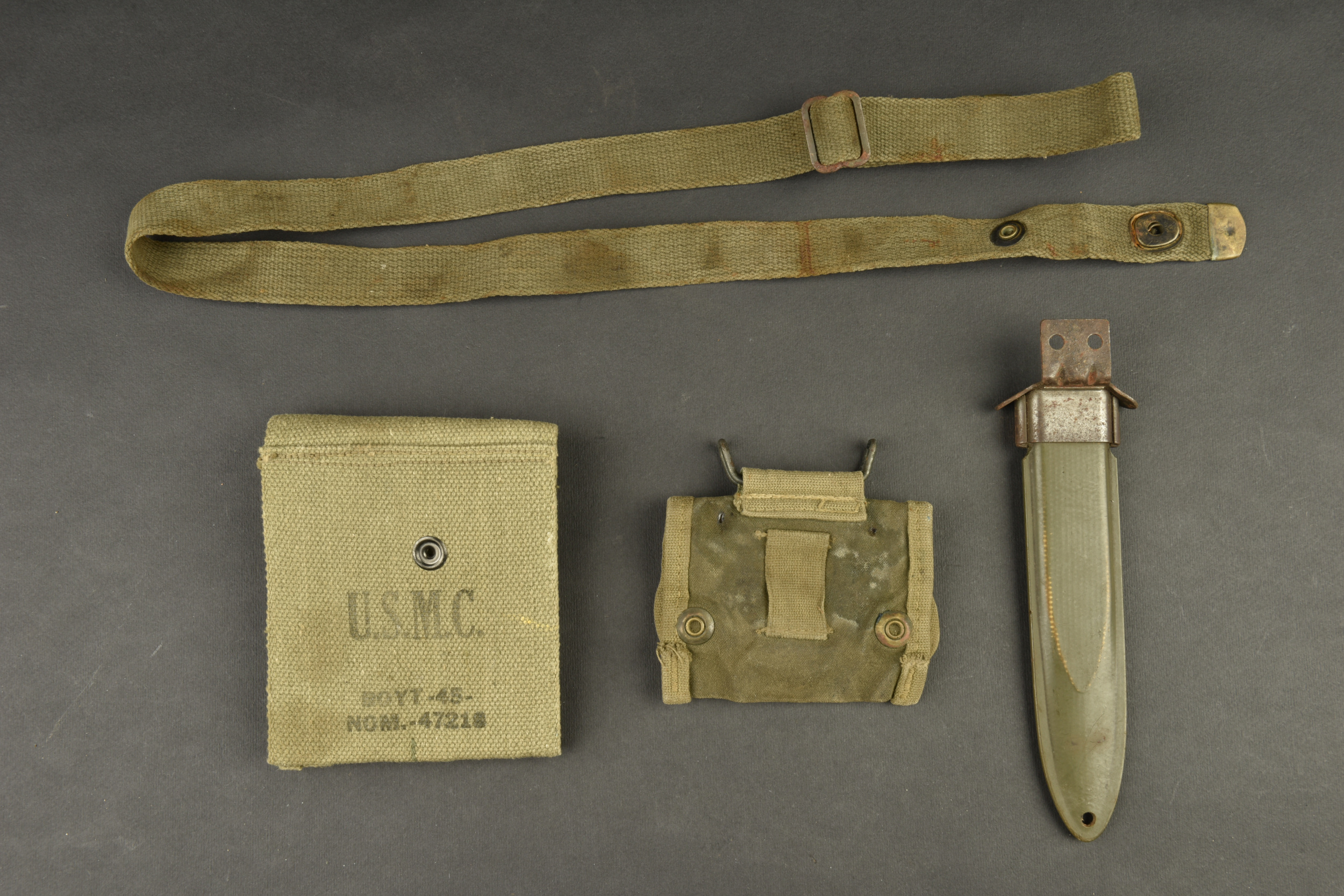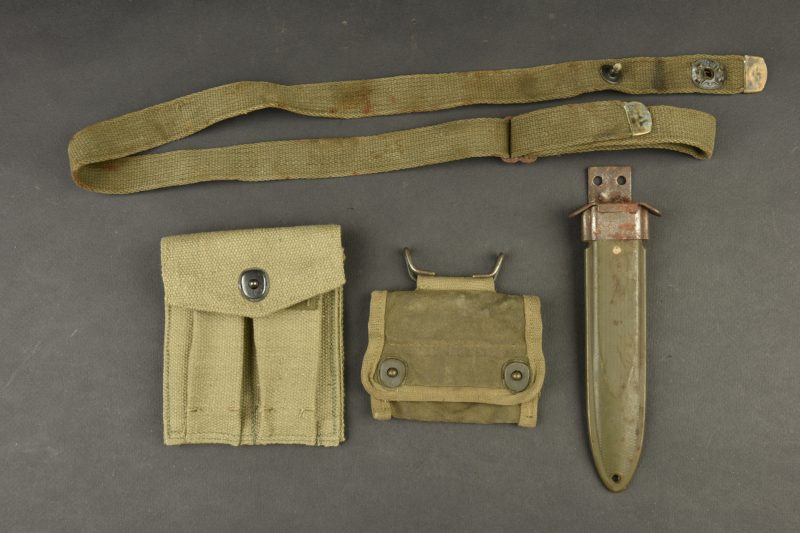 Lot d’équipement US ww2. Composé d’un porte chargeur USMC BOYT 1945, une bretelle de carabine USM1 en toile OD7 pression Klik It, une pochette pour boussole de marche et un fourreau USM8 sans sa toile. Usure, patine.
