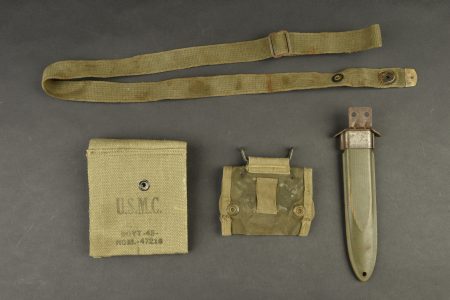 Détails de la vente >Lot d’équipement US ww2. Composé d’un porte chargeur USMC BOYT 1945, une bretelle de carabine USM1 en toile OD7 pression Klik It, une pochette pour boussole de marche et un fourreau... en savoir plus