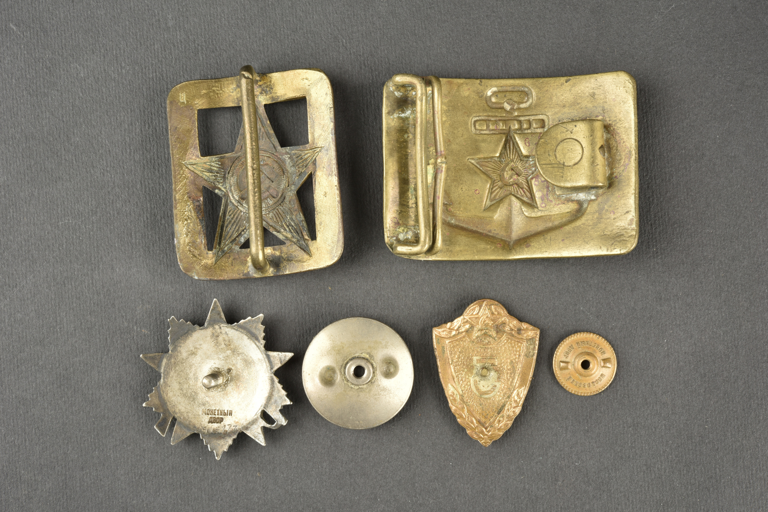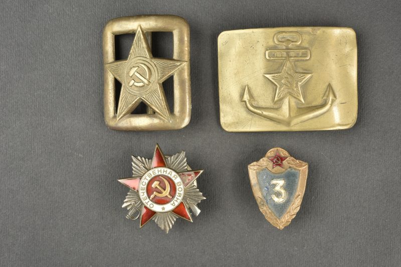Lot d’insignes russe. Comprenant un ordre de la guerre patriotique de seconde classe. En métal émaillé. Attache à vis complète. Numéro 505773 gravé au dos. Fabrication de la monnaie de Moscou. Un insigne de soldat de troisième classe, modèle peint et en métal. Attache à vis complète, fabrication de la monnaie d’Etat de Moscou. Une boucle de ceinturon de la marine russe. Une boucle de ceinturon d’officier russe. A noter une certaine usure et patine des pièces. Etat II+.