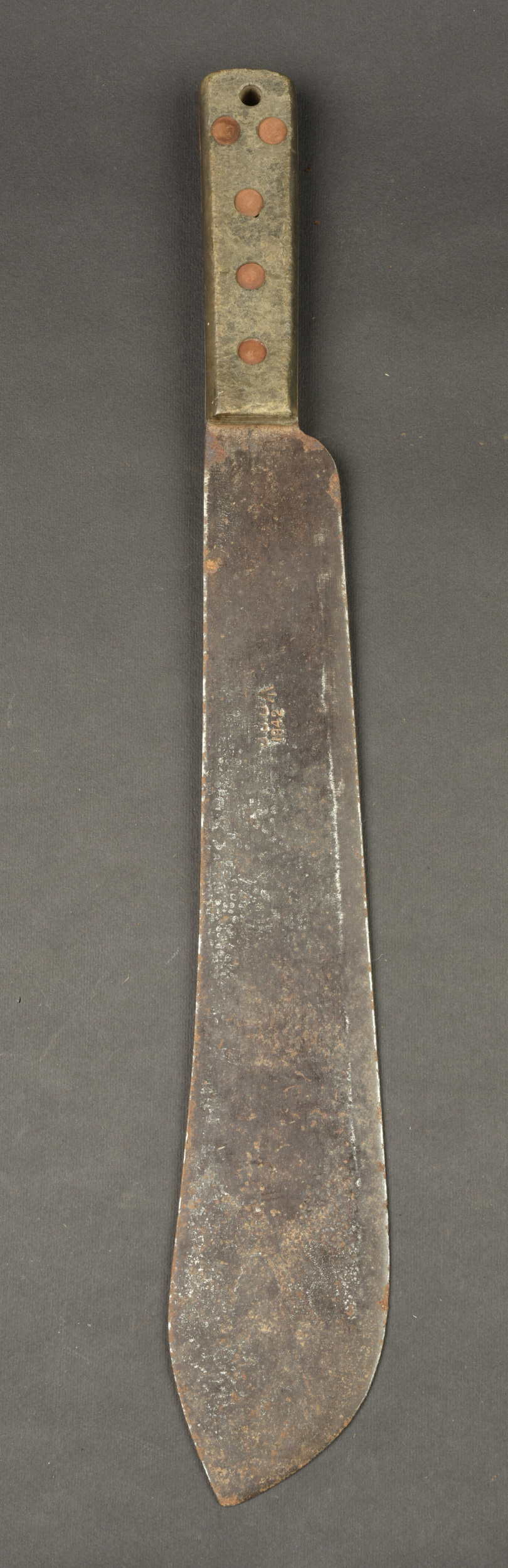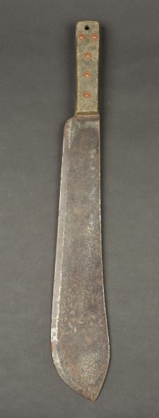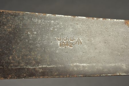 Machette britannique. Plaquettes en bakélite, maintenues par 5 rivets. Lame fortement oxydées. Broad arrow visible et daté 1942. Longueur de la lame 37,5 cm. A noter une certaine usure et oxydation de la pièce. Etat II+.