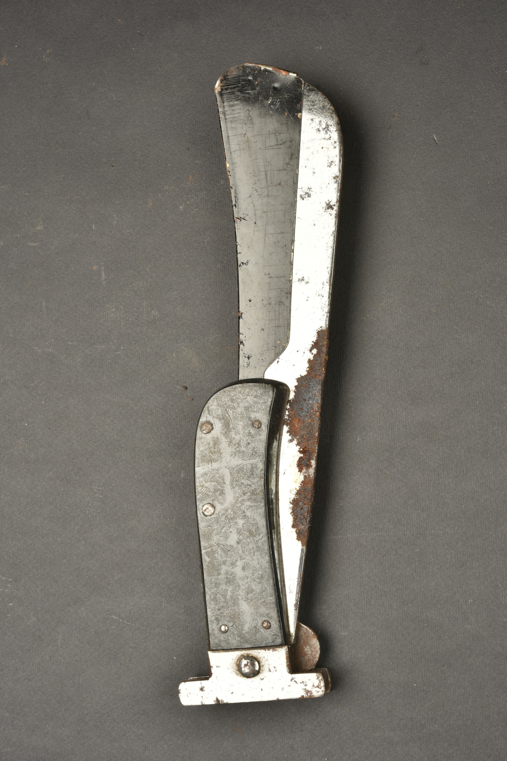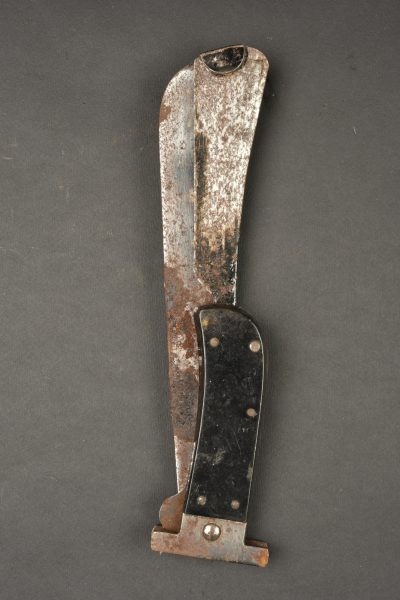 Machette britannique. Plaquettes en bakélite noire. Lame pliante. Fortement oxydée. Protège lame en métal. Cordon en cuir complet avec son mousqueton. A noter une certaine usure et patine de la pièce. Etat II+.