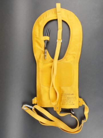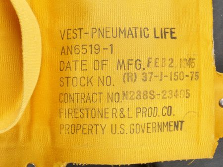 Mae Vest AN 6519-1. En toile jaune. Toutes les sangles sont présentes. Toile souple. Les bombonnes de gonflage automatique sont présentes avec leurs cordelette. Les tuyaux de gonflage en caoutchouc sont présents. Fabrication Firestone R&L Prod Co, datée du 2 février 1945. A noter une légère usure et patine de la pièce, ainsi que quelques tâches. Etat I-.