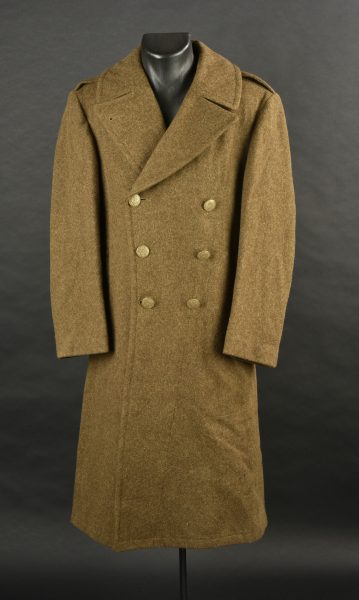 Manteau troupe US. En épais drap de laine kaki. Tous les boutons en matière plastique sont présents. Intérieur doublé en tissu coton kaki. Taille 36R. Laundry number H-6402, inscrit dans le col de manière manuscrite. Etiquette du fabricant Spirn Hirschenfang & Schwander inc. Datée du 3 décembre 1942. A noter une légère usure et patine de la pièce, ainsi que quelques discrètes traces de mite. Etat II+.