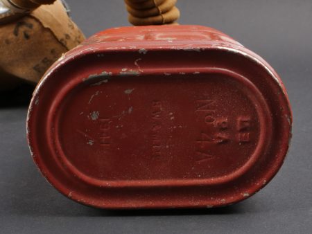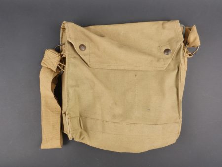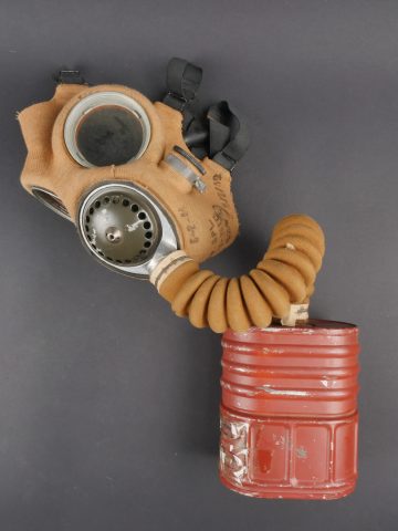Masque anti-gaz britannique. Premier type. Masque en caoutchouc recouvert de toile beige. Toutes les sangles sont présentes. Marquages avec broad arrow. Daté du 25 février 1942. Flexible présent. Filtre daté 1941. Housse en forte toile coton beige. Les boutons pressions sont fonctionnels. Marquages canadien sous le rabat, daté 1943, sangle de transport présente. A noter une certaine usure et patine de la pièce. Etat II+.