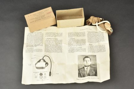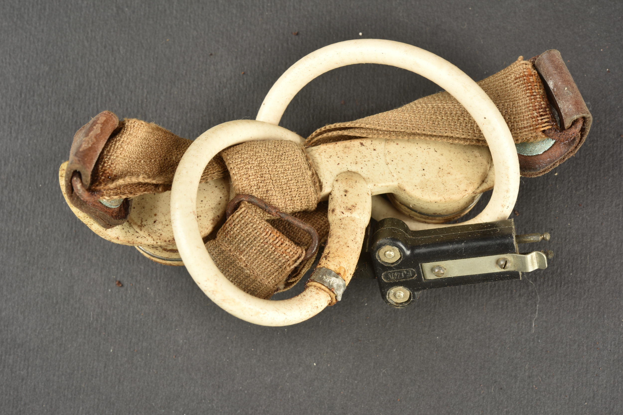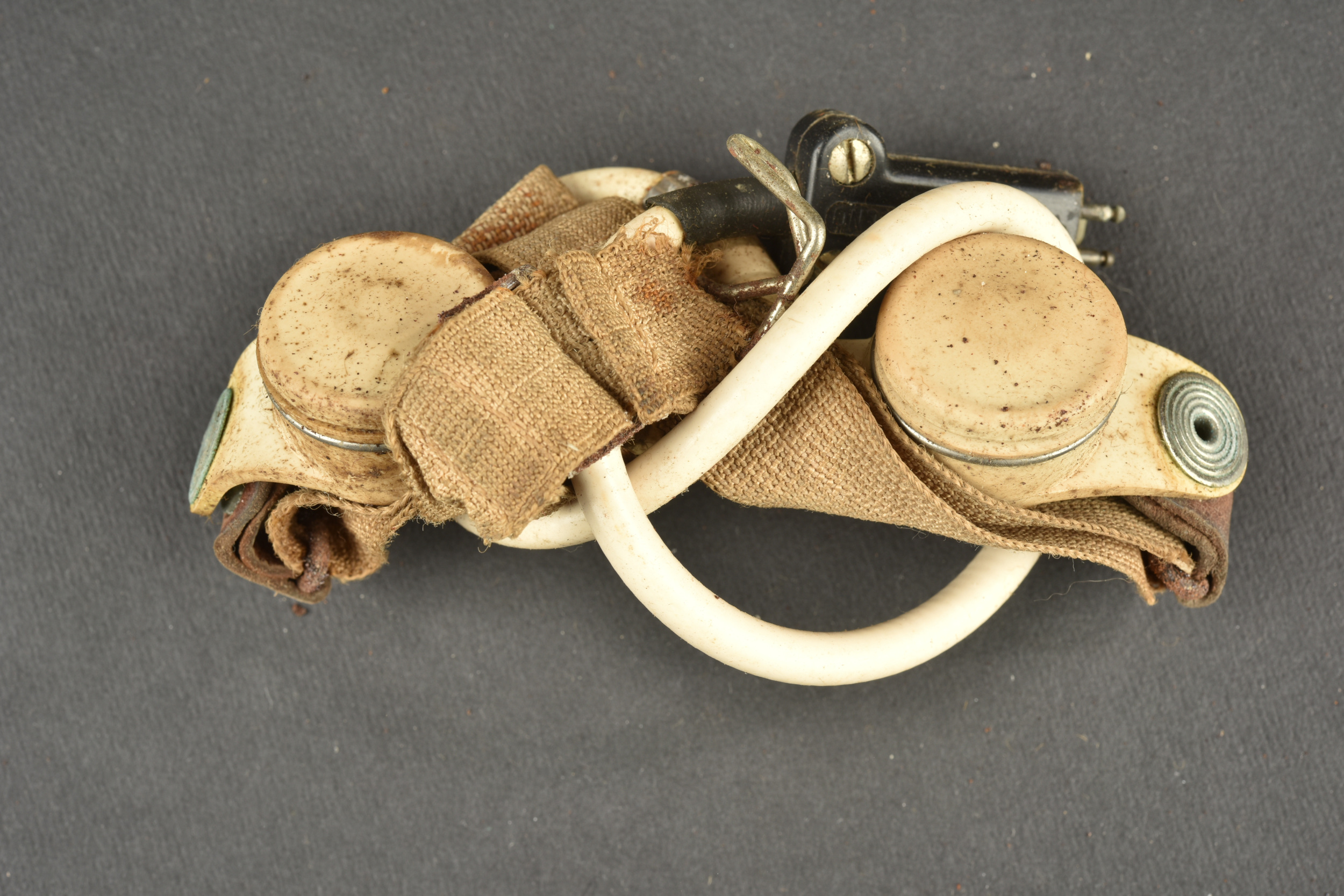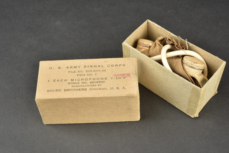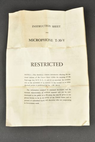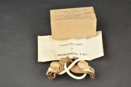 Microphone T-30-V. Belle boite en carton complète. Couvercle marqué US Army Signal Corps Fil No 295 Day 44 1 Each Microphone T-30-V Shure Brothers Chicago USA. Laryngophone complet avec son câble et sa prise, de couleur blanc. Les sangles de fixation sont complètes. Notice d’utilisation complète. A noter une certaine usure et patine de la pièce. Etat II+.