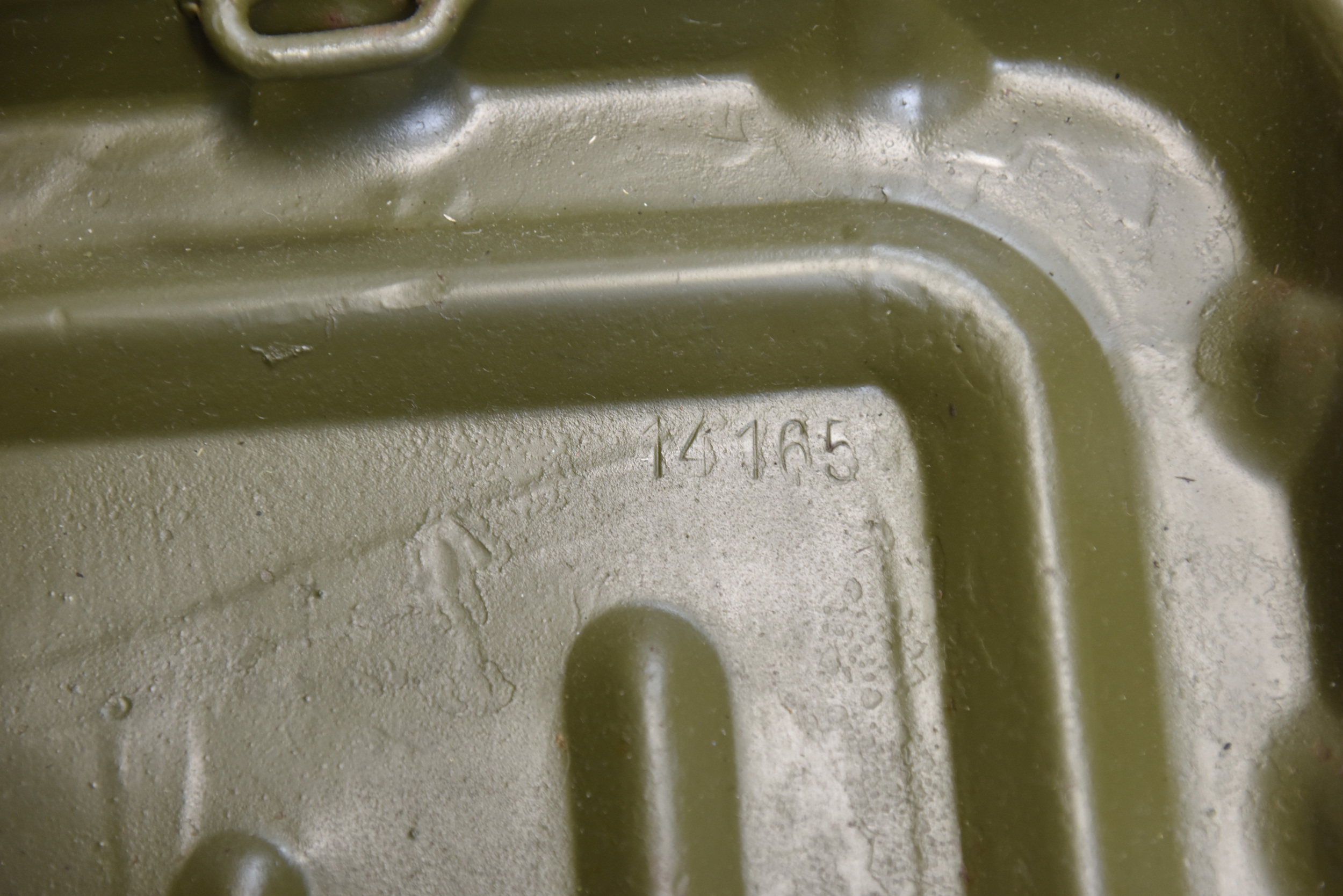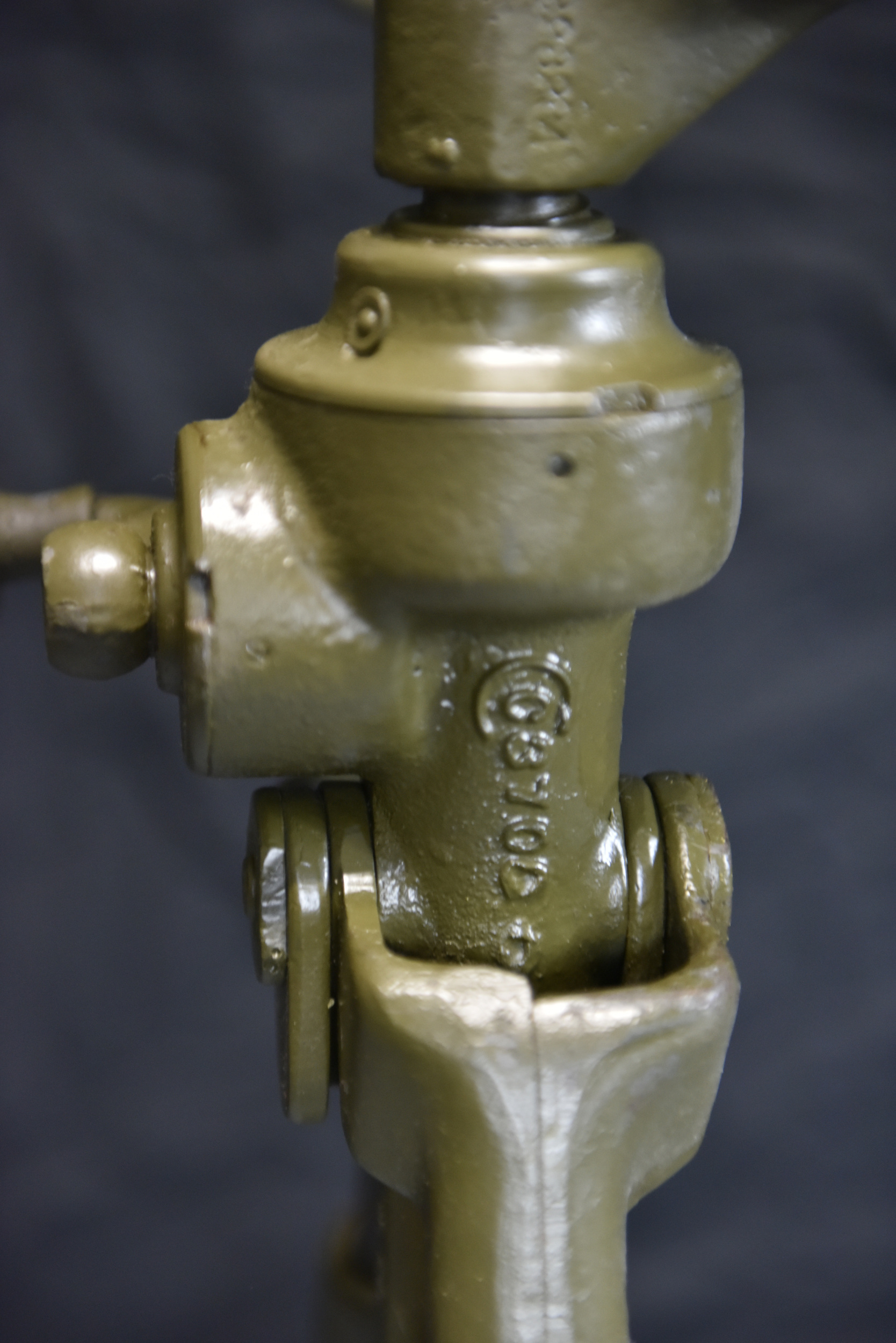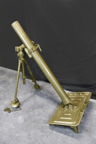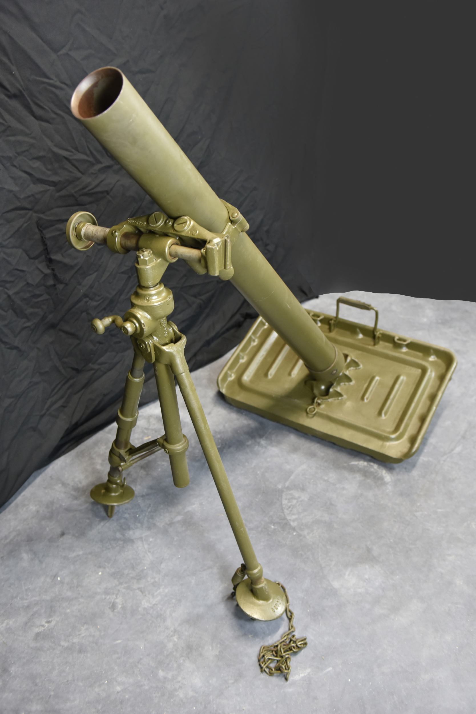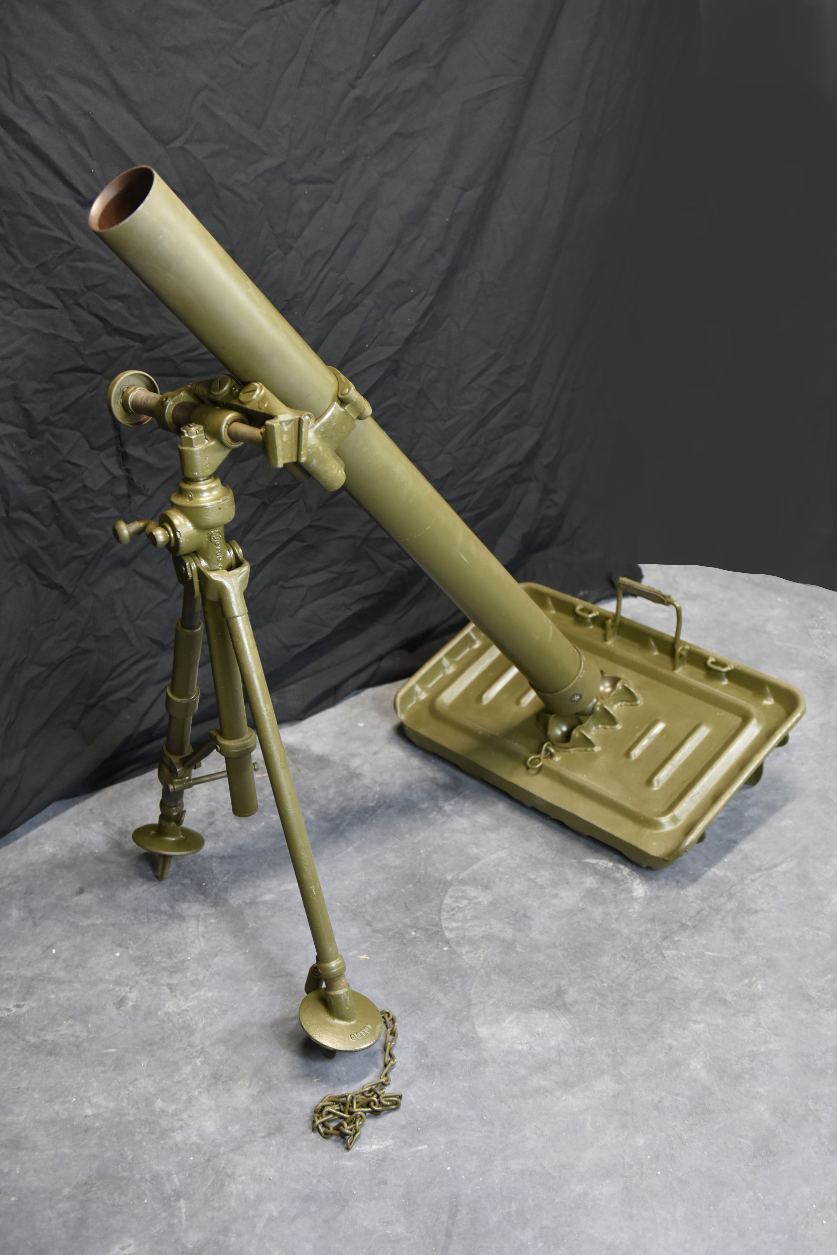 Mortier US M1 81mm. Plaque en métal complète, trois modes de positionnement. Poignée de transport en métal avec son renfort en cuir. Marquages 14165. Tube en métal, lisse, peinture kaki à 80%. Numéro BNE795. Bipied complet, toutes les pièces mobiles sont fonctionnelles. Peinture kaki à 80%. Marquage D 7Z28292. Chaîne complète avec son crochet. Collier de serrage marqué B8626. Plaque portant l’inscription Mount Mortar 81 mm M4, numéro 31968, Ord Dept USA PSCM CO 1945 Insp ACP. La peinture kaki est probablement postérieure. Catégorie C9. Arme neutralisée aux nouvelles normes européenne par le Banc d’épreuve de Saint Etienne. Cette arme doit être déclarée avec Cerfa et certificat médical de moins de 1 mois ou licence de tir tamponnée ou permis de chasse valide (art R312-56). La délivrance de l’arme n’aura lieu qu’après consultation du fichier Finadia. L’inscription de l’acheteur sur ce fichier entrainera automatiquement la nullité de la vente. A noter une certaine usure et patine de la pièce. Etat II+.
