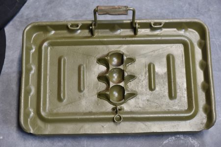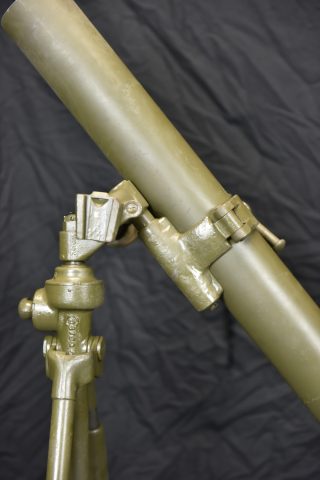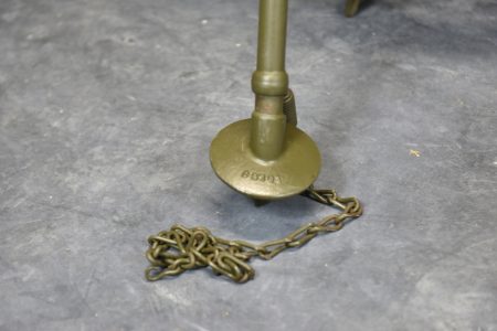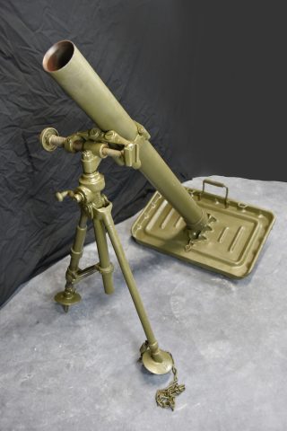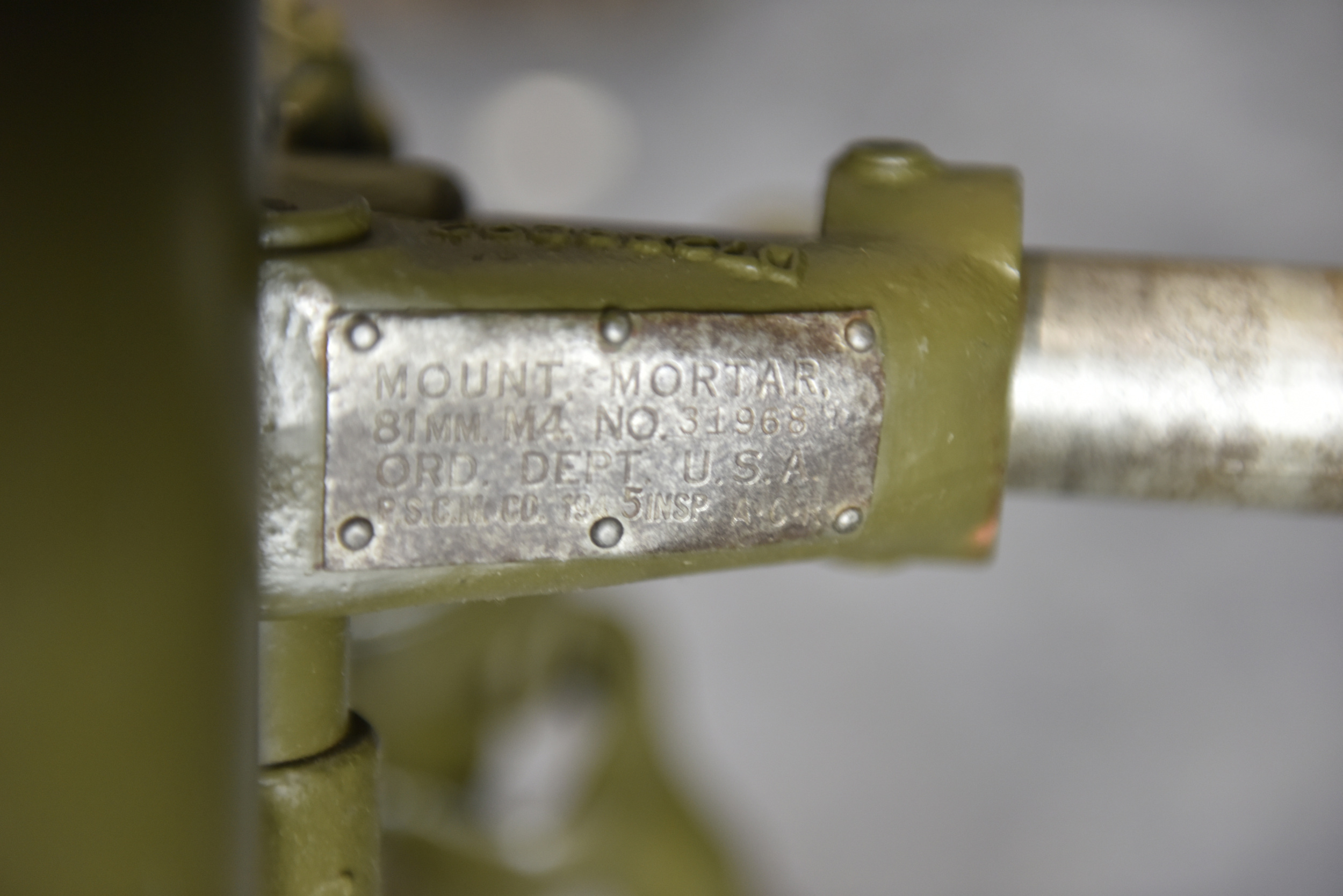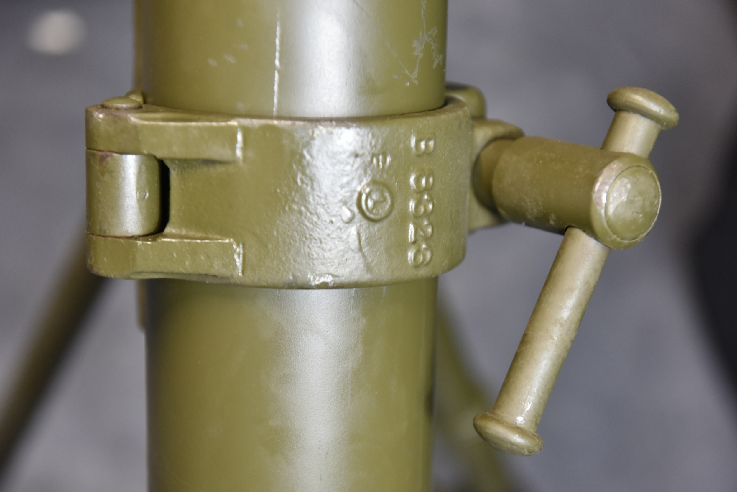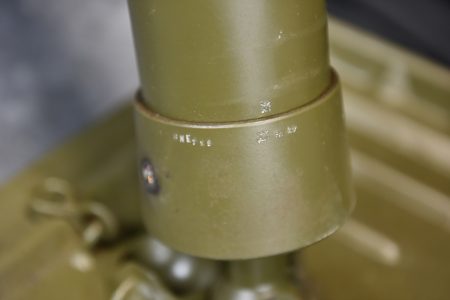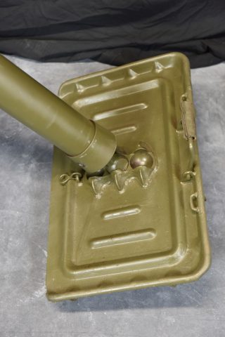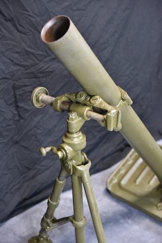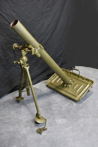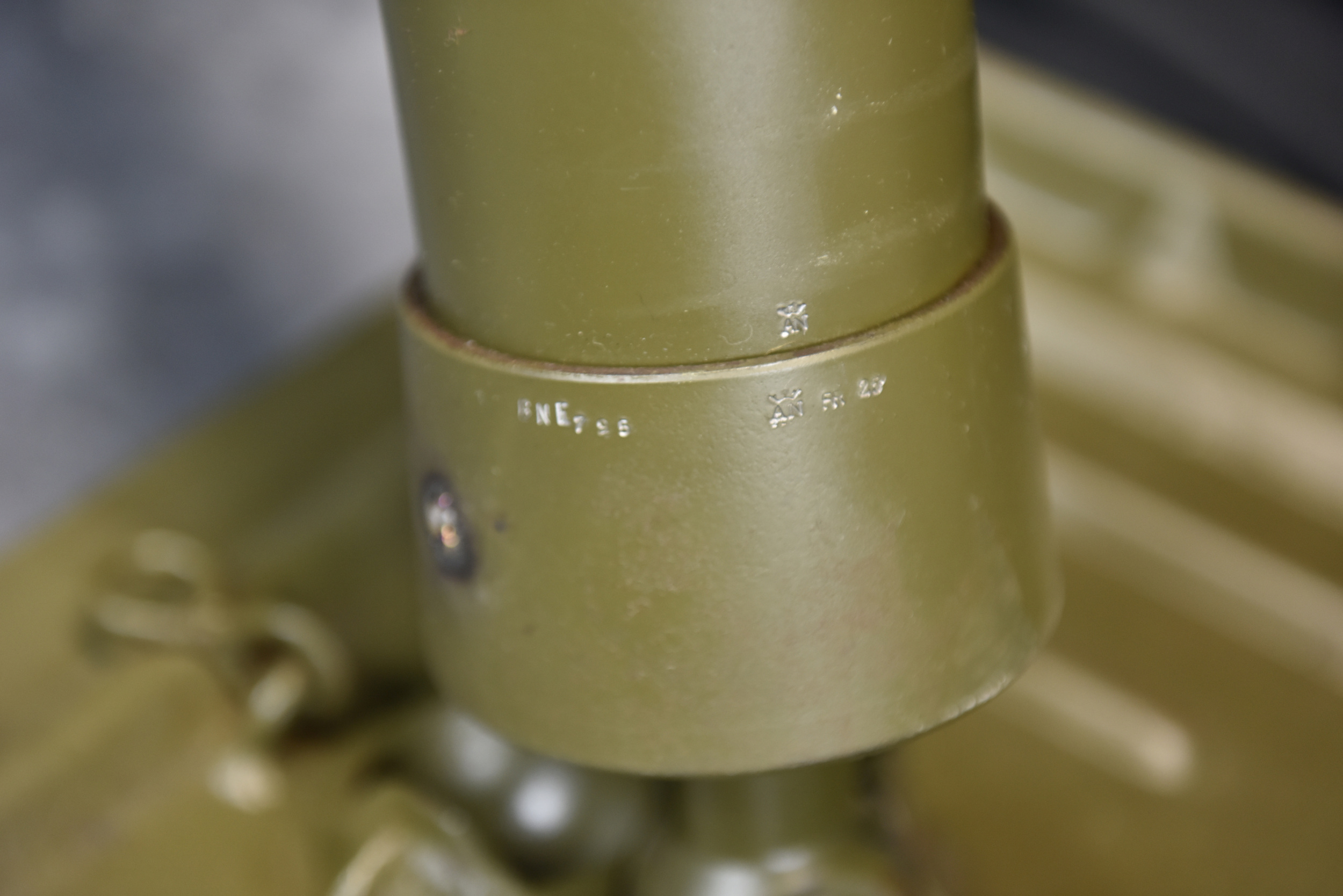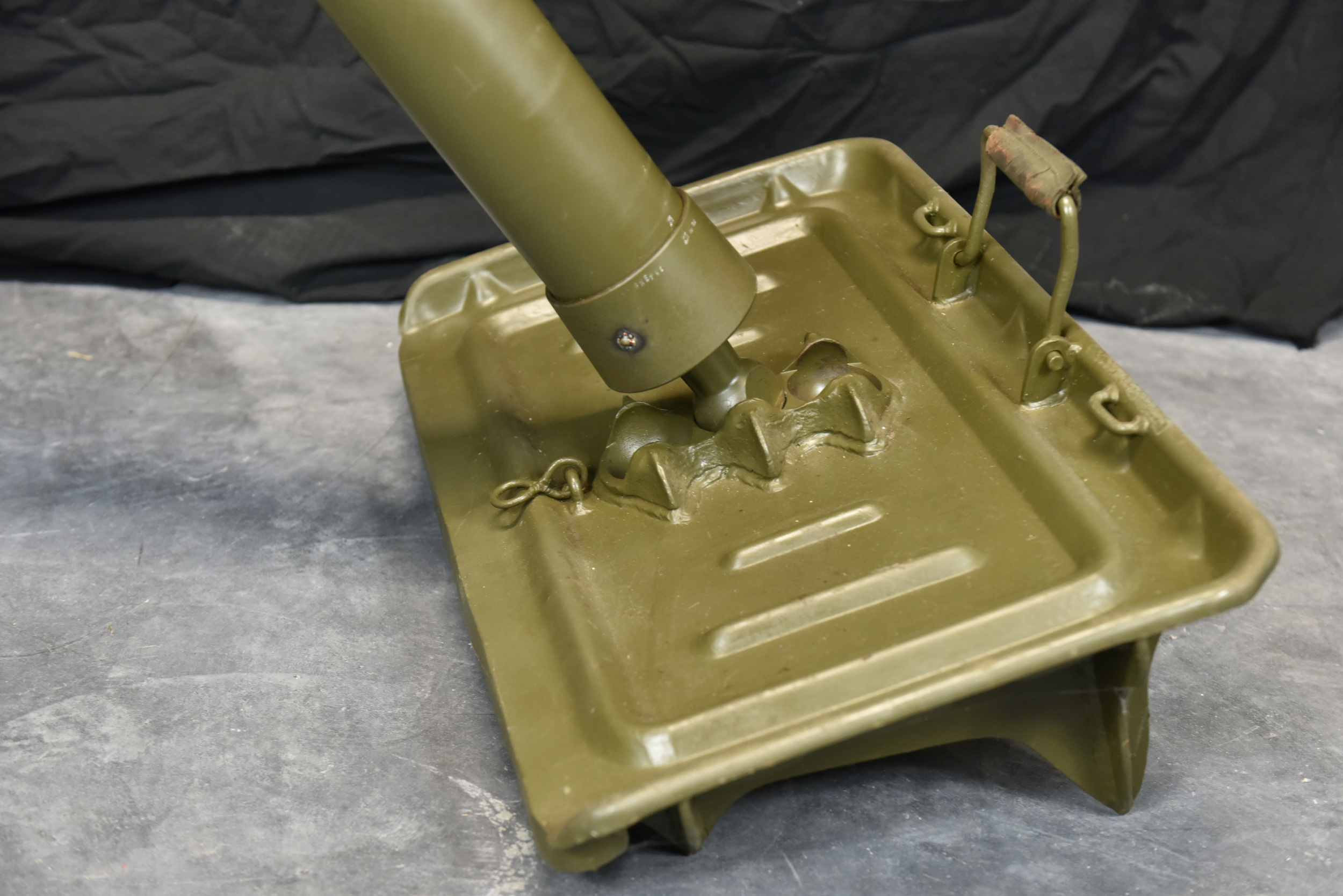 Mortier US M1 81mm. Plaque en métal complète, trois modes de positionnement. Poignée de transport en métal avec son renfort en cuir. Marquages 14165. Tube en métal, lisse, peinture kaki à... en savoir plus