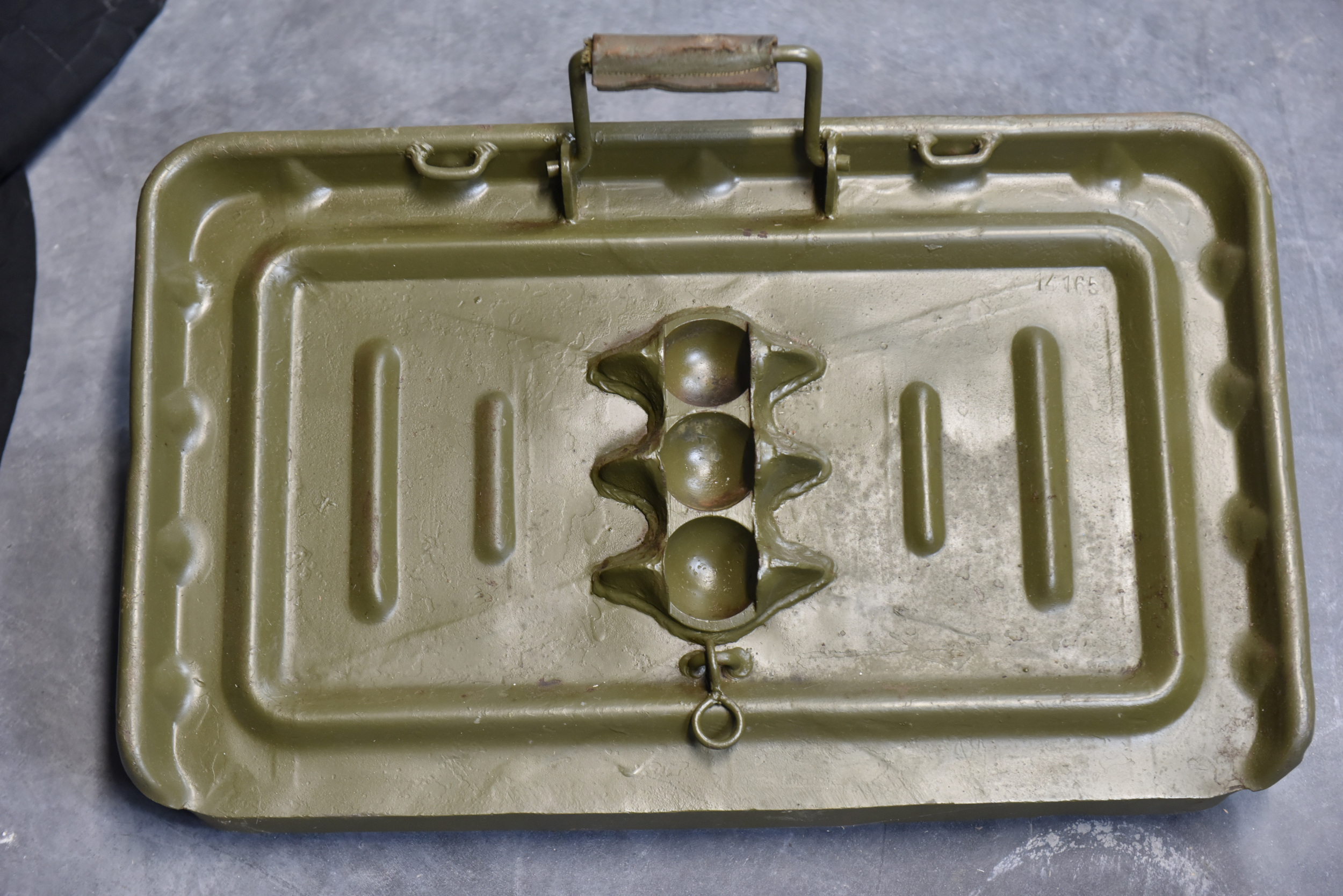 Détails de la vente >Mortier US M1 81mm. Plaque en métal complète, trois modes de positionnement. Poignée de transport en métal avec son renfort en cuir. Marquages 14165. Tube en métal, lisse, peinture kaki à... en savoir plus