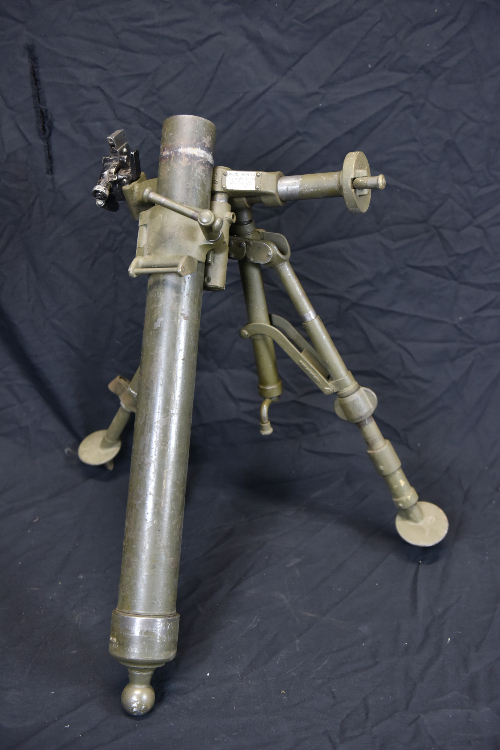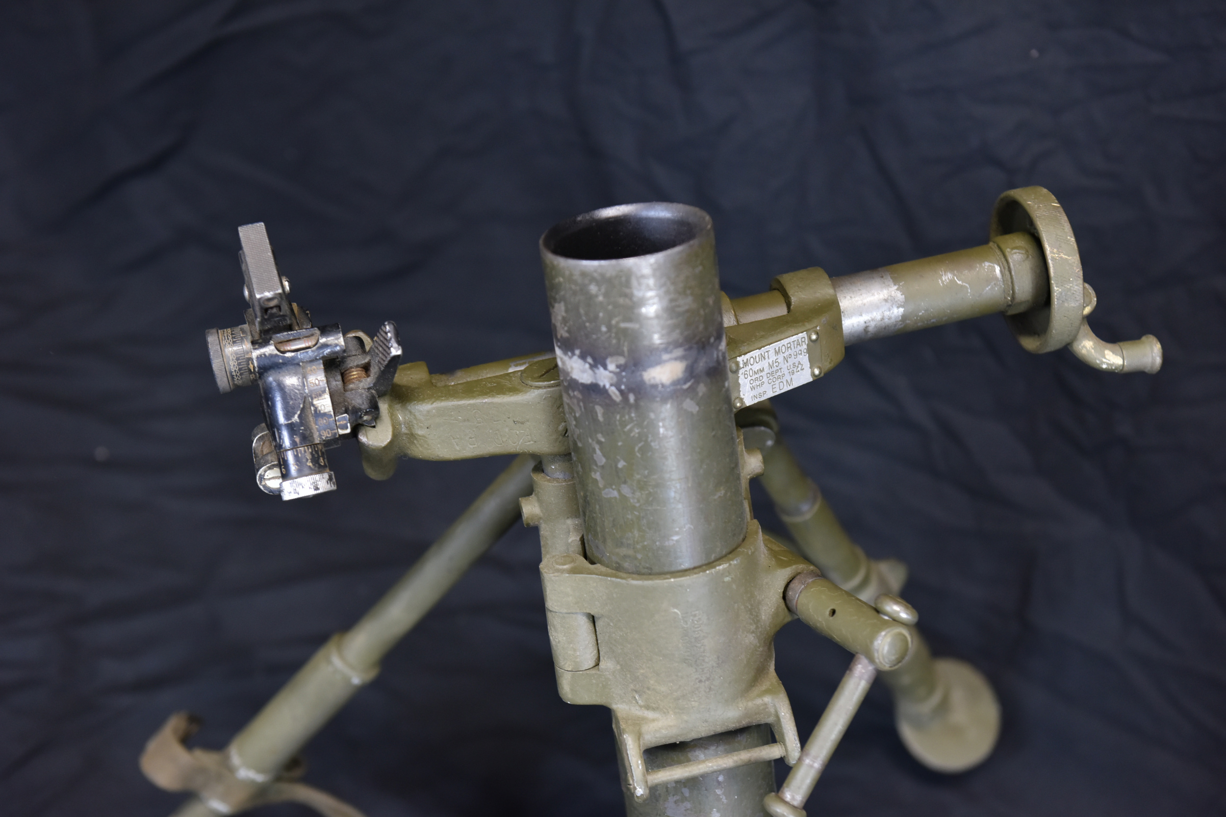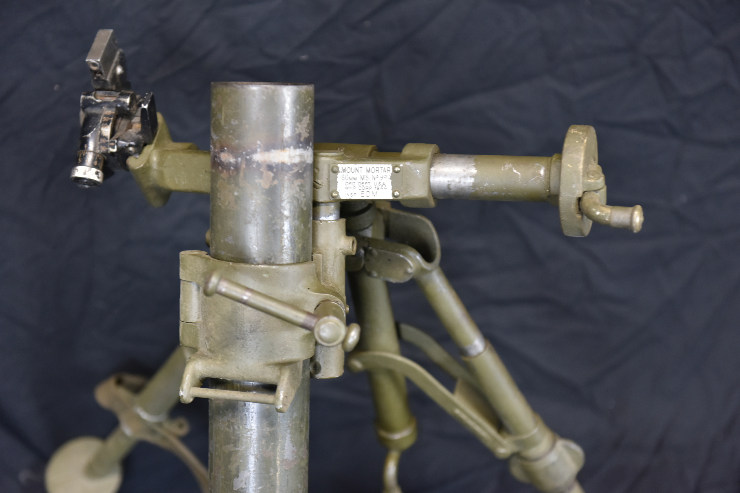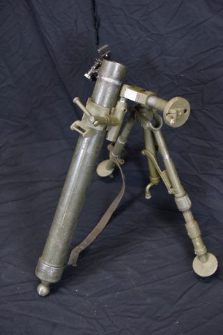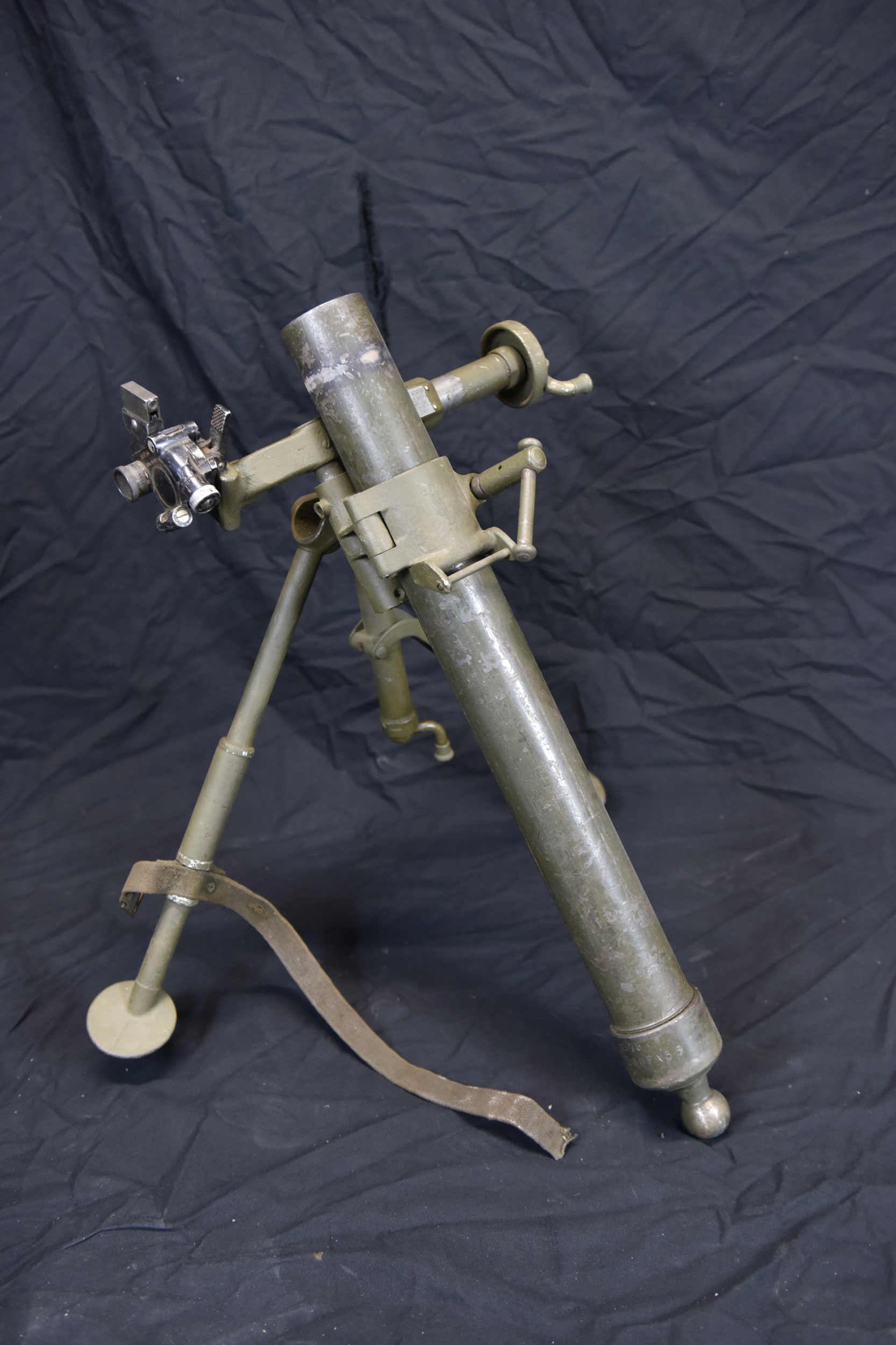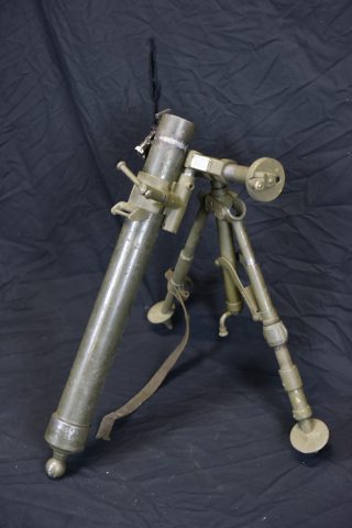 Mortier US M19 60mm. Fabrication Ordnance DP WHP Corp, numéro 6578. Plaque de sol absente. Tube en métal, lisse, peinture kaki à 70%. Marqué ODP A 55 Numéro USA 6578. Reste d’une ligne d’alignement à la peinture blanche sur toute la longueur du tube. Bipied complet, toutes les pièces mobiles sont fonctionnelles. Plaque marquée Mount Mortar 60mm M5, numéro 999, Ord Dept USA WHP Corp 1944 Insp EDM. La sangle de maintien du bipied est incomplète. Catégorie C9. Arme neutralisée aux nouvelles normes européenne par le Banc d’épreuve de Saint Etienne. Cette arme doit être déclarée avec Cerfa et certificat médical de moins de 1 mois ou licence de tir tamponnée ou permis de chasse valide (art R312-56). La délivrance de l’arme n’aura lieu qu’après consultation du fichier Finadia. L’inscription de l’acheteur sur ce fichier entrainera automatiquement la nullité de la vente. A noter une certaine usure et patine de la pièce. Etat II+.