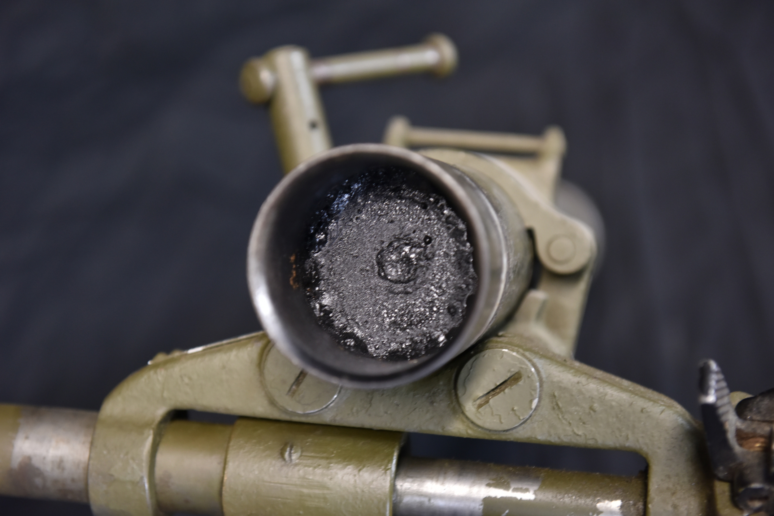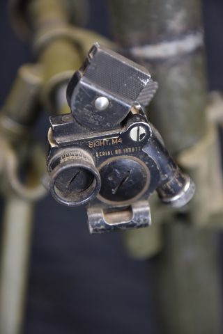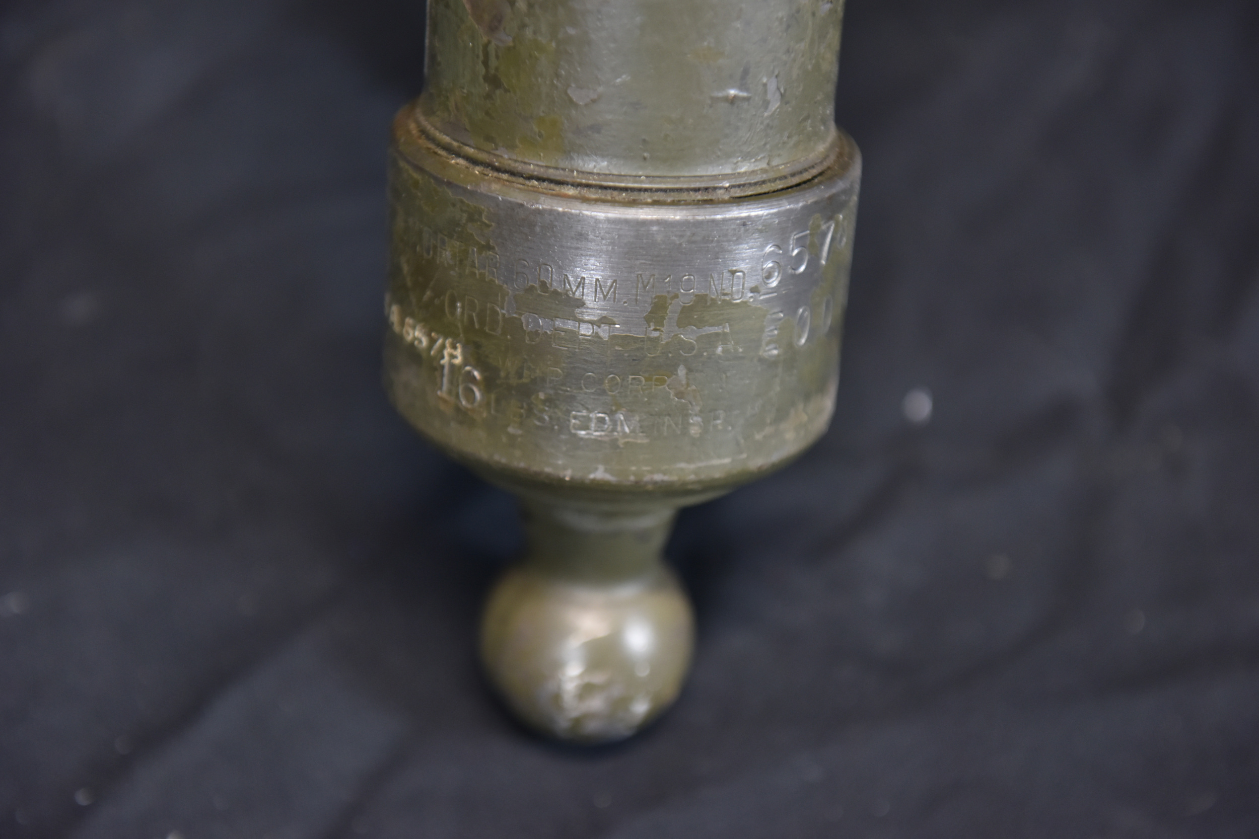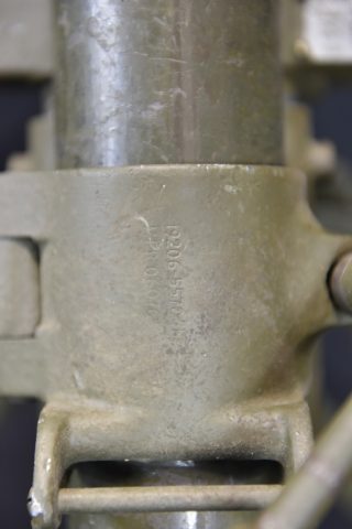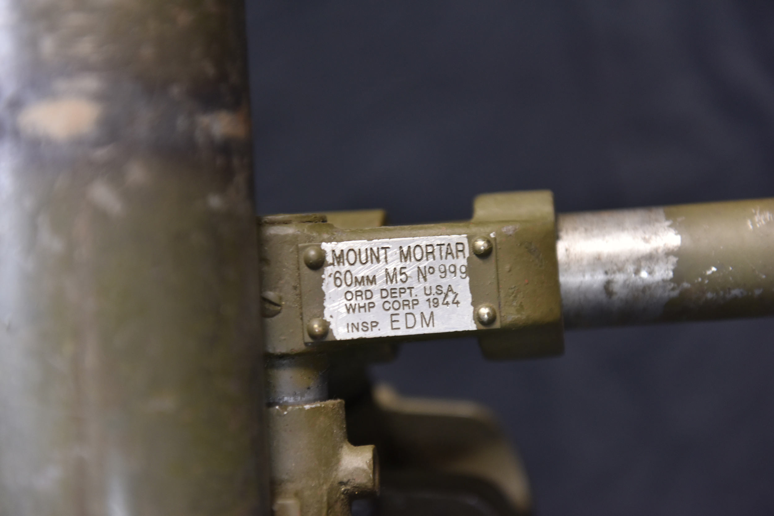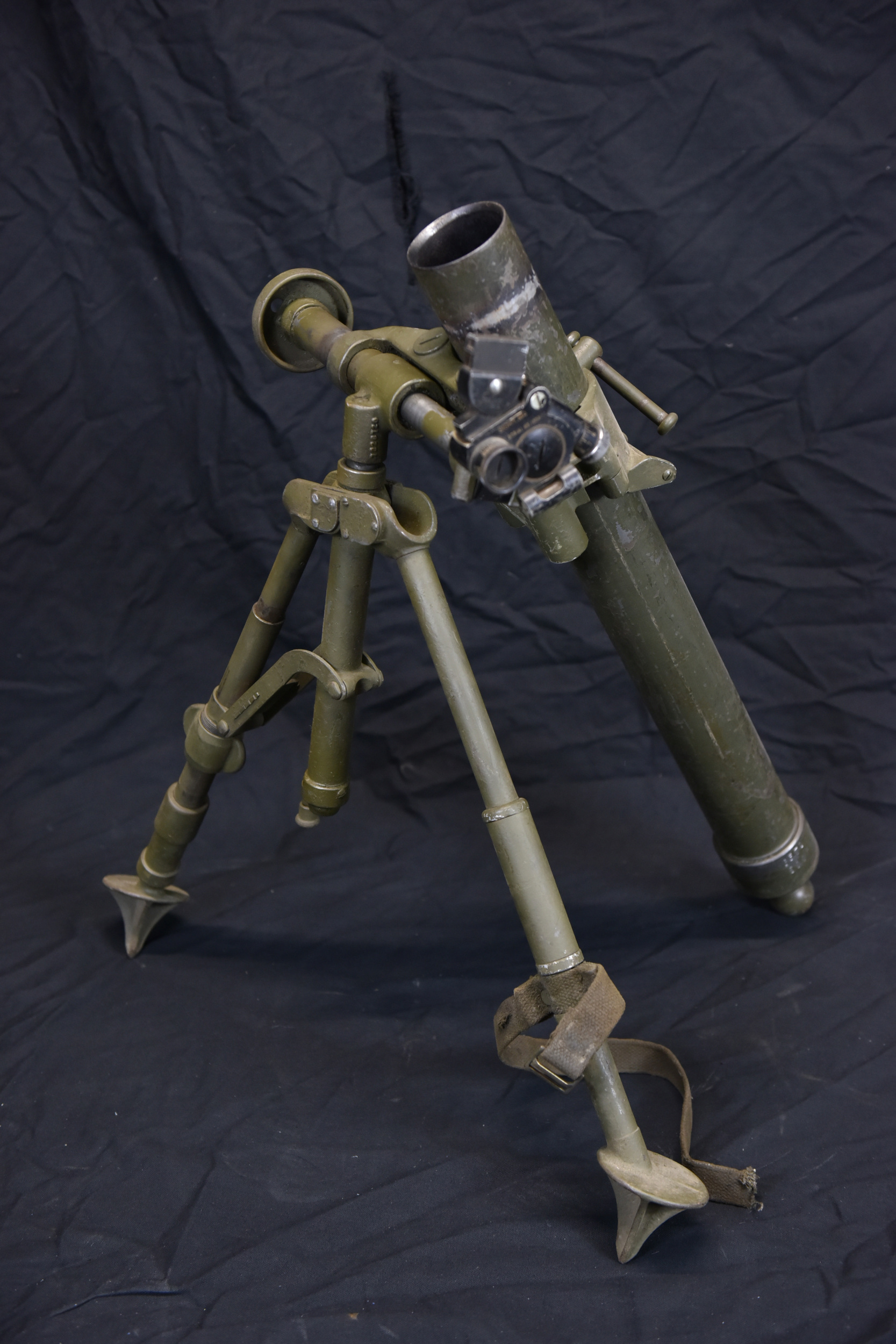 Mortier US M19 60mm. Fabrication Ordnance DP WHP Corp, numéro 6578. Plaque de sol absente. Tube en métal, lisse, peinture kaki à 70%. Marqué ODP A 55 Numéro USA 6578. Reste d’une ligne d’alignement à la peinture blanche sur toute la longueur du tube. Bipied complet, toutes les pièces mobiles sont fonctionnelles. Plaque marquée Mount Mortar 60mm M5, numéro 999, Ord Dept USA WHP Corp 1944 Insp EDM. La sangle de maintien du bipied est incomplète. Catégorie C9. Arme neutralisée aux nouvelles normes européenne par le Banc d’épreuve de Saint Etienne. Cette arme doit être déclarée avec Cerfa et certificat médical de moins de 1 mois ou licence de tir tamponnée ou permis de chasse valide (art R312-56). La délivrance de l’arme n’aura lieu qu’après consultation du fichier Finadia. L’inscription de l’acheteur sur ce fichier entrainera automatiquement la nullité de la vente. A noter une certaine usure et patine de la pièce. Etat II+.