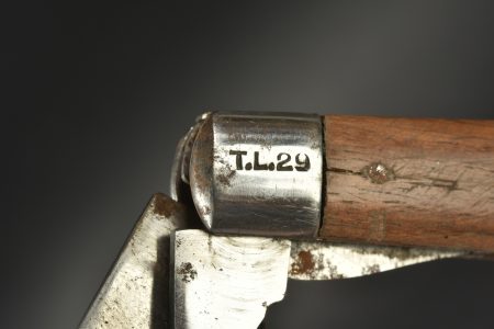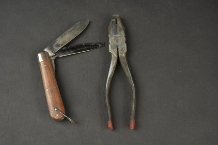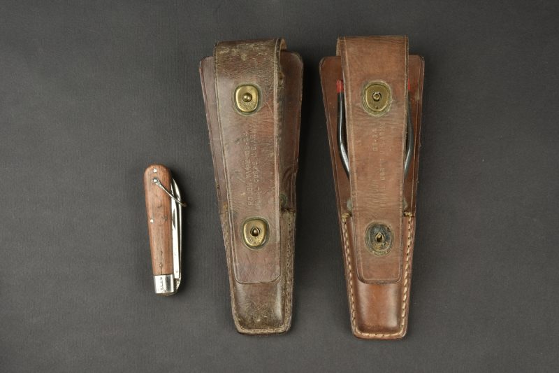 Outils CS-34. Comprenant une housse en épais cuir marron, les boutons pressions sont fonctionnels, les outils sont manquants. Marquages Pouch Type CS-34 Signal Corps US Army. Une housse en épais cuir marron, le boutons pression sont fonctionnels. Marquages Pouch CS-34 Signal Corps US Army. PInce TL-13 complète, et quasiment dans sa couleur d’origine. Canif TL-29, complet avec son anneau grenadière. A noter une certaine usure et patine des pièces. Etat II+.