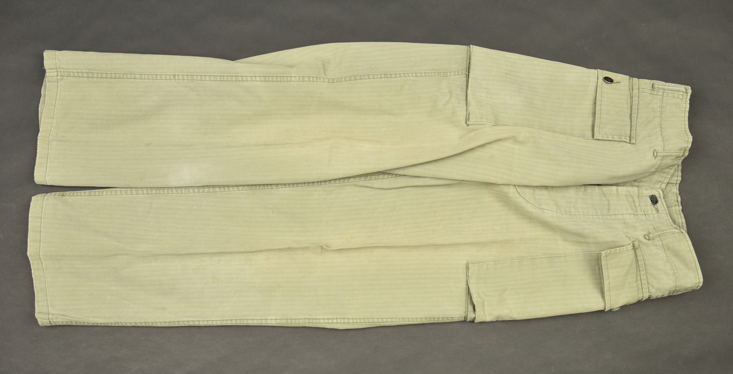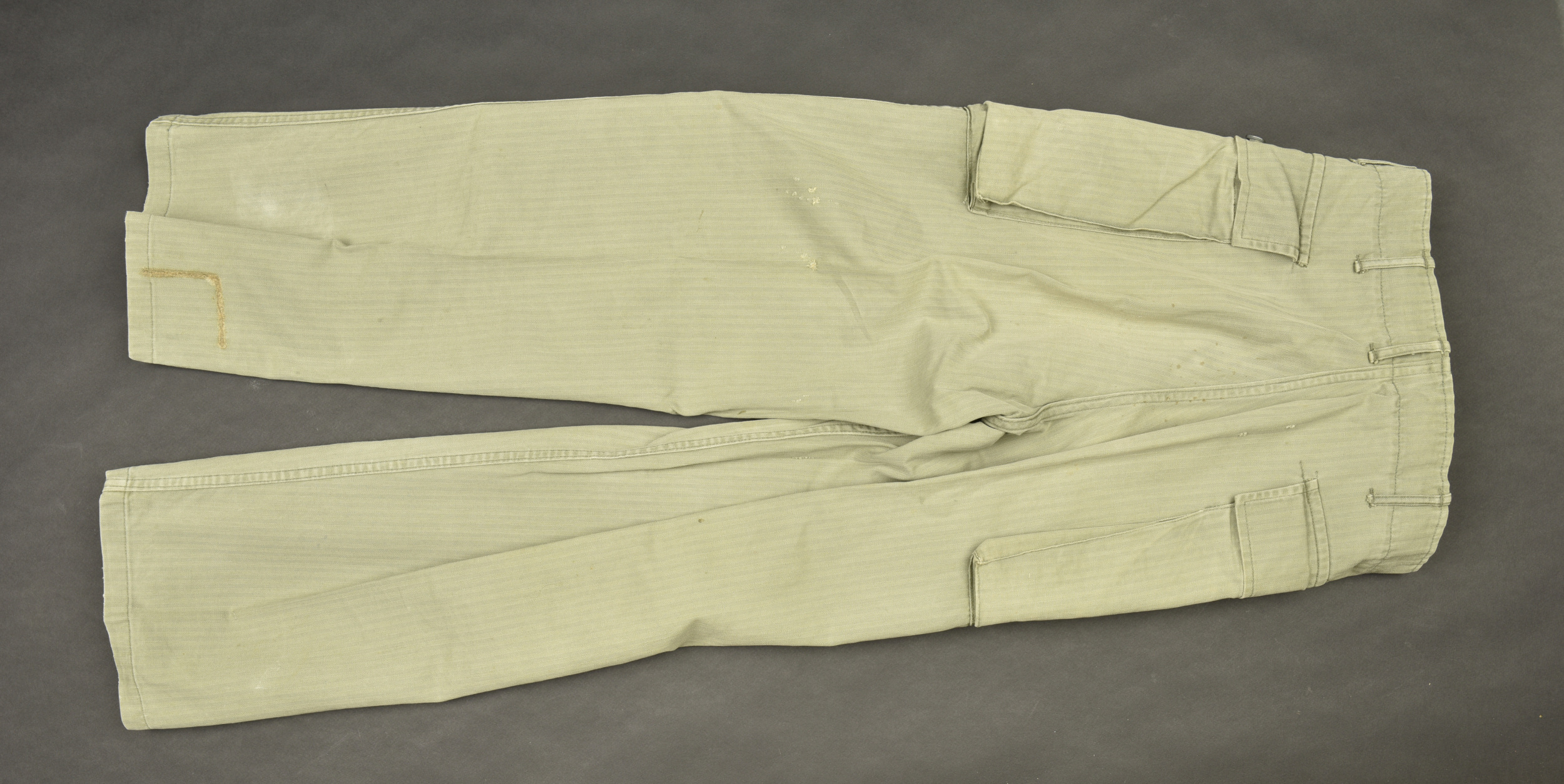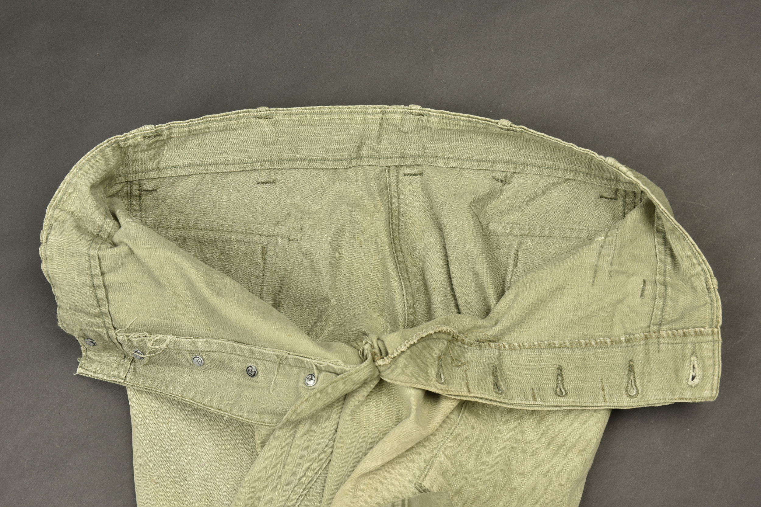 Pantalon HBT. En tissu coton HBT OD. La couleur externe est fortement décolorée par le soleil. Tous les boutons sont présents et estampillés de treize étoiles. Modèle sans bavette anti-gaz. Etiquette fabricant absente. A noter une certaine usure et patine de la pièce, ainsi que des tâches et accrocs. Etat II+.