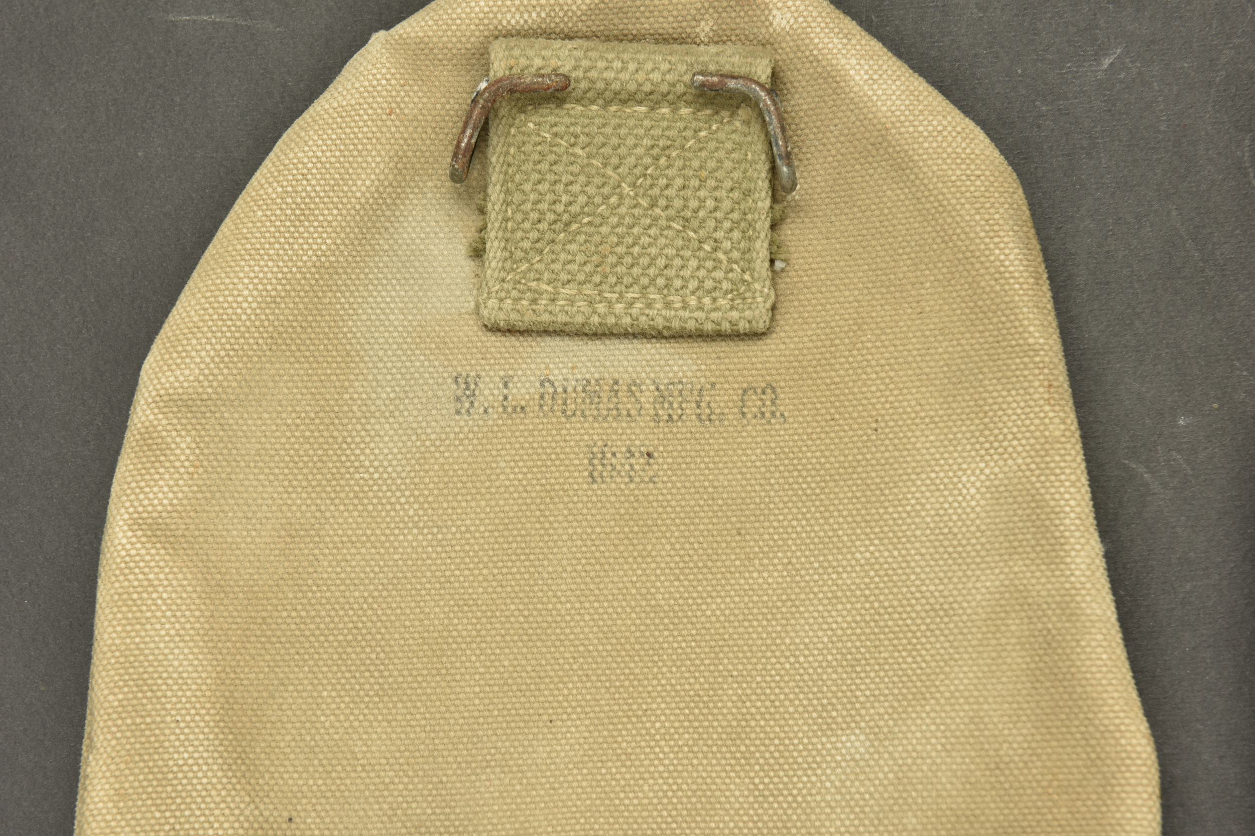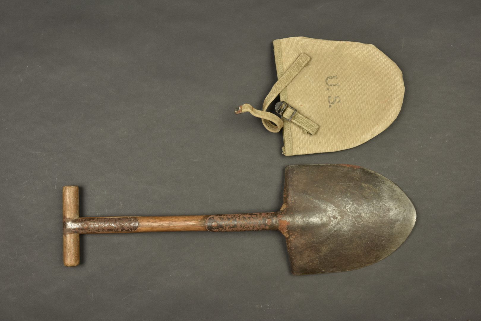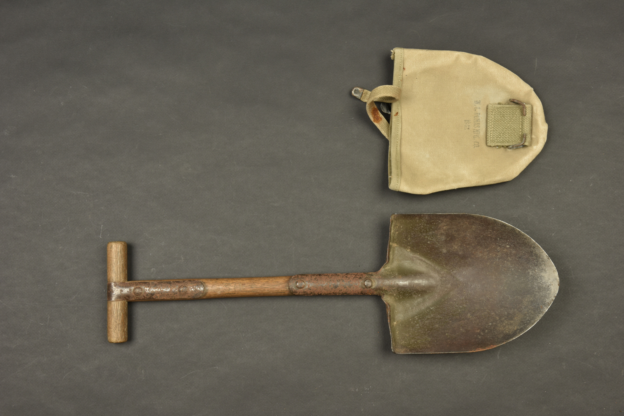 Pelle en T US. Les parties métalliques sont fortement oxydées. Reste de marquage US visible. Manche en bois dépourvu de peinture, et présentant quelques fissures. Housse en forte toile OD3, le crochet de fixation au ceinturon est présent. Beau marquage US, datée 1942. A noter une certaine usure et oxydation de la pièce. Etat II+.