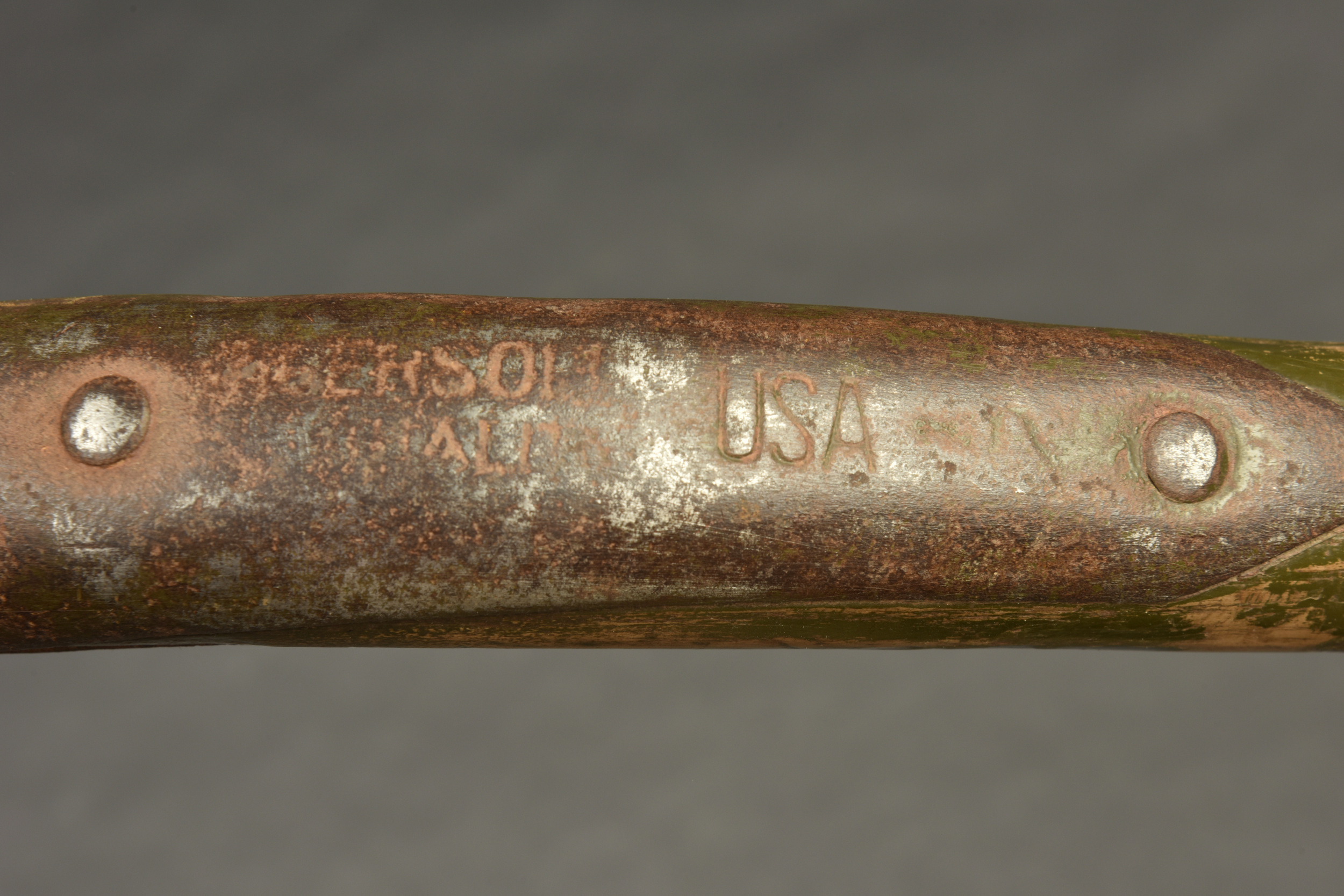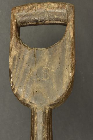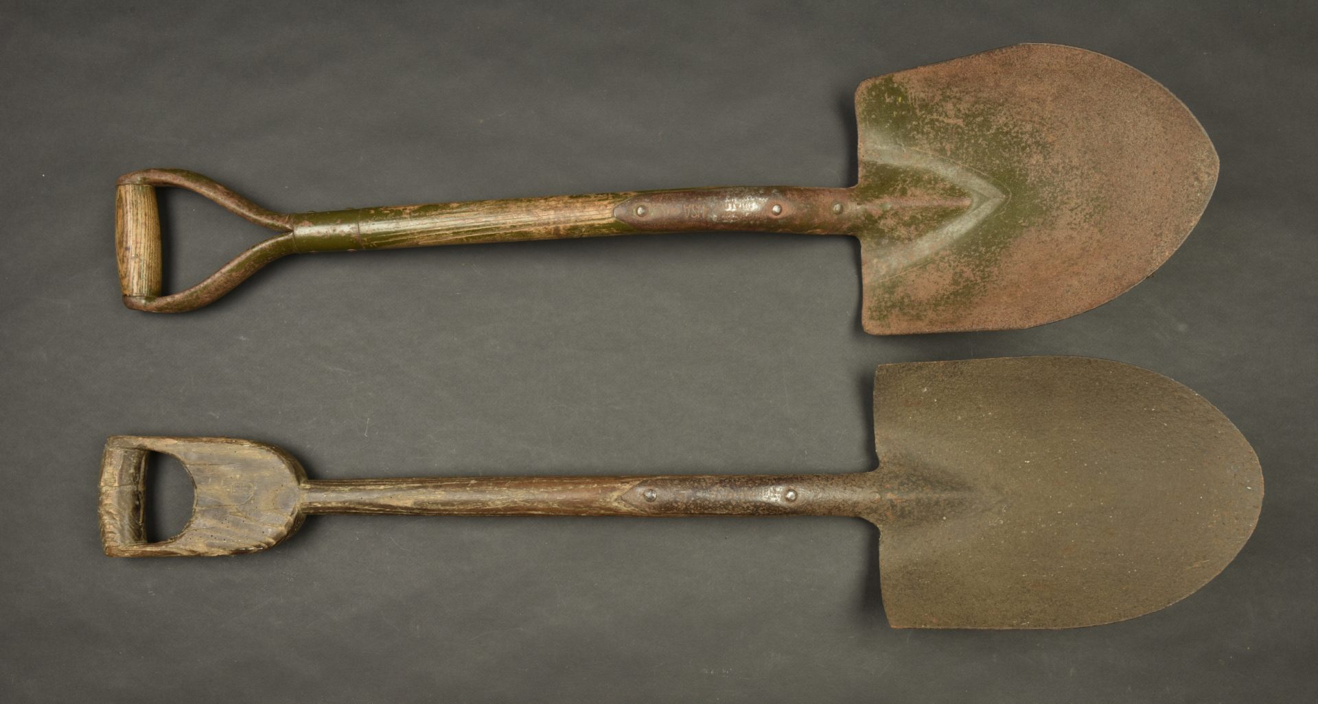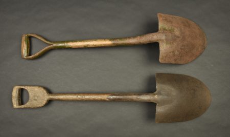 Détails de la vente >Pelles US. Comprenant deux modèles différents de pelles en bois et métal. Les marquages sont illisibles. A noter une certaine usure et patine des pièces. Etat II+.