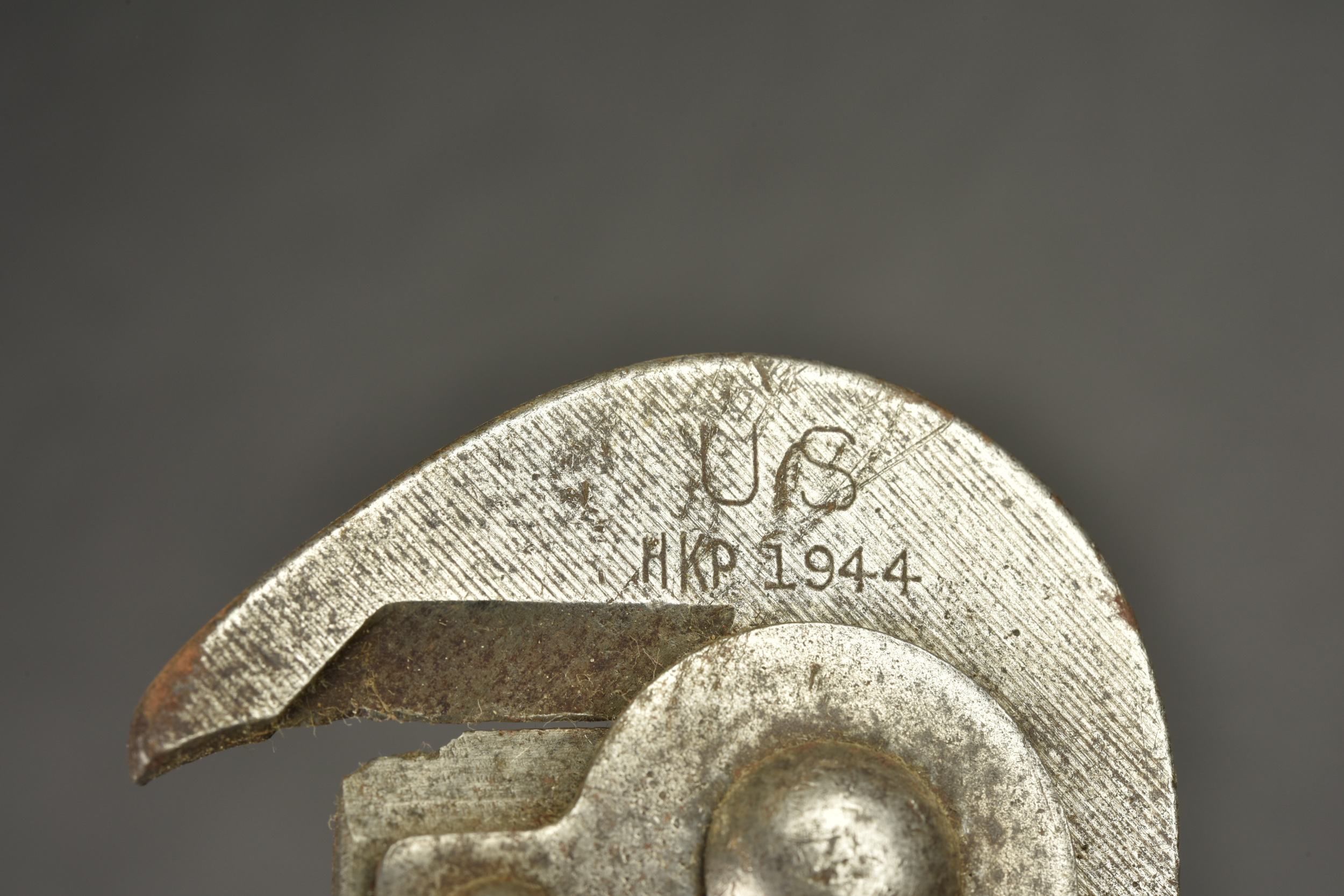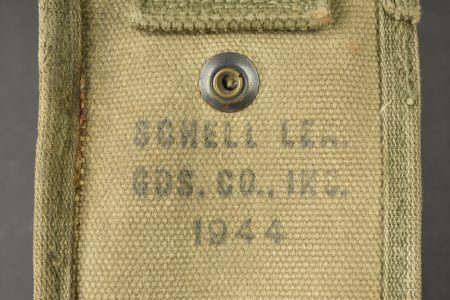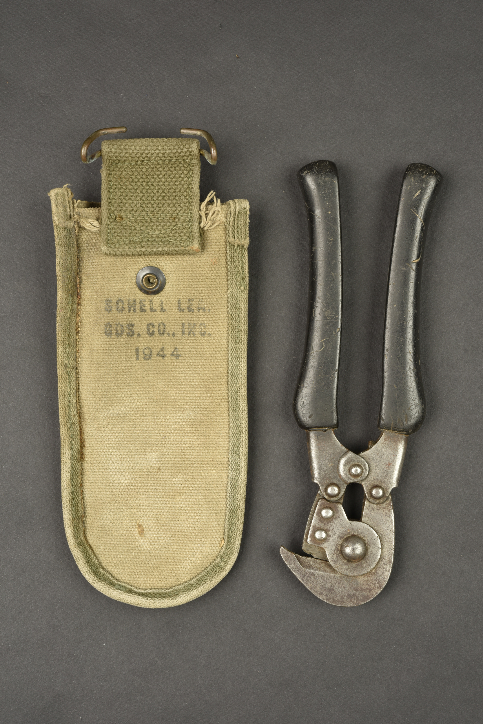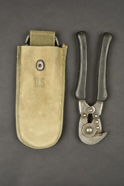 Pince coupante US. Pince en métal partiellement oxydée. Manche en caoutchouc noir. Fabrication US HKP 1944. Housse en forte toile OD. Le bouton pression est fonctionnel. Beau marquage US sur la face avant. Le crochet de fixation au ceinturon est complet. Fabrication Schell Lea 1944. A noter une certaine usure et patine de la pièce, ainsi que des tâches. Etat II+.