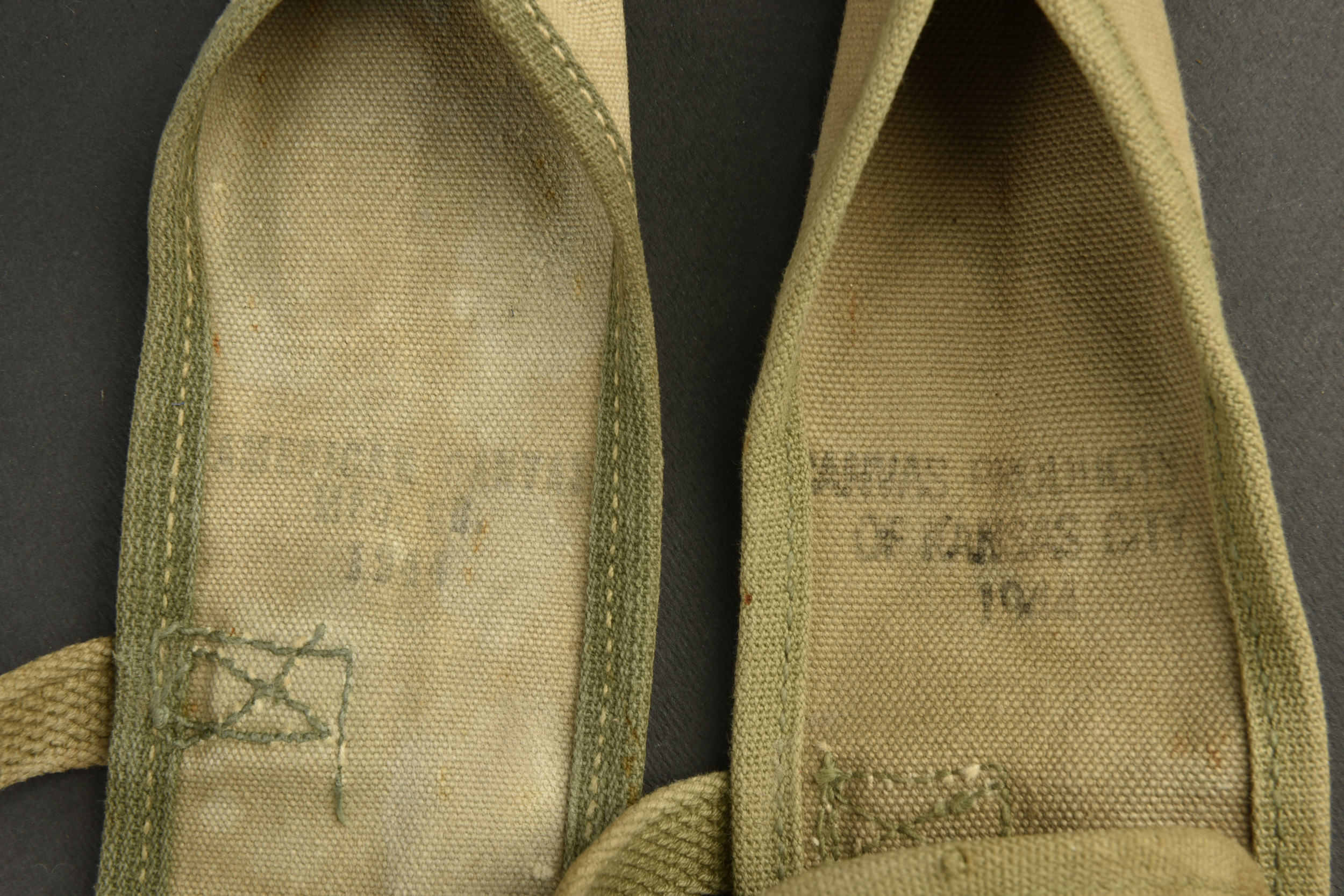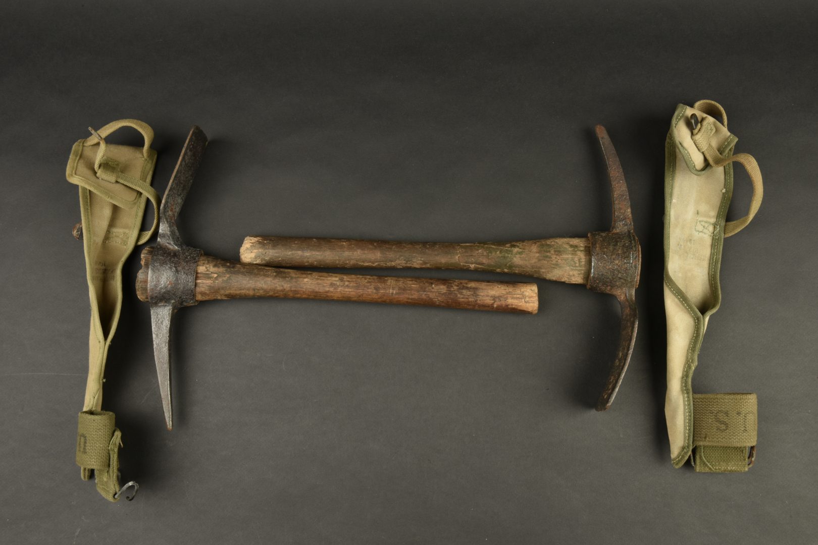 Pioches individuelles US. Comprenant deux manches en bois, présentant des fissures et des trous de vers, ainsi que des manques. Deux parties métalliques oxydées et nettoyées, les marquages sont illisibles. Deux housses en forte toile OD 3, beaux marquages US. Les crochets de fixation au ceinturon sont présents. Fabrication Canvas Products of Kansas 1944 et American Canvas 1943. A noter une certaine usure et patine des pièces, ainsi que des tâches et accrocs. Etat II-.