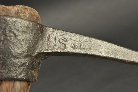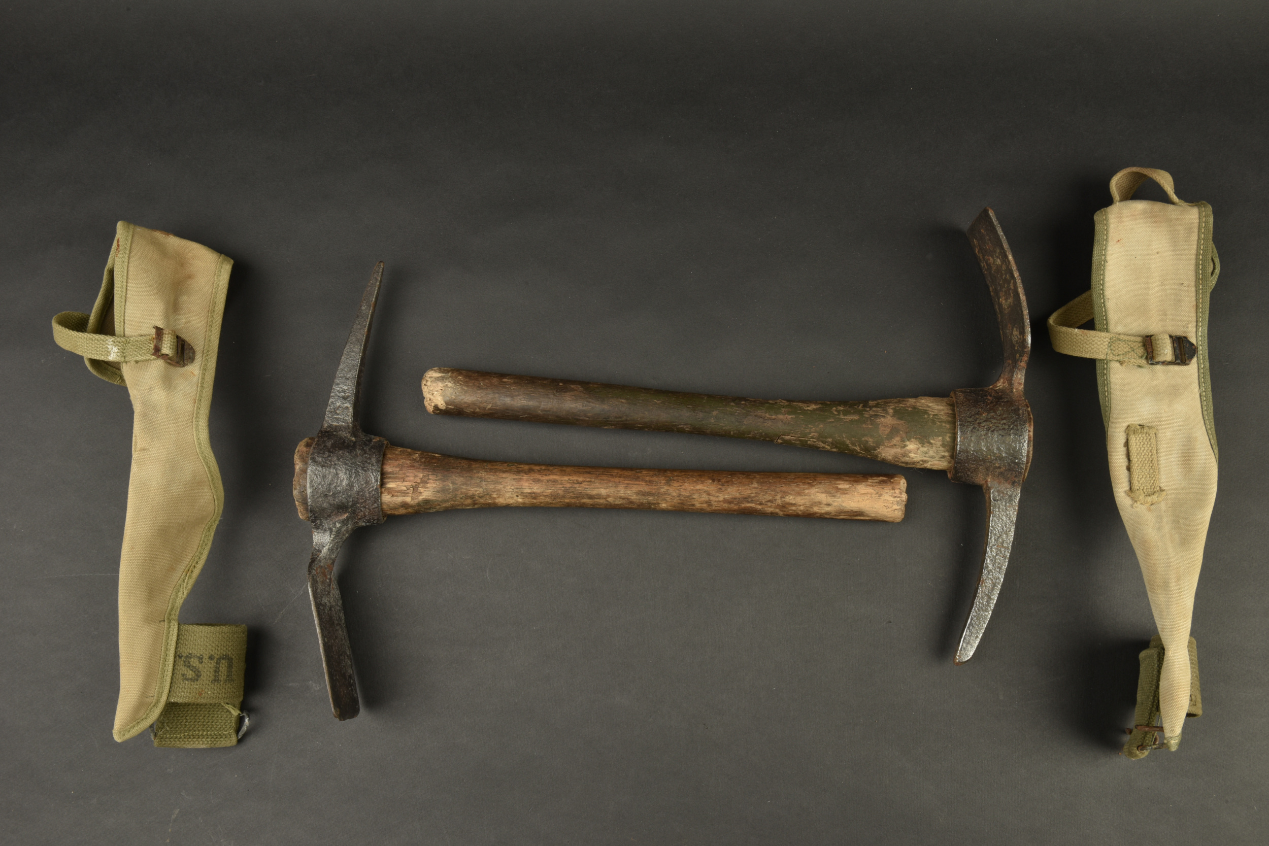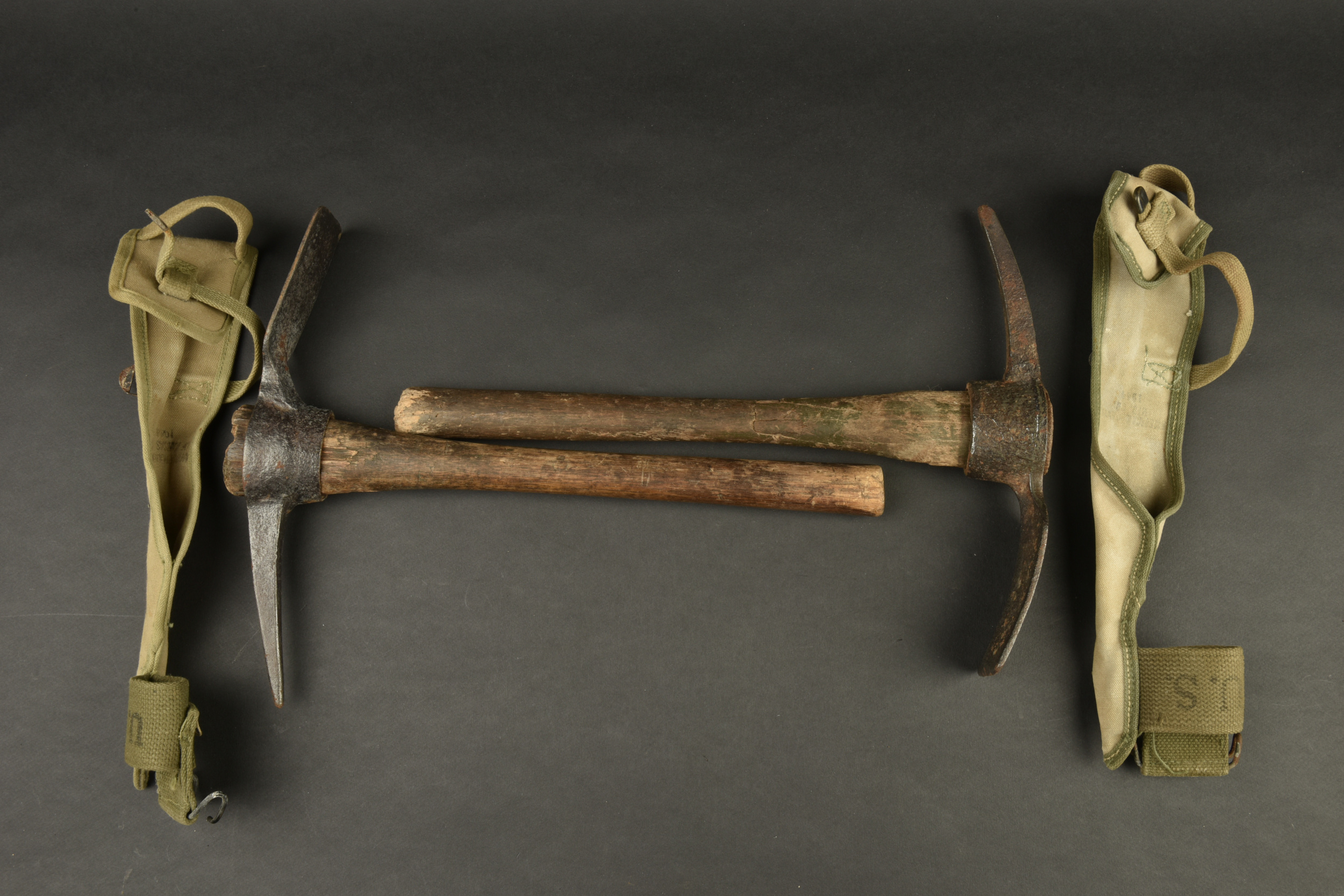 Pioches individuelles US. Comprenant deux manches en bois, présentant des fissures et des trous de vers, ainsi que des manques. Deux parties métalliques oxydées et nettoyées, les marquages... en savoir plus
