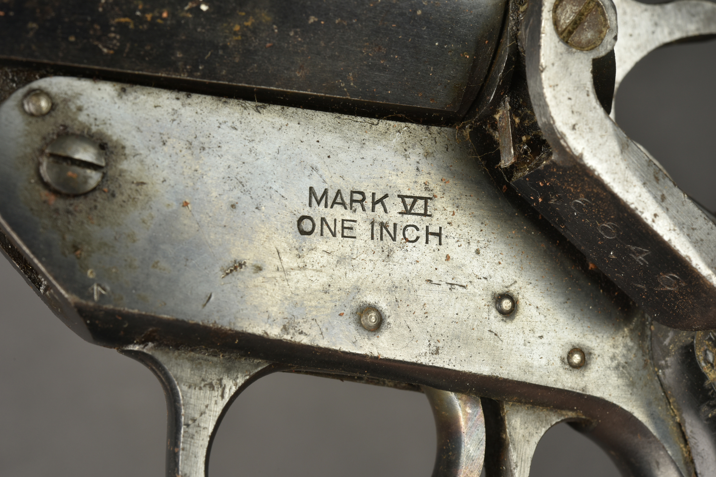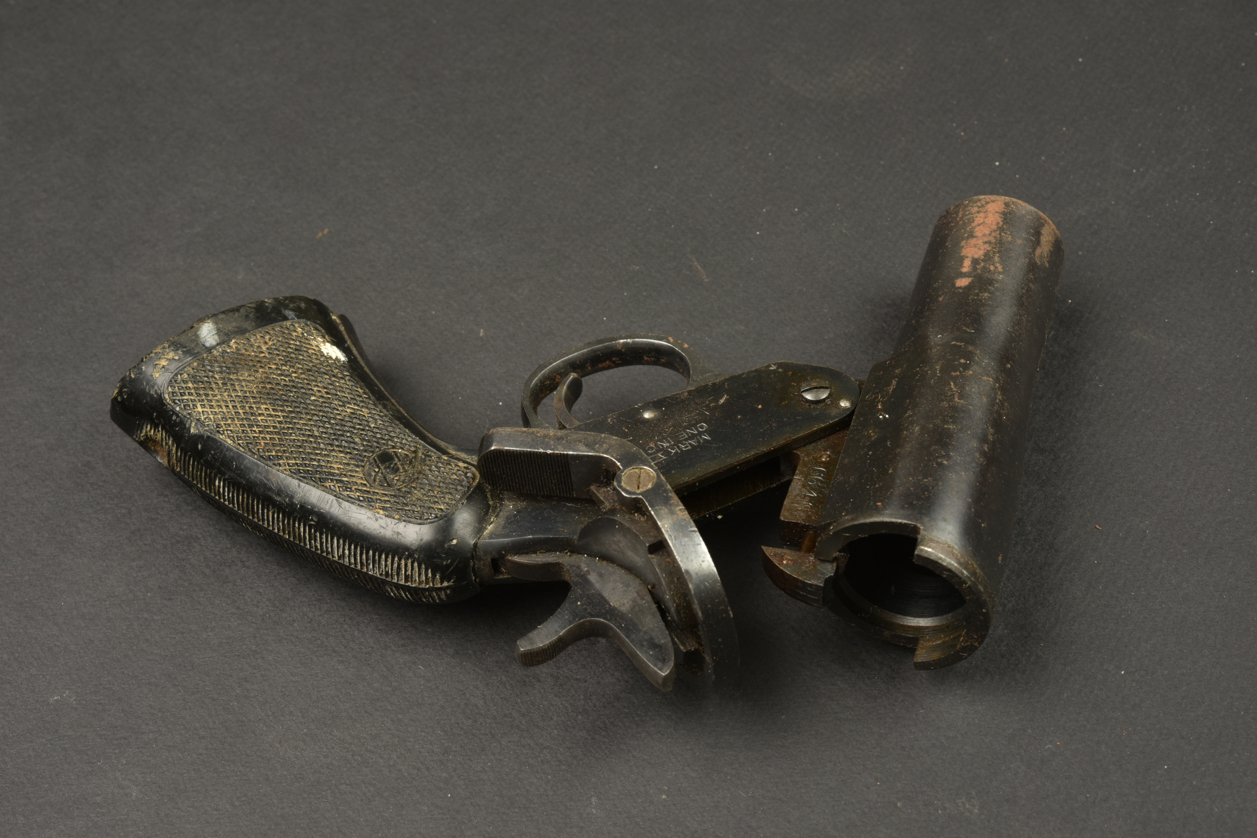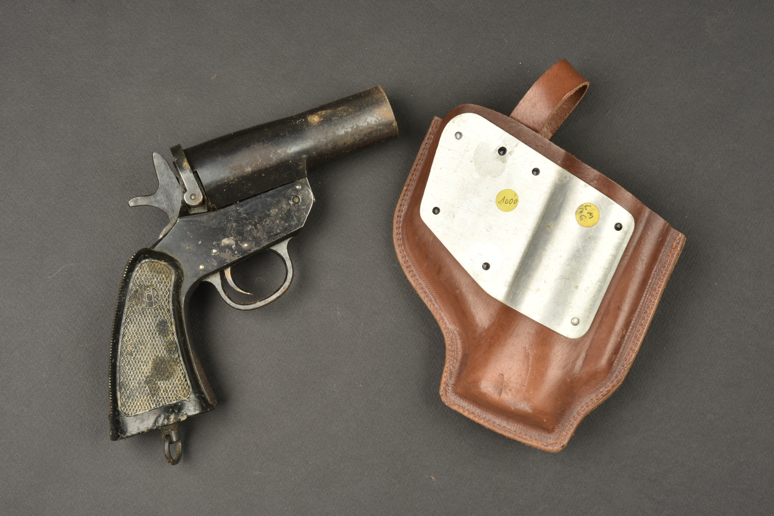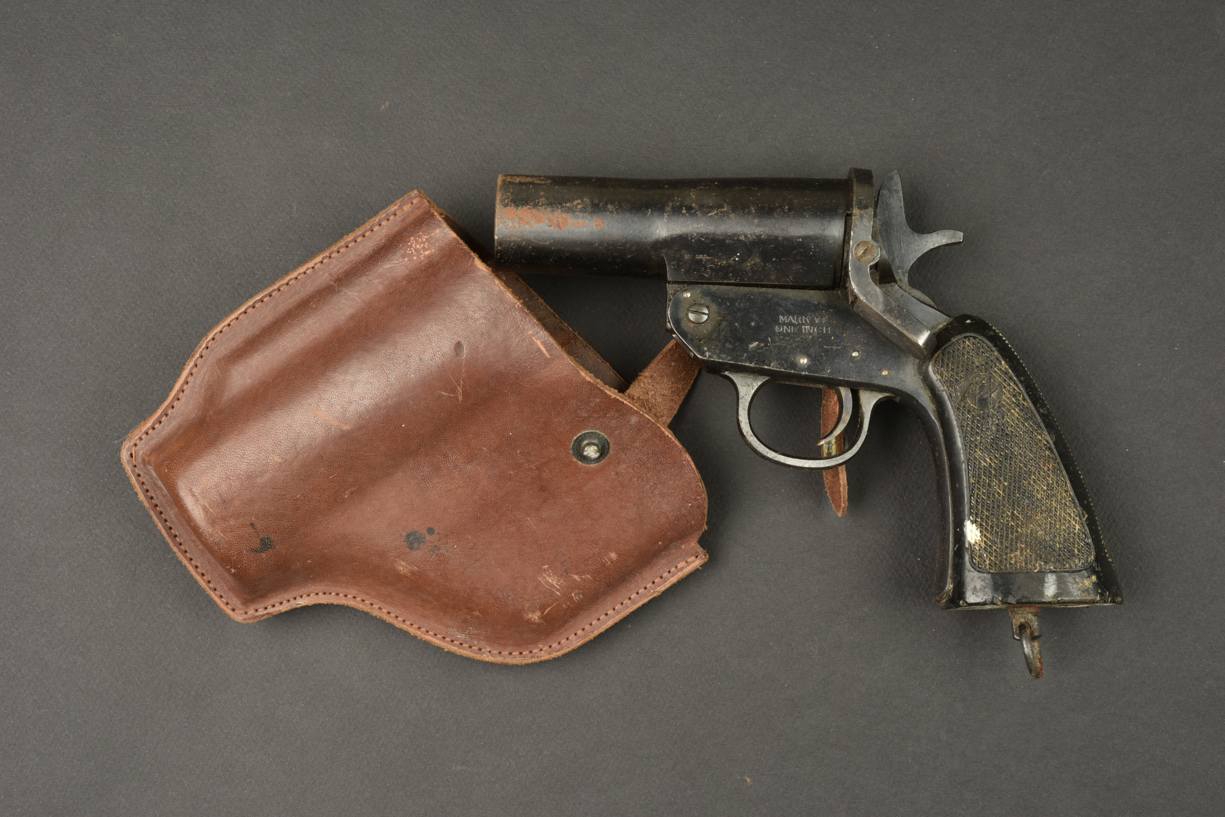 Détails de la vente >Pistolet lance fusée Harrington et Richardson Mark VI avec étui. Lance fusée américain bien marqué du fabricant sur le dessus du canon Harrington & Richardson Arms Co, Worcester, Mass.... en savoir plus