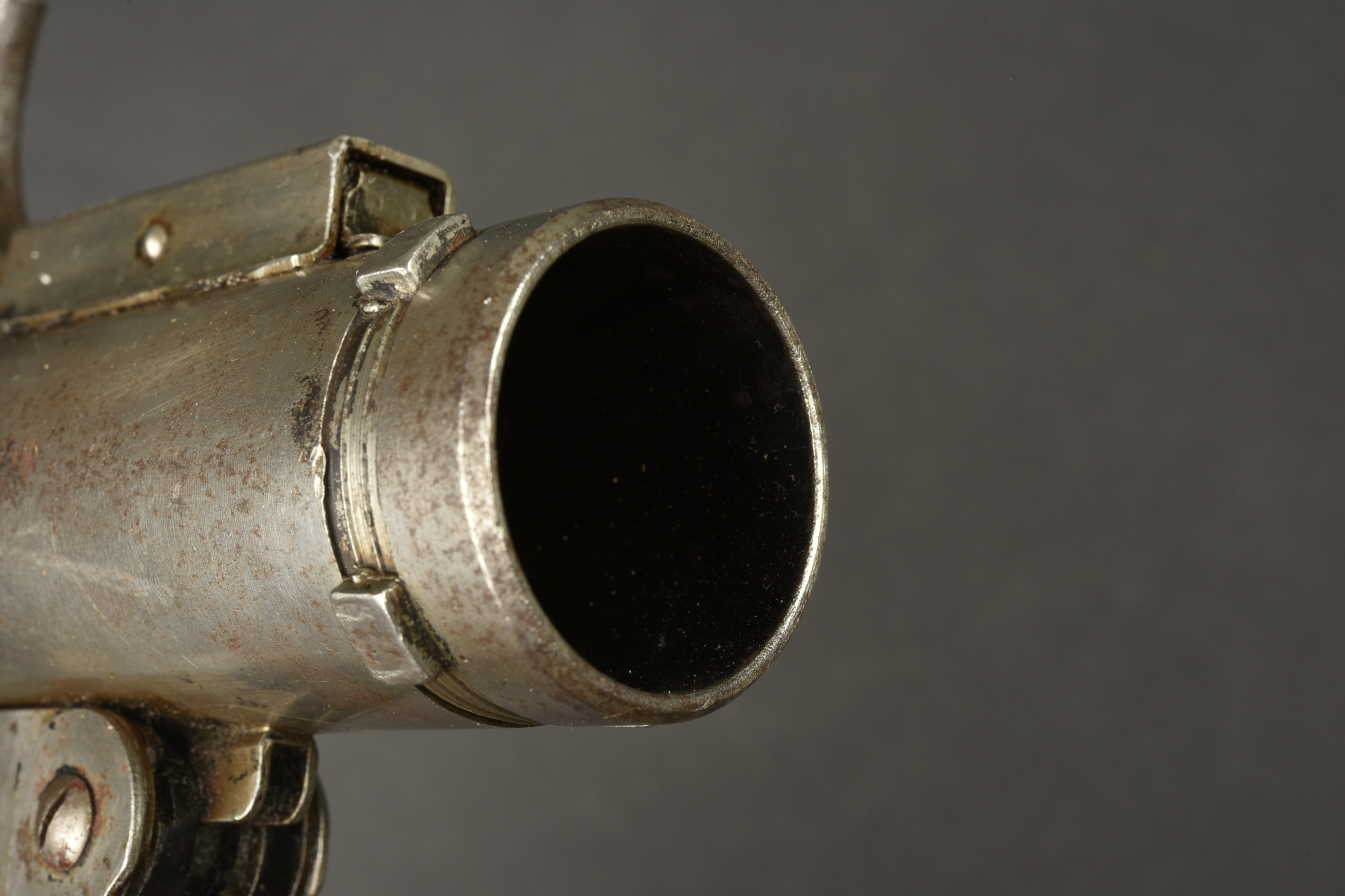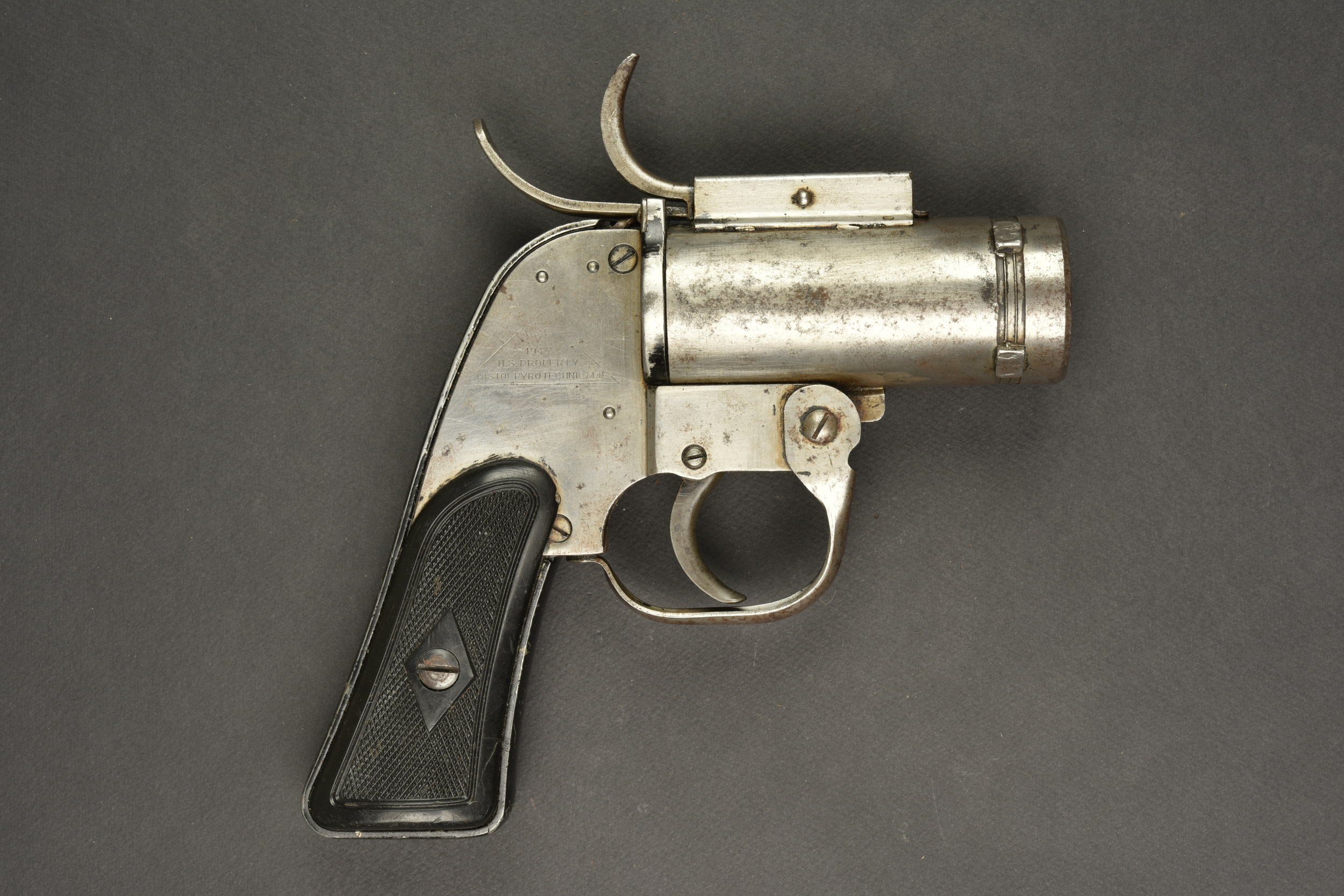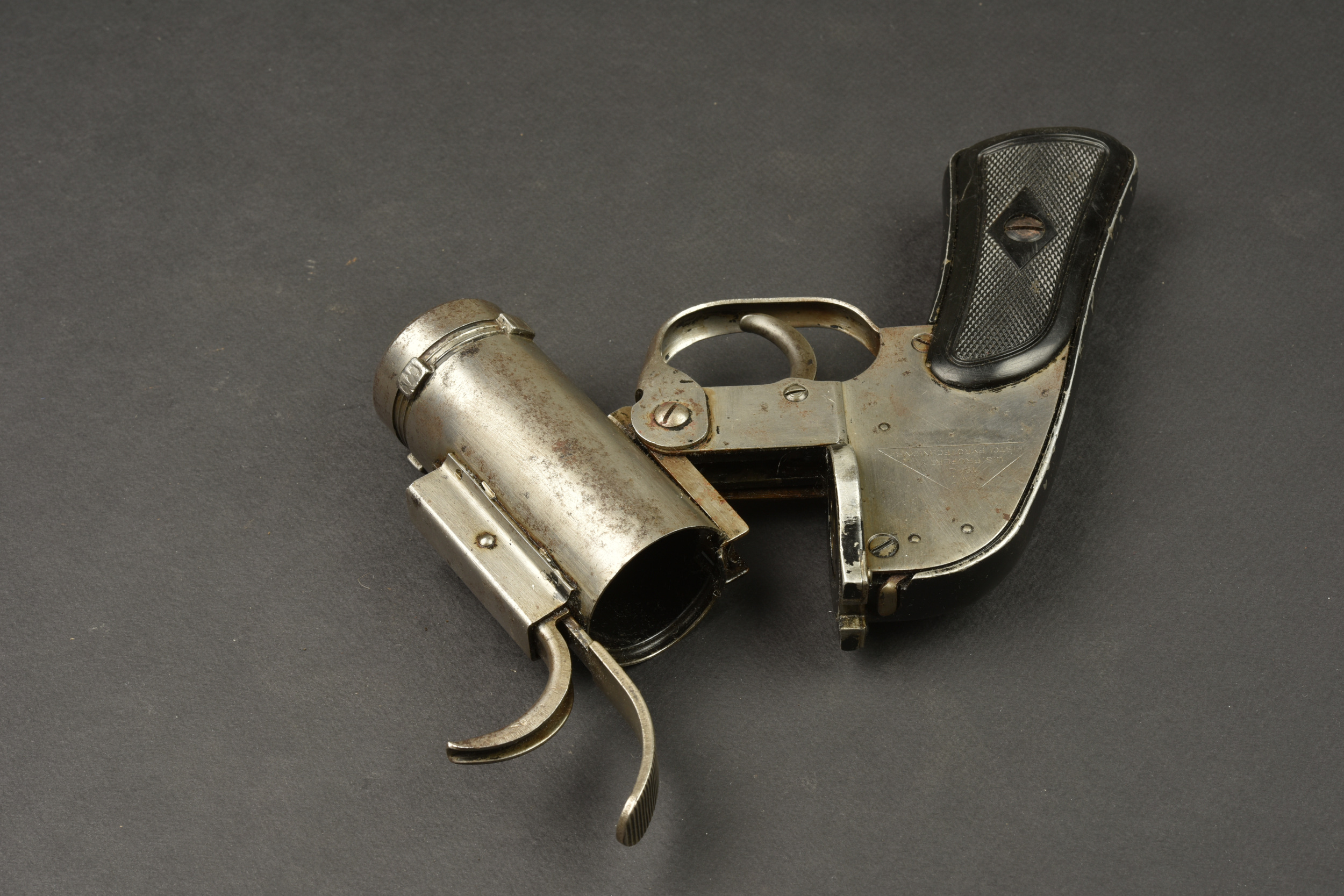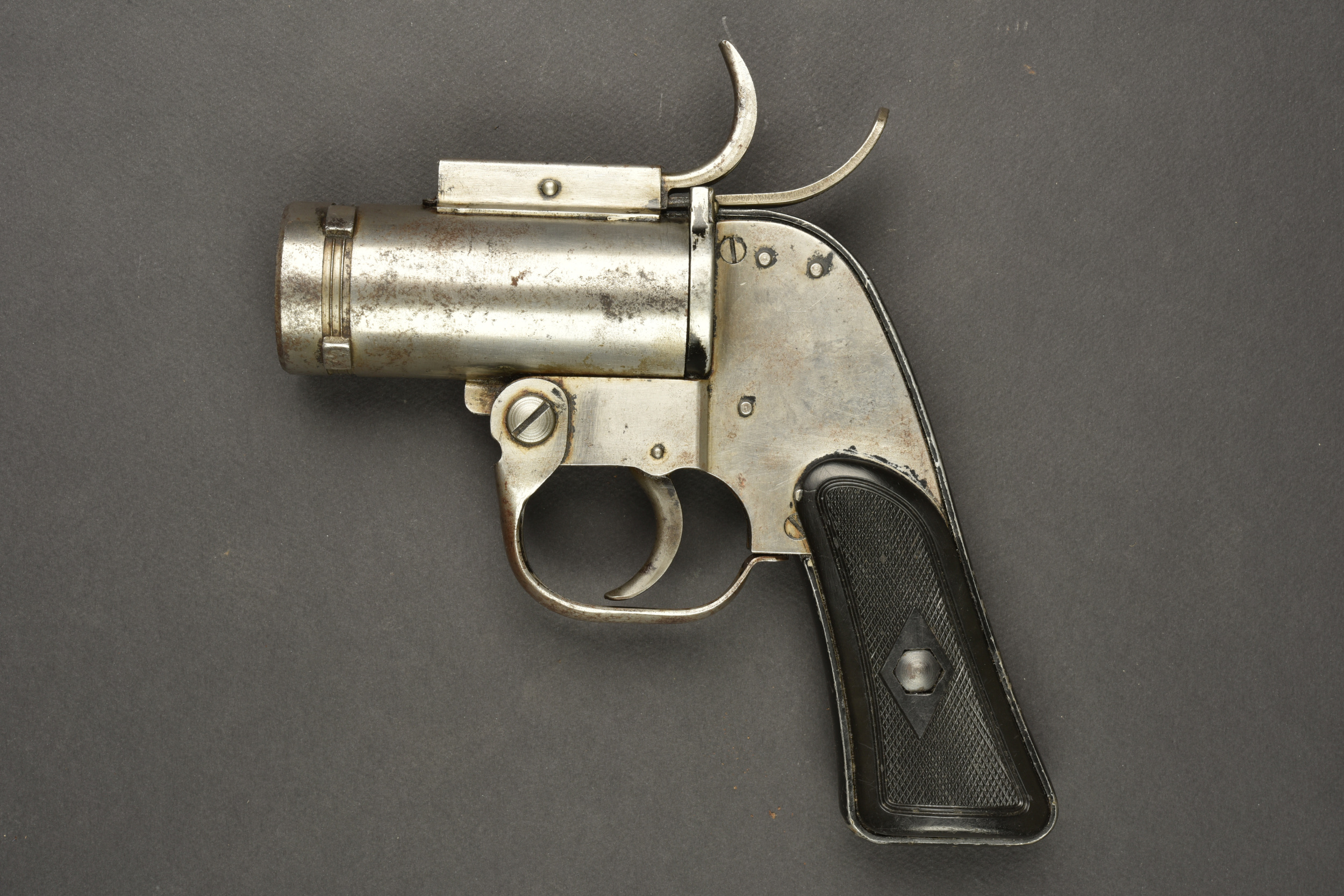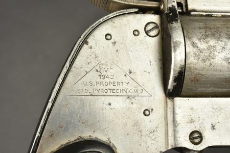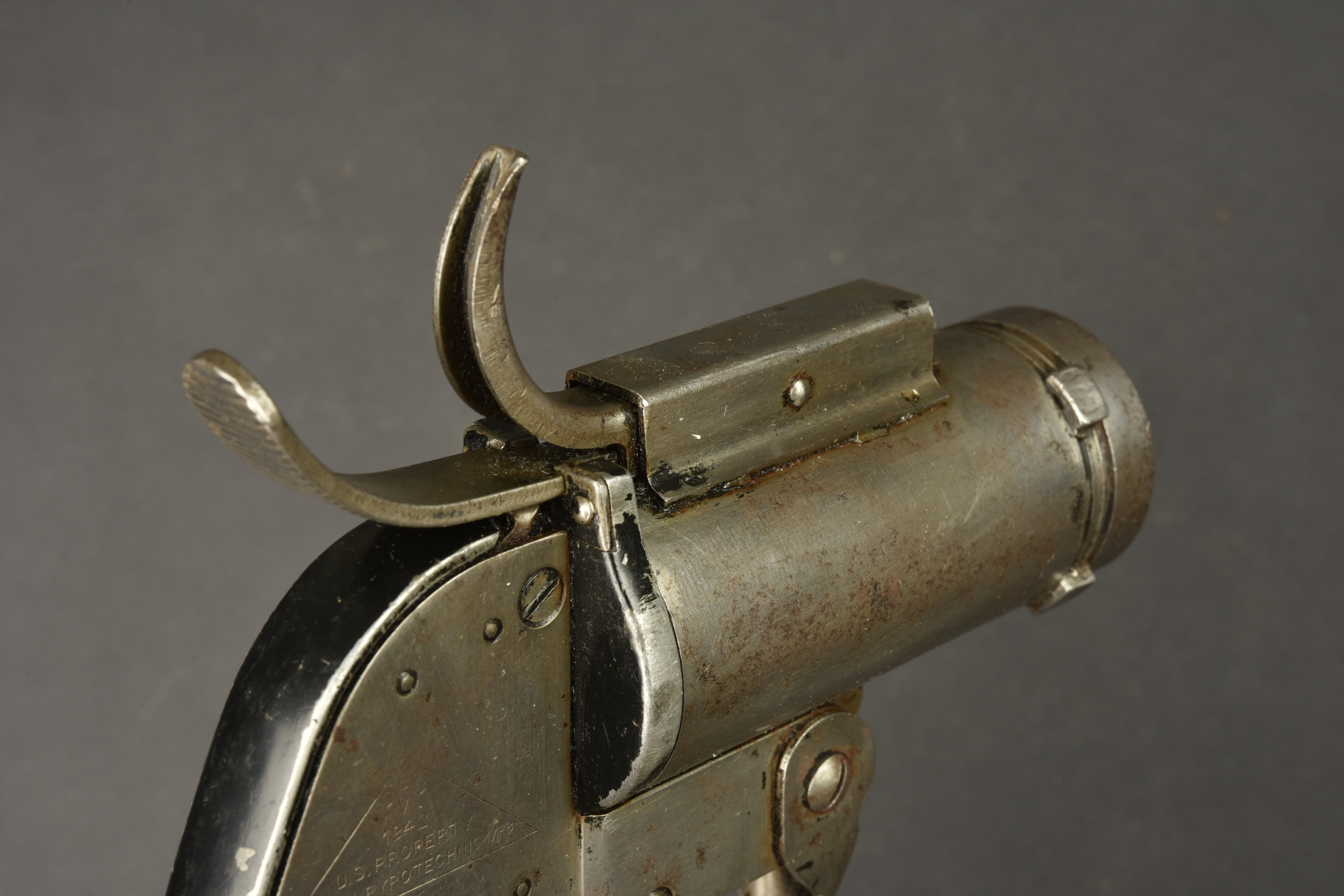 Détails de la vente >Pistolet lance fusée US. En métal, fortement nettoyé. Toutes les pièces mobiles sont fonctionnelles. Plaquettes en bakélite noire. Beau canon lisse. Marquages CEVC 1942 US Property Pistol... en savoir plus
