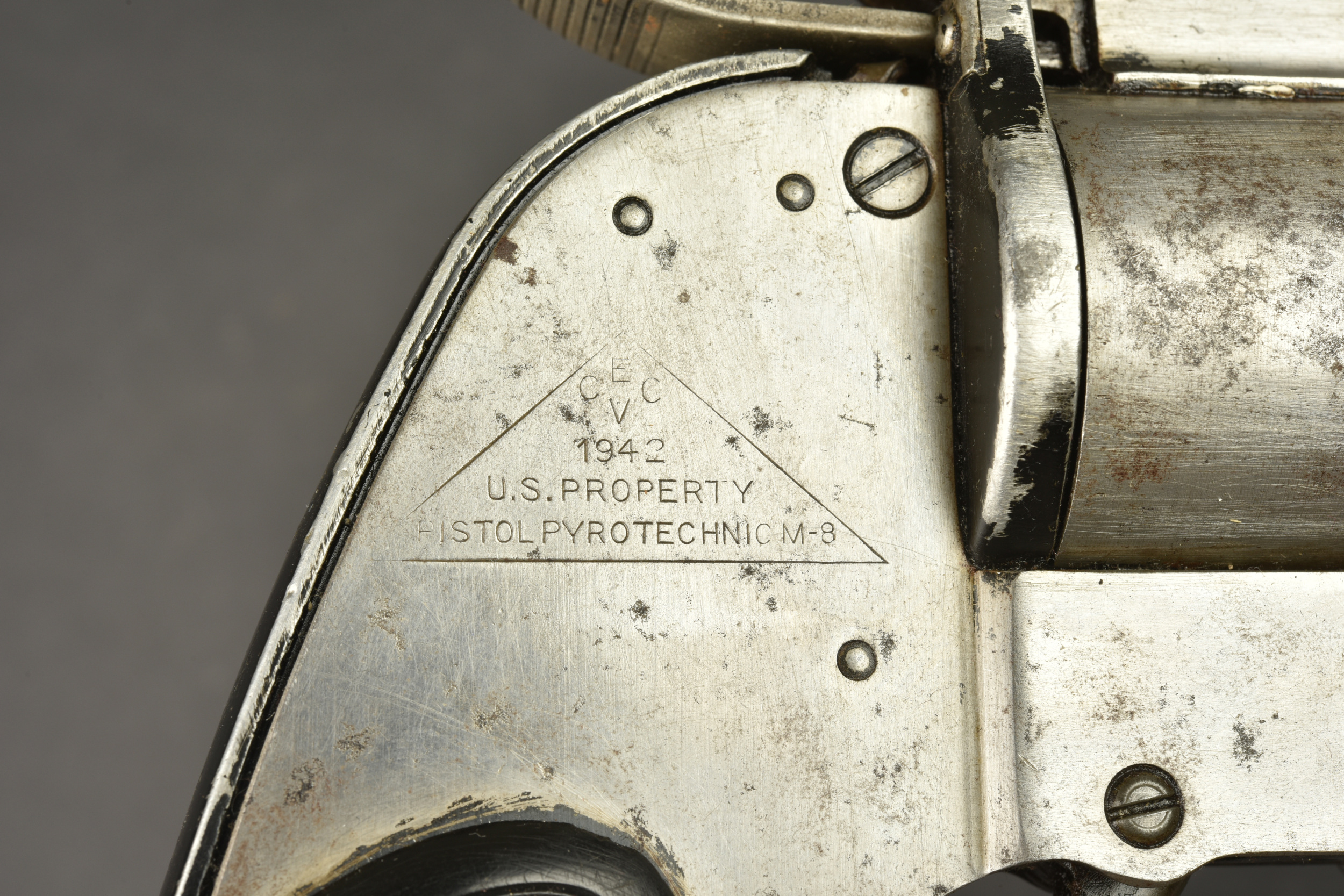 Pistolet lance fusée US. En métal, fortement nettoyé. Toutes les pièces mobiles sont fonctionnelles. Plaquettes en bakélite noire. Beau canon lisse. Marquages CEVC 1942 US Property Pistol Pyrotechnic M-8. A noter une certaine usure et oxydation de la pièce. Etat II+.