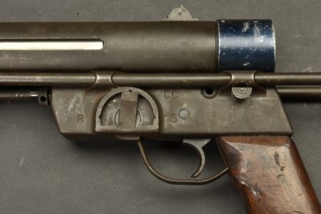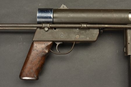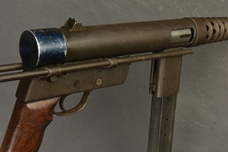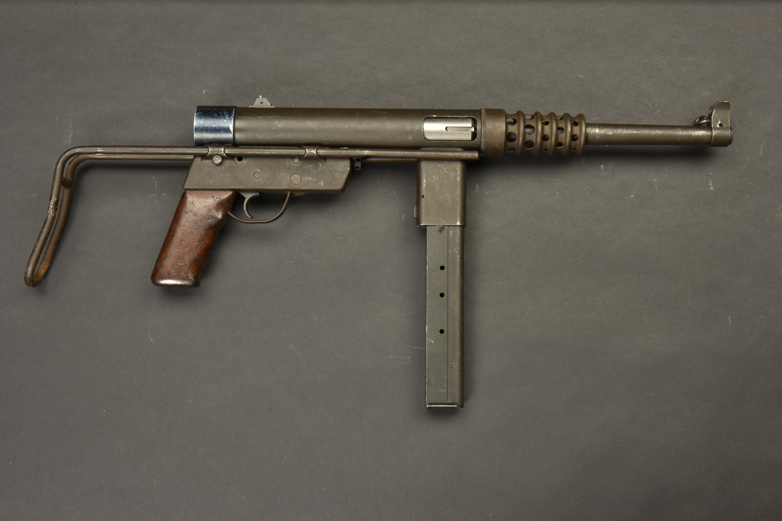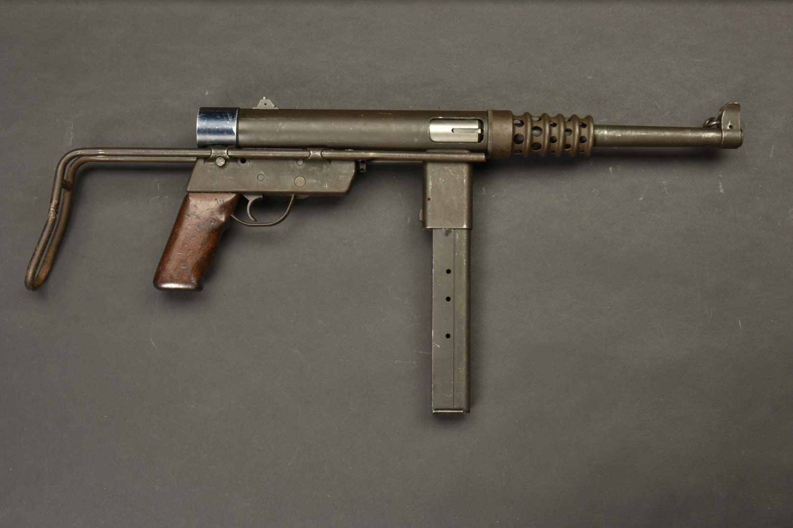 Pistolet mitrailleur Gevarm D4. Tout en métal, crosse pliante présente. Poignée en bois. Chargeur bloqué par la neutralisation. Culasse rendue mobile par une neutralisation +. Numéro 355620. Catégorie C9. Arme neutralisée aux nouvelles normes européenne par le Banc d’épreuve de Saint Etienne. Cette arme doit être déclarée avec Cerfa et certificat médical de moins de 1 mois ou licence de tir tamponnée ou permis de chasse valide (art R312-56). La délivrance de l’arme n’aura lieu qu’après consultation du fichier Finadia. L’inscription de l’acheteur sur ce fichier entrainera automatiquement la nullité de la vente. A noter une certaine usure et patine de la pièce. Etat II+. Utilisé par les unitésparachutistes français avant le PM MAT 49.