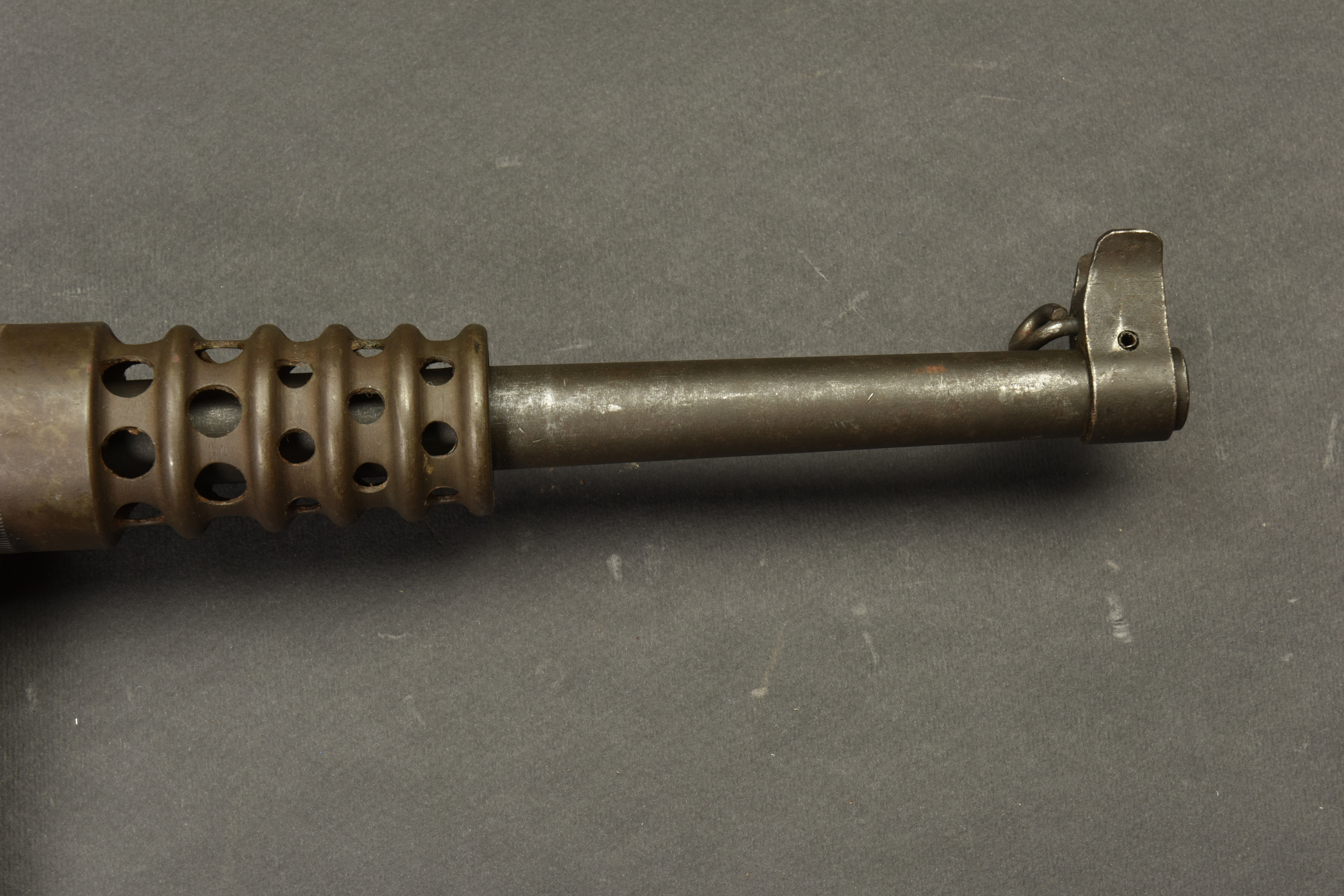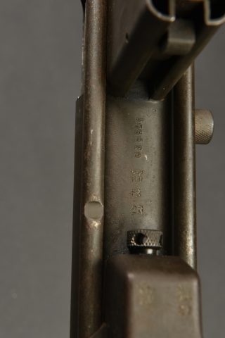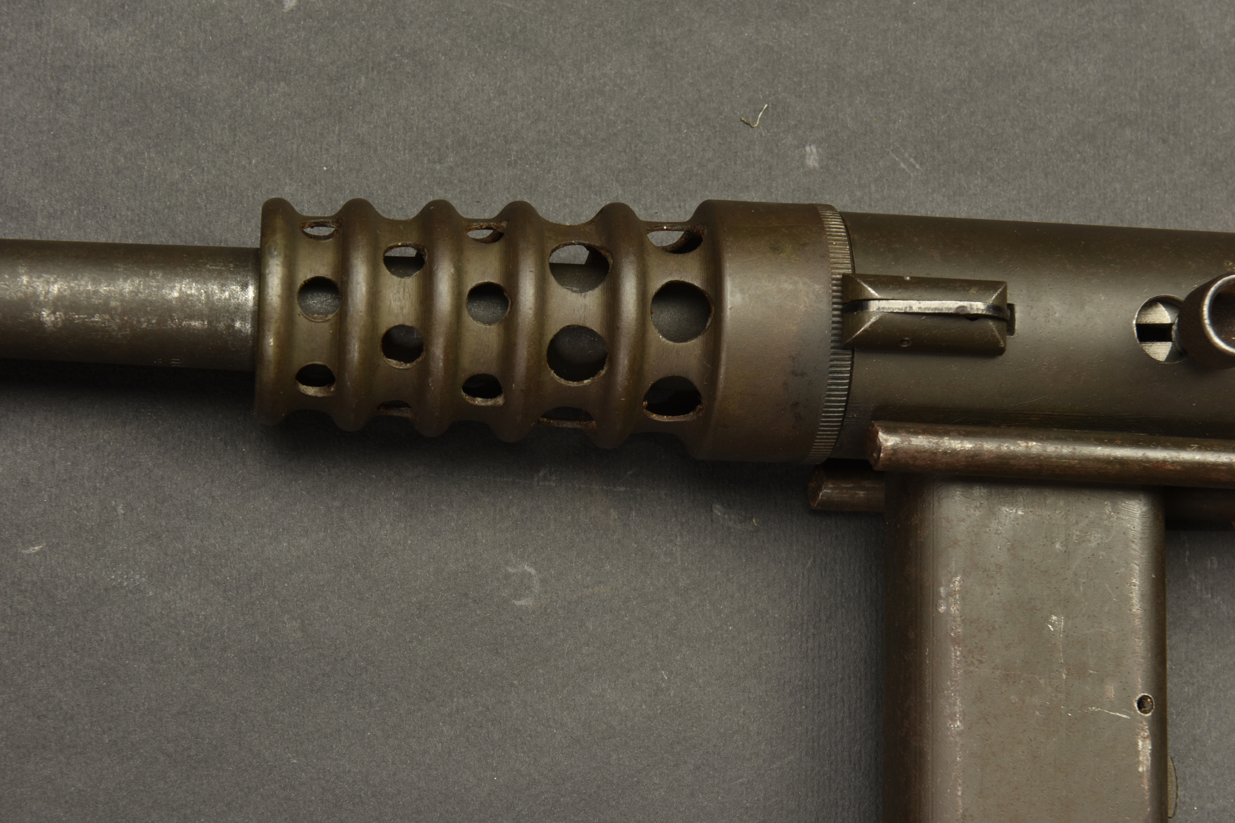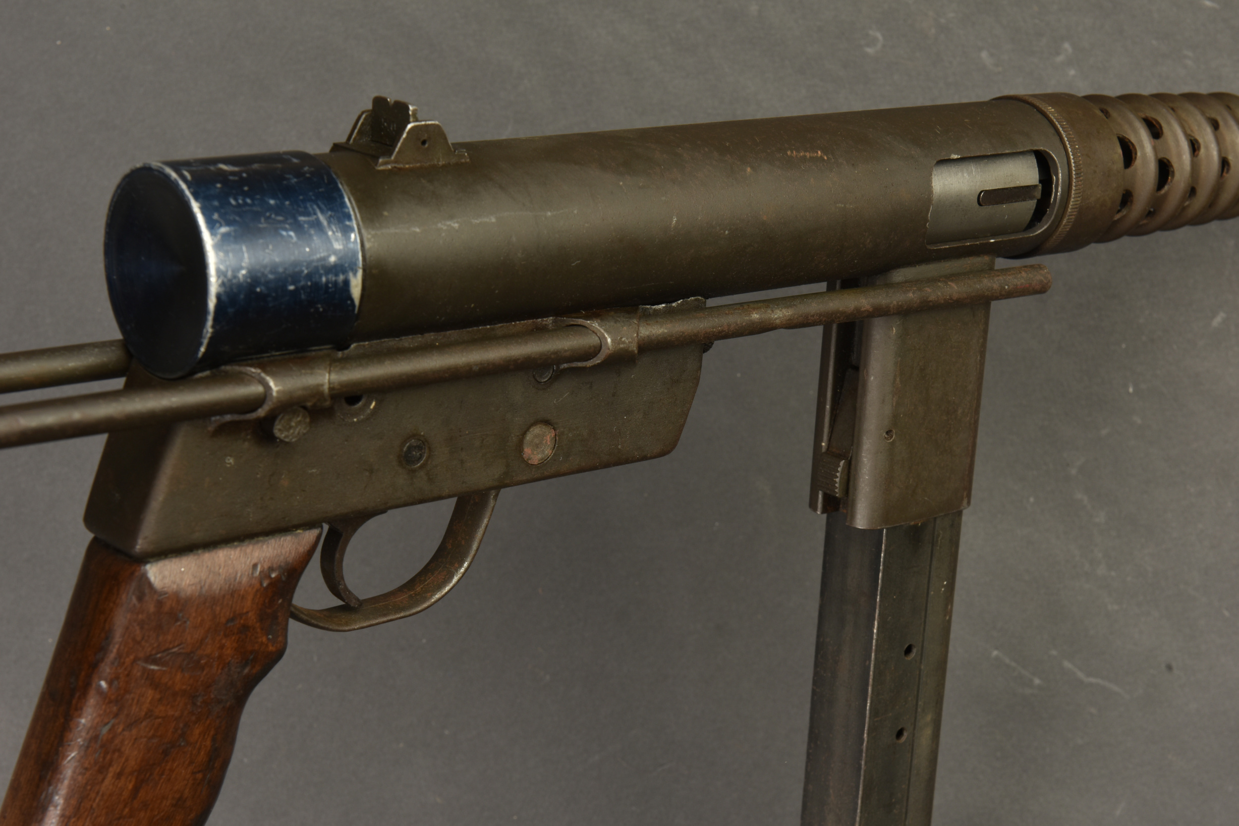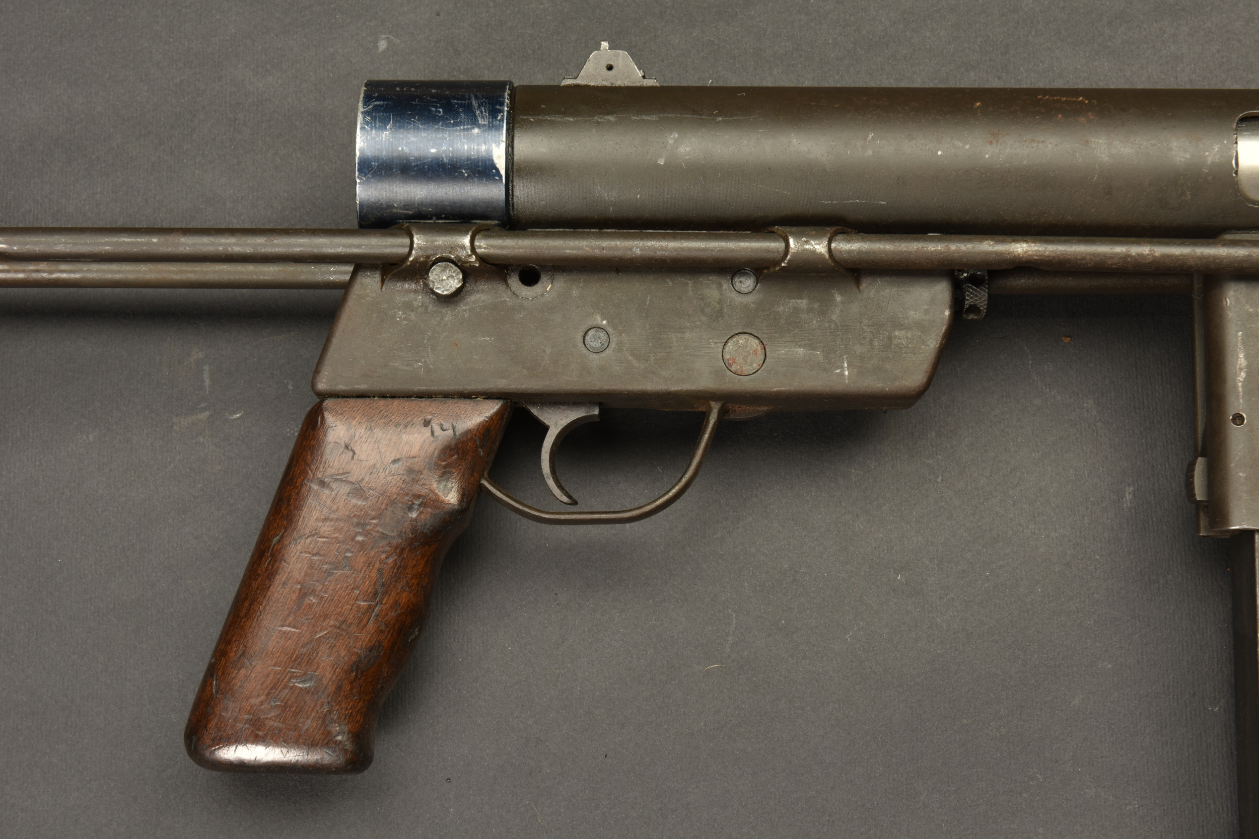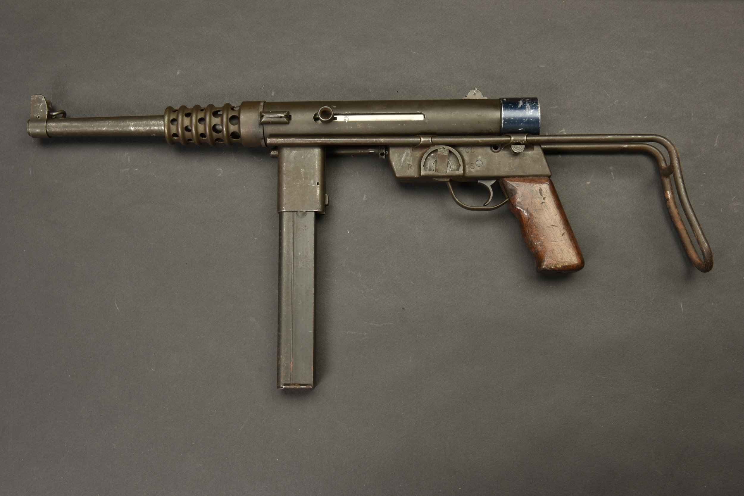 Détails de la vente >Pistolet mitrailleur Gevarm D4. Tout en métal, crosse pliante présente. Poignée en bois. Chargeur bloqué par la neutralisation. Culasse rendue mobile par une neutralisation +. Numéro 355620.... en savoir plus